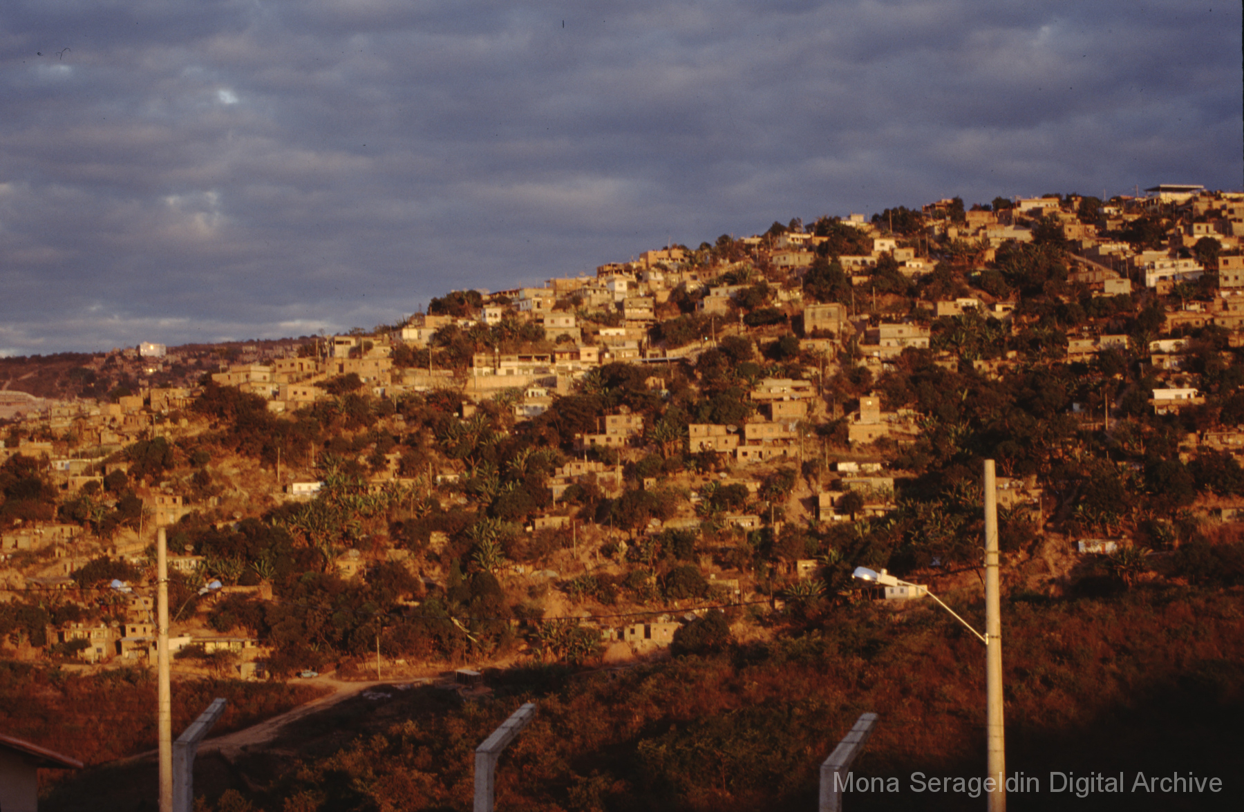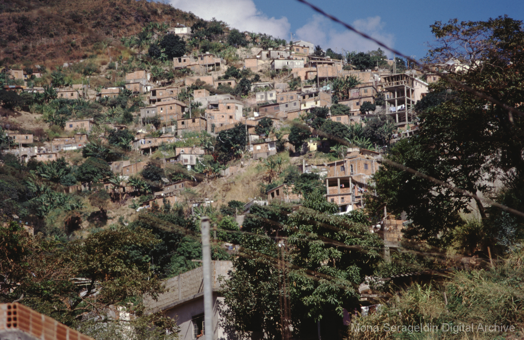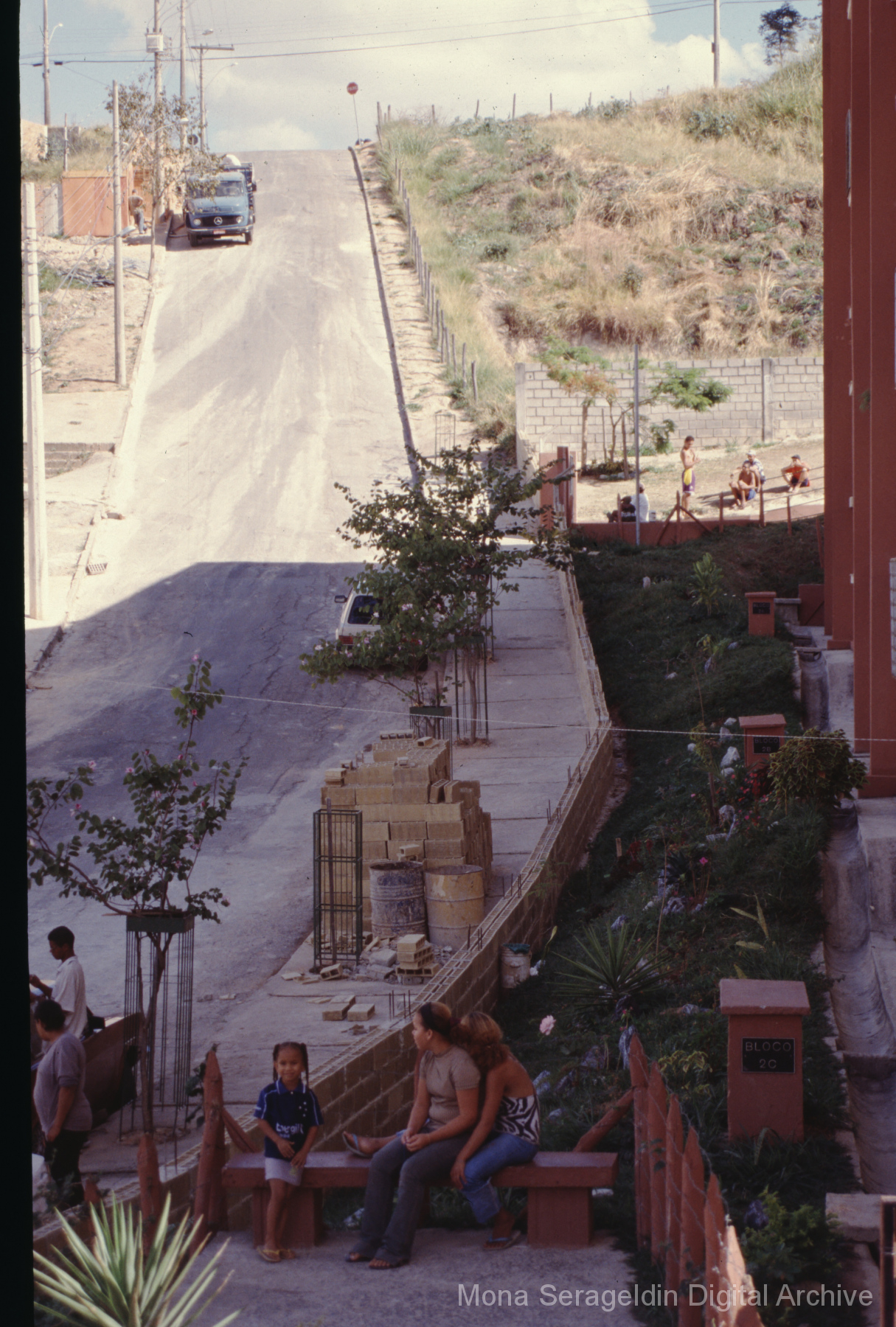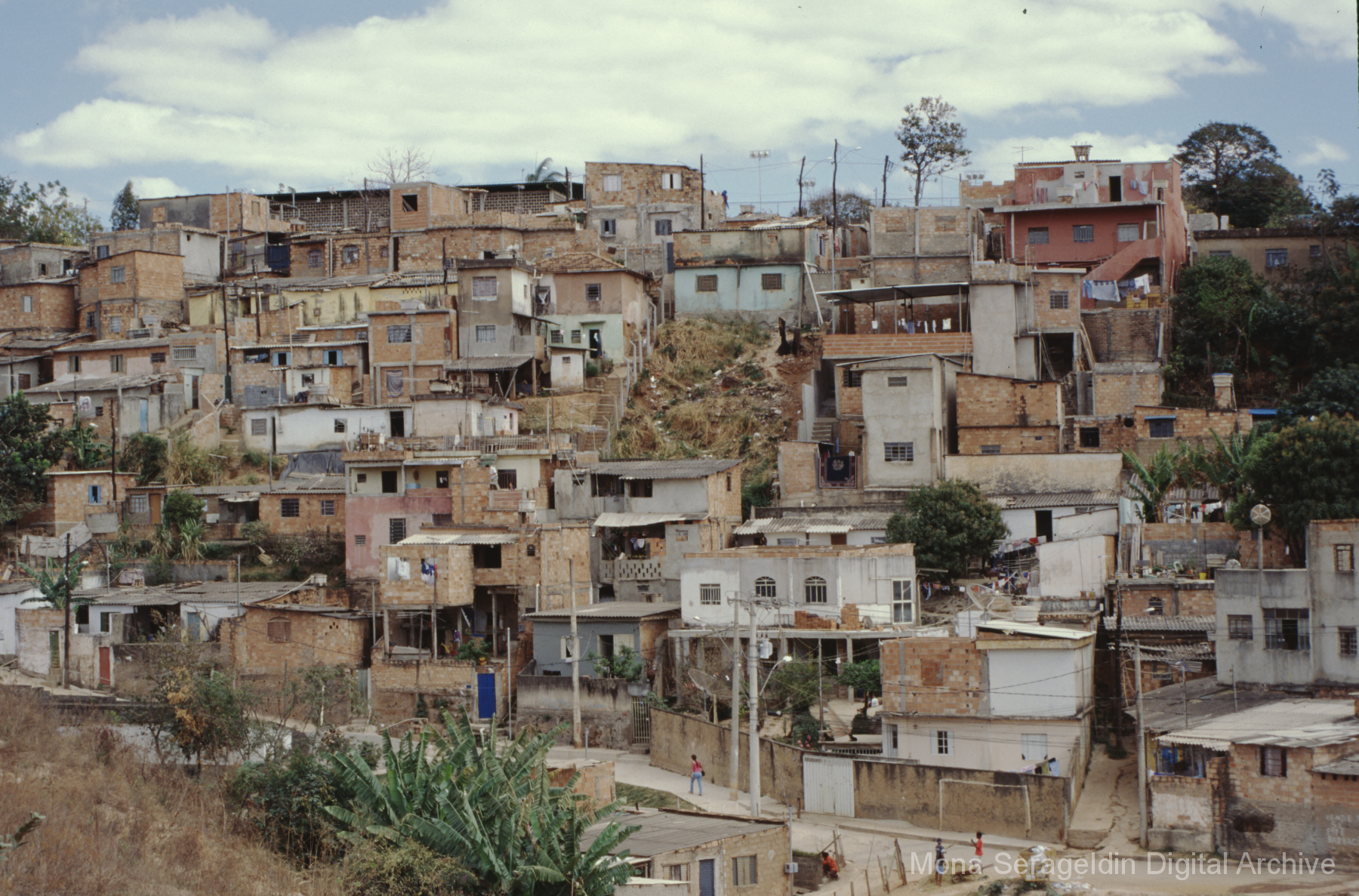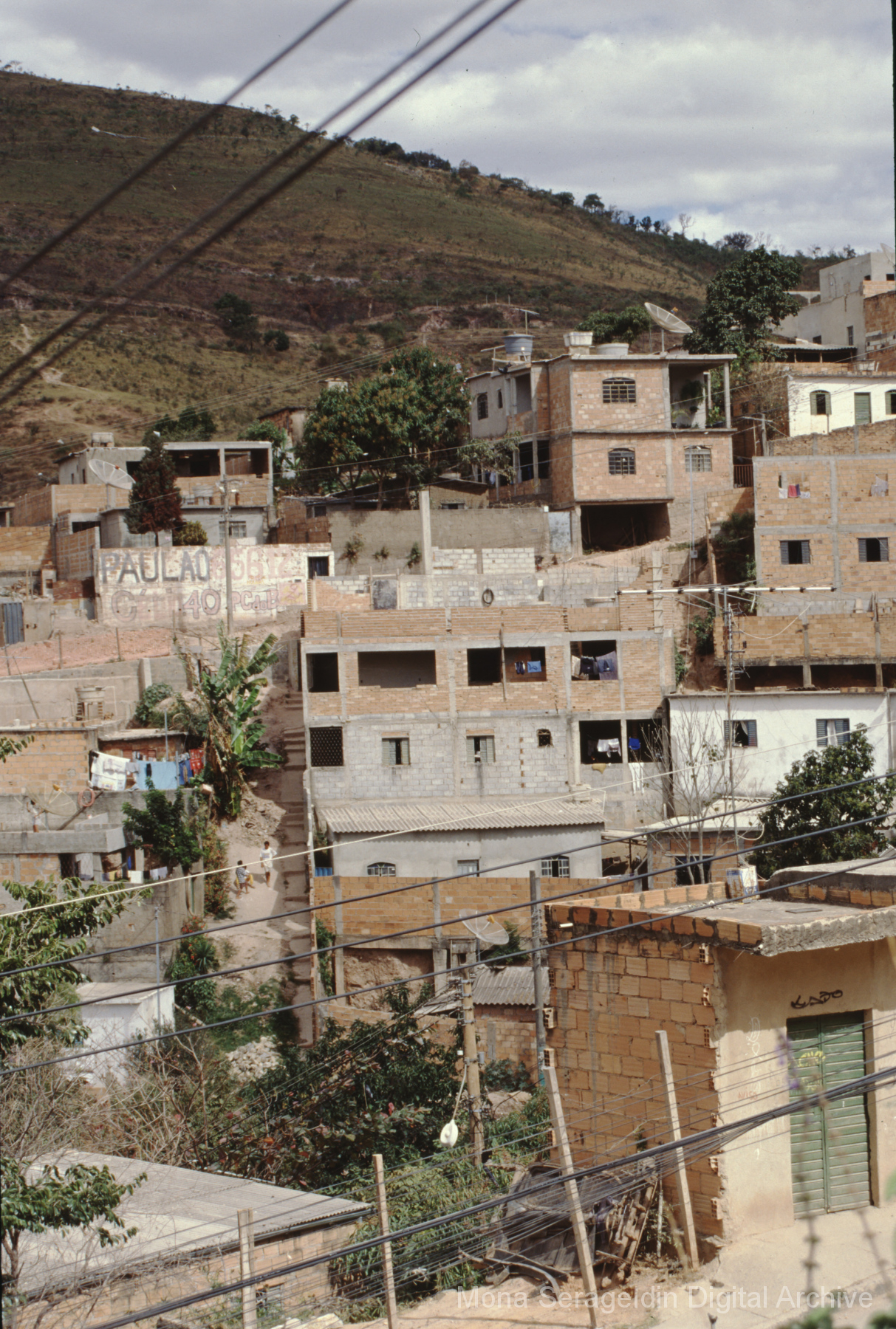 This gallery covers the city of Belo Horizonte in the state of Minas Gerais in southeast Brazil from 2001. Photographs document general views of the city, favelas (informal settlements) on the urban periphery, housing projects, and a Mutirão housing update (collective effort of a community coming together to complete a project). It also shows an MSC meeting for housing organizing (Movimento dos Sem Casas). Views include portraits of community members, housing overviews and interiors, and housing construction.