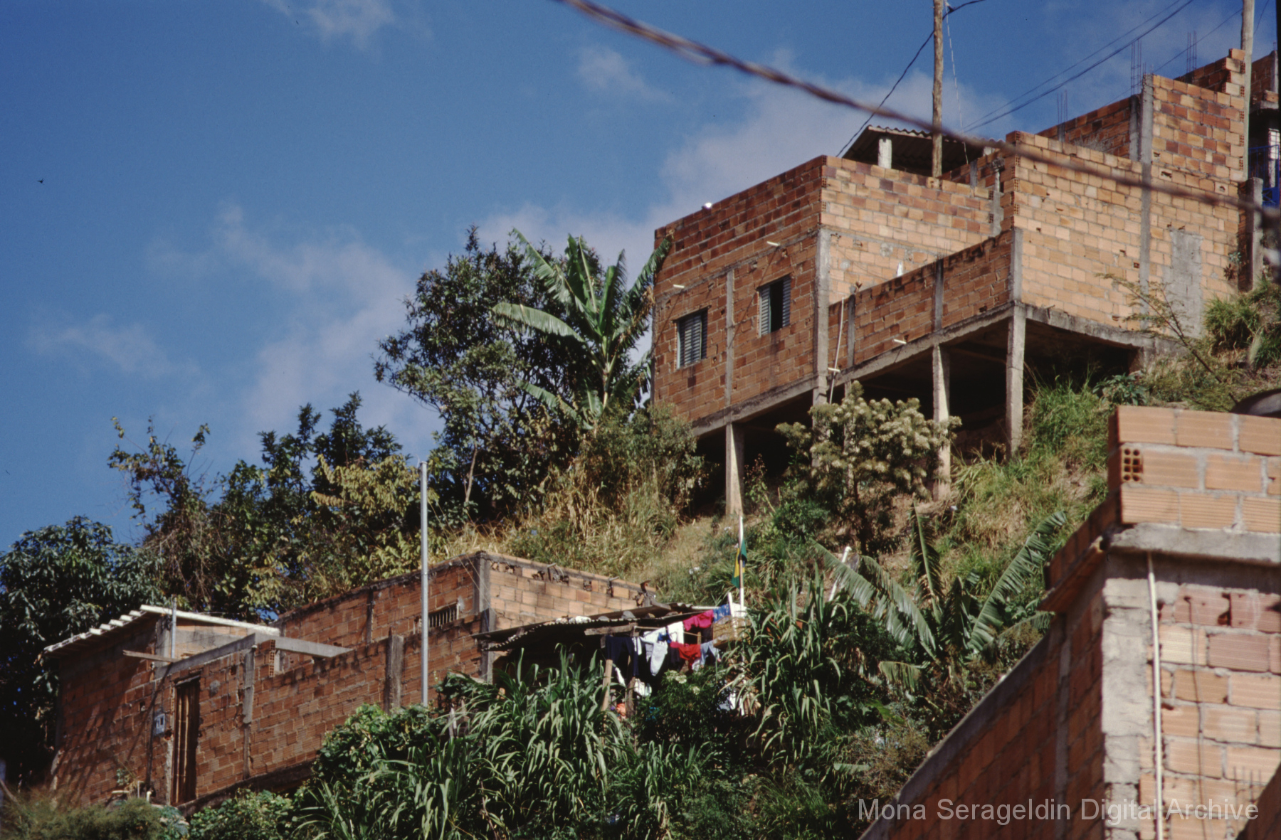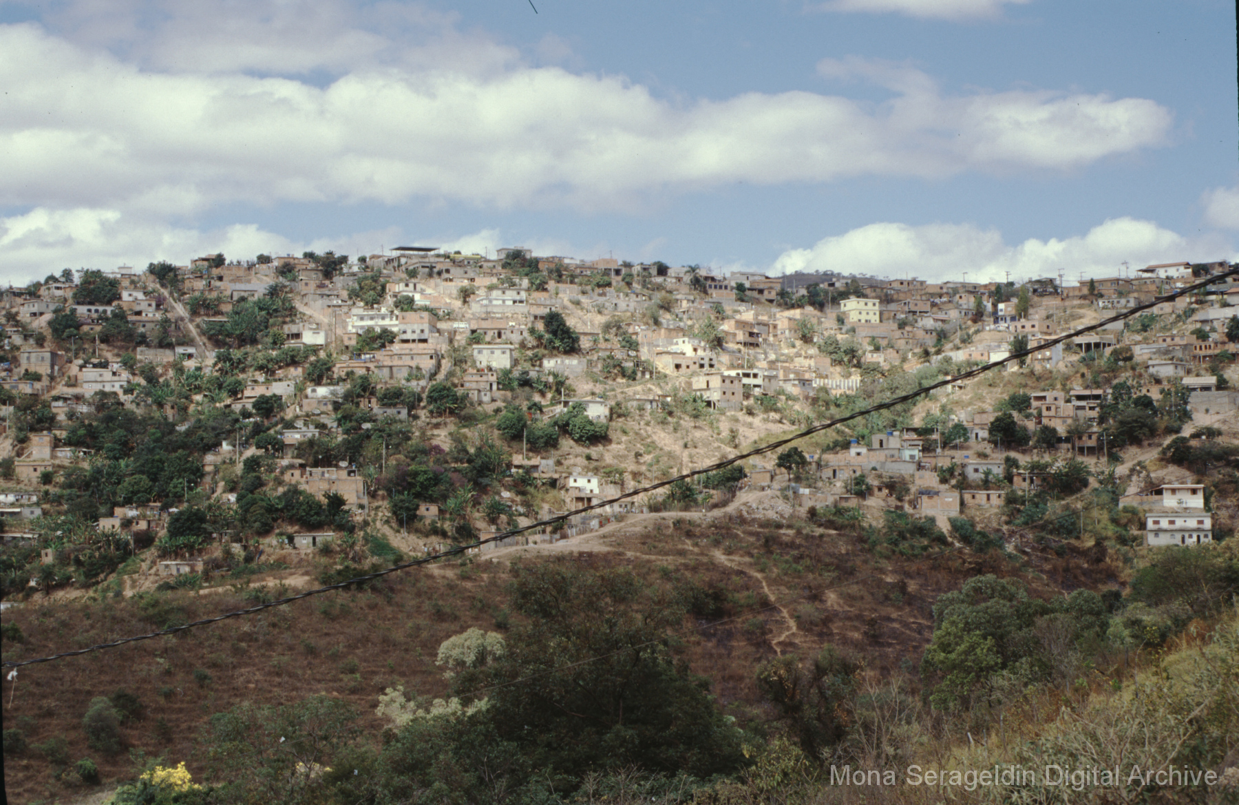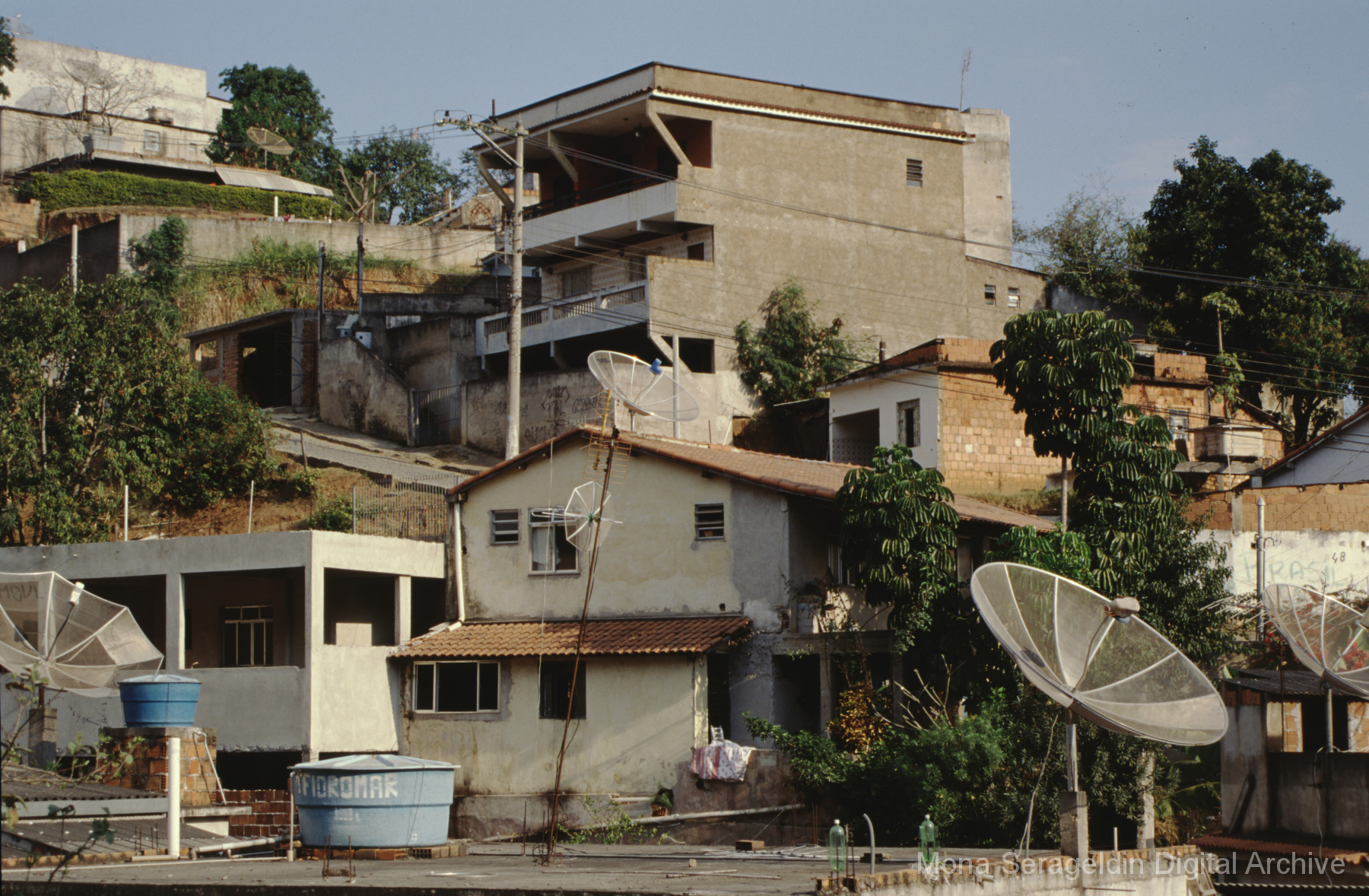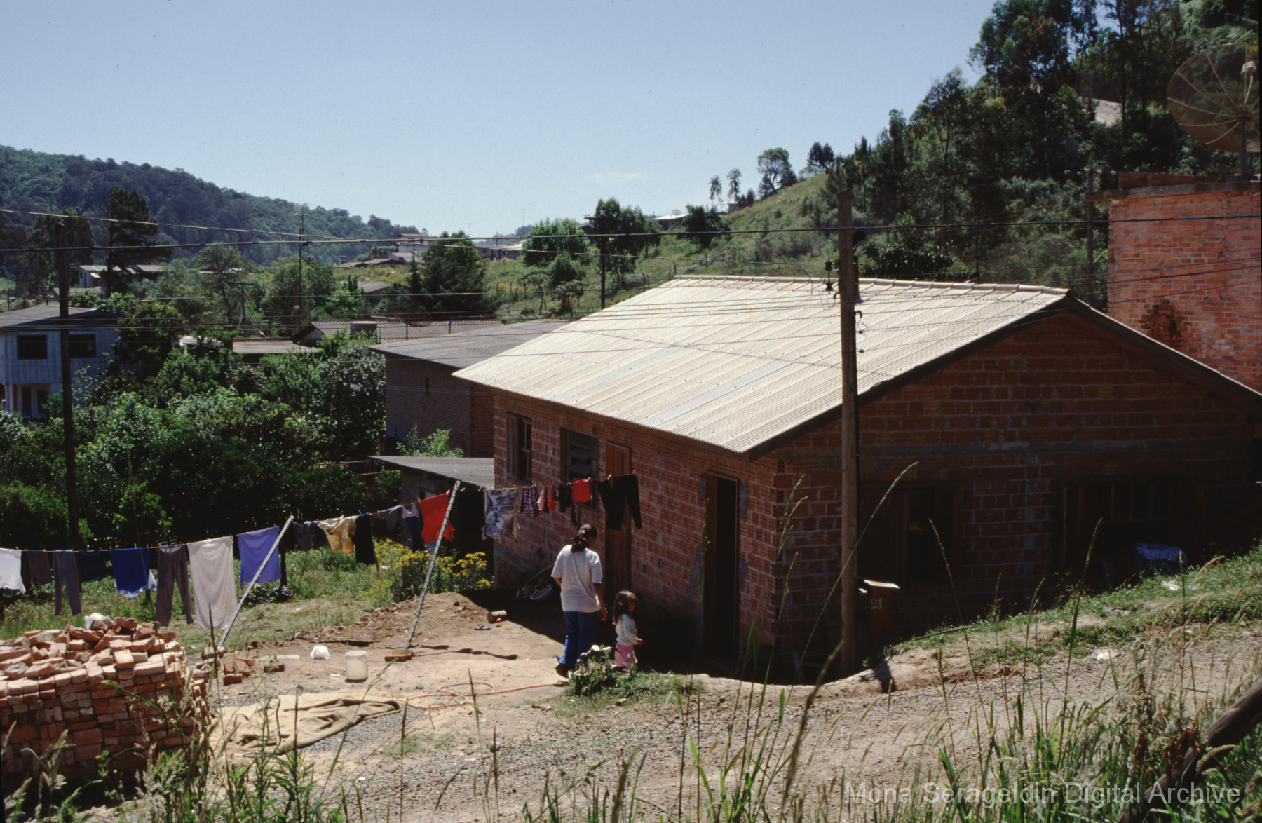 This gallery covers the city of Belo Horizonte in the state of Minas Gerais in southeast Brazil from 2001. Photographs document general views of the city, favelas (informal settlements) on the urban periphery, housing projects, and a Mutirão housing update (collective effort of a community coming together to complete a project). It also shows an MSC meeting for housing organizing (Movimento dos Sem Casas). Views include portraits of community members, housing overviews and interiors, and housing construction.