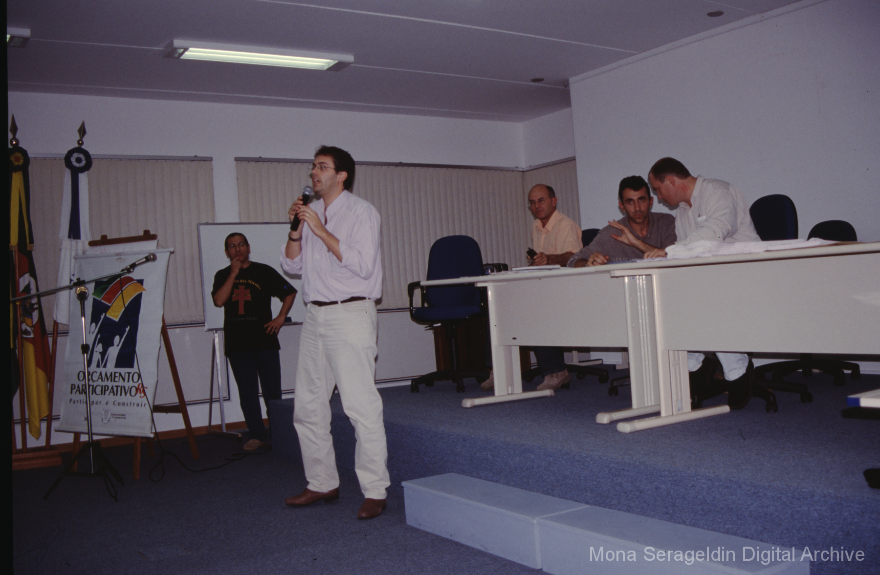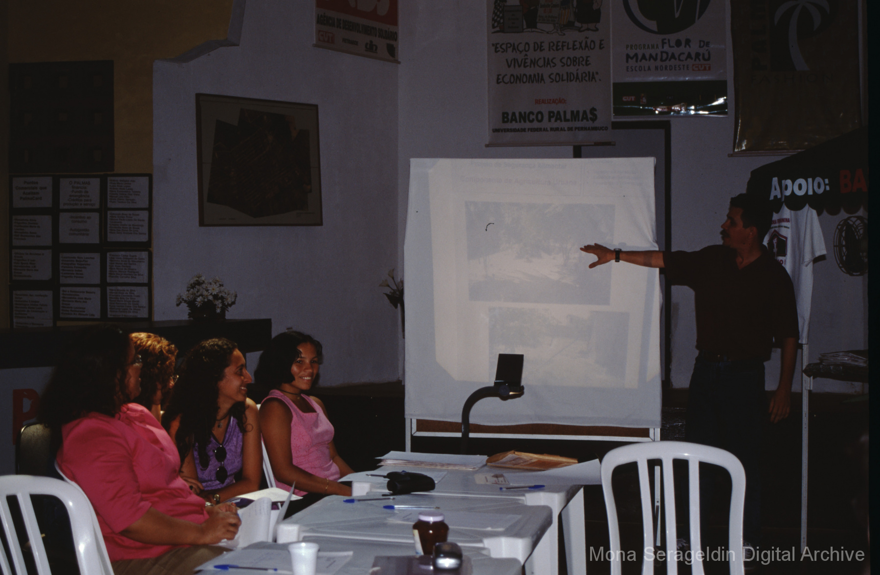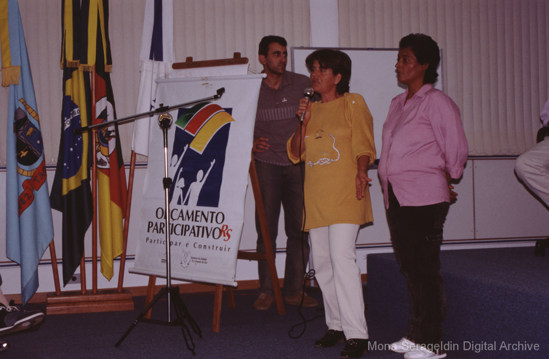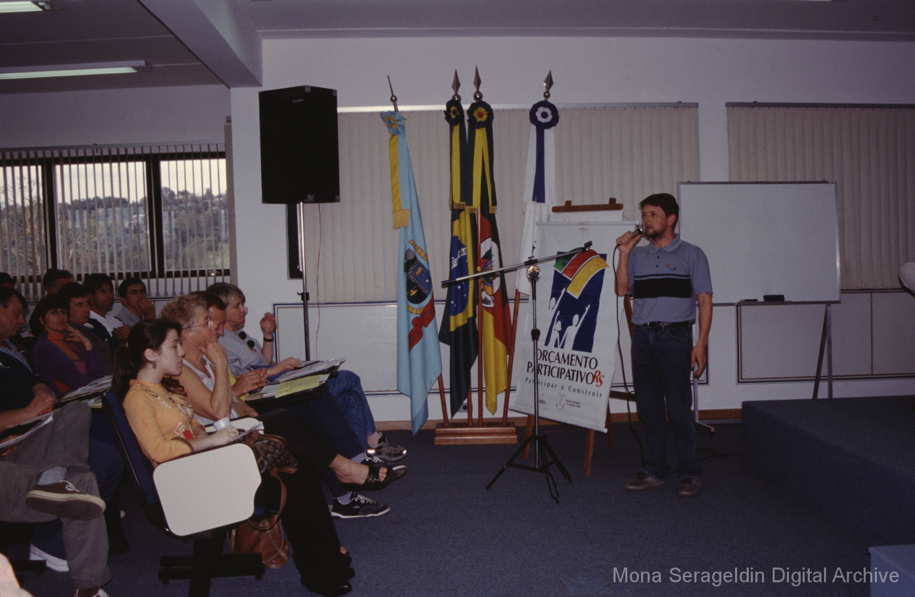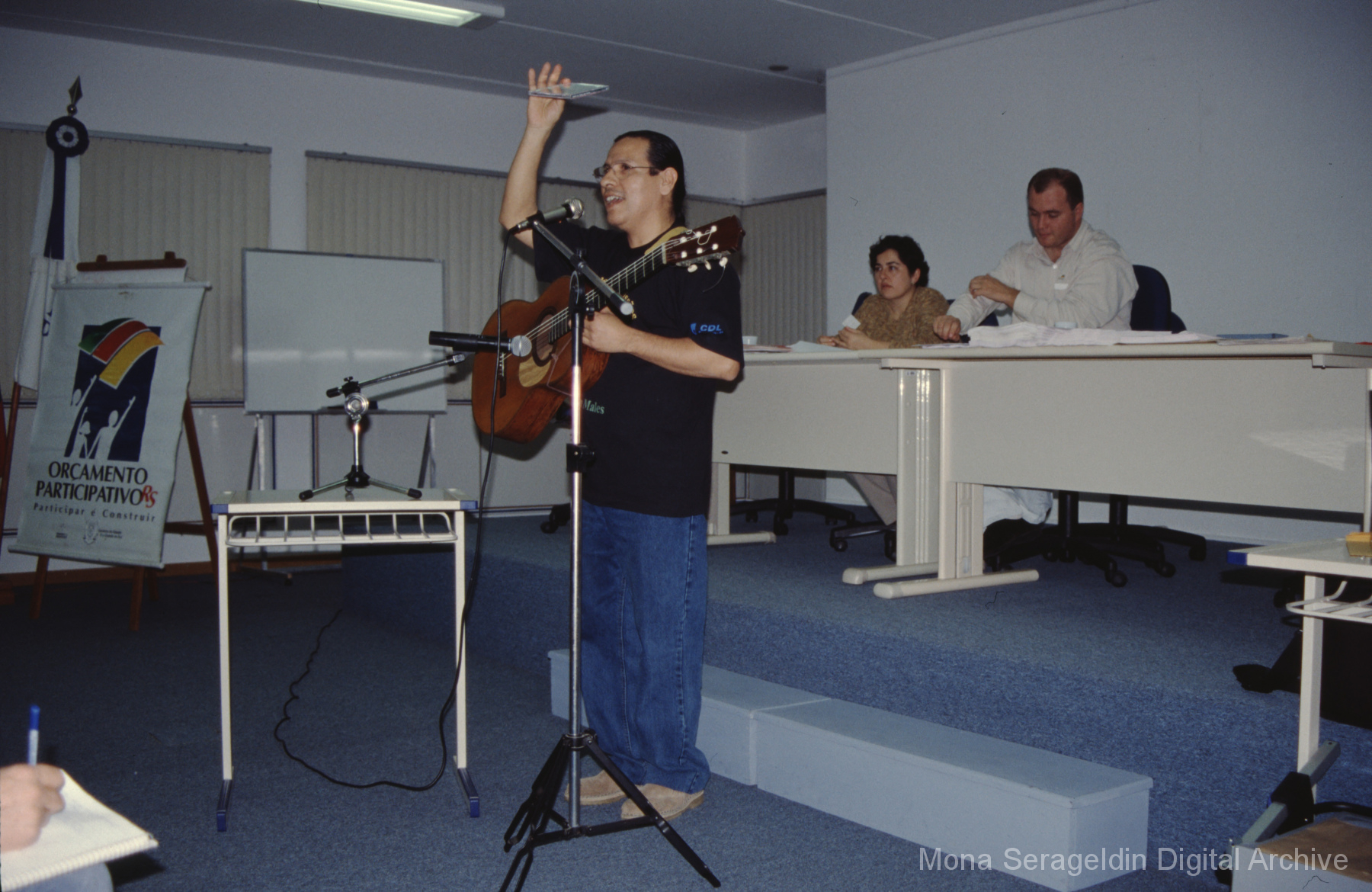 This gallery contains photographs of a participatory budgeting forum “Orçamento Participativo: Participar é Construir” for the municipality of Taquara, in the state of Rio Grande do Sul in southern Brazil, from around 2001. Views include meeting participants, presenters and presentation slides, and musicians, as well as landscape views of fields. Mona Serageldin is pictured.