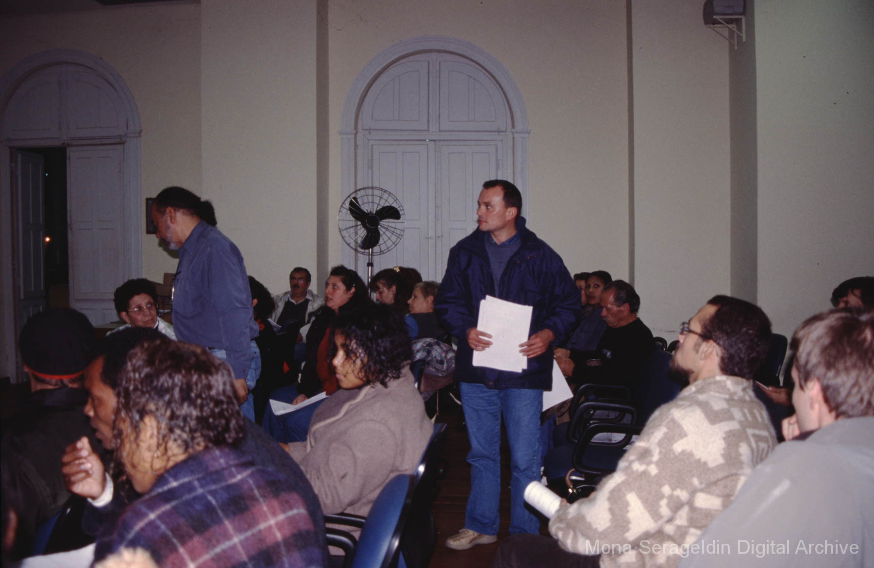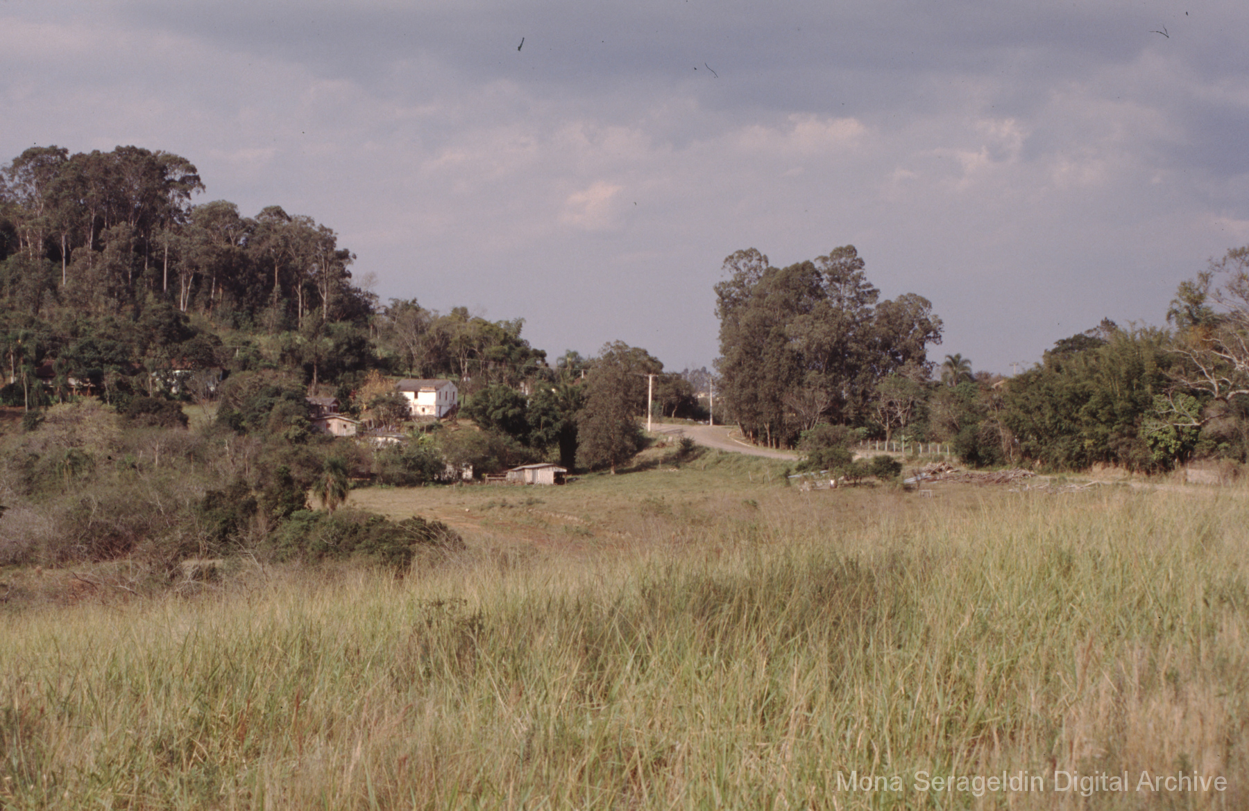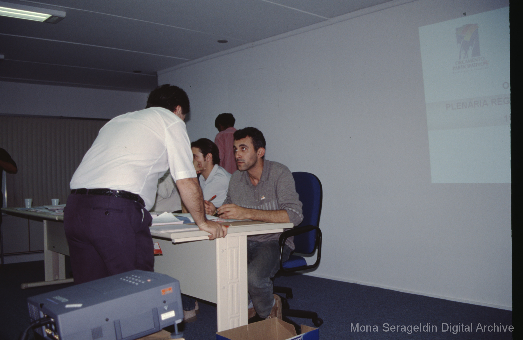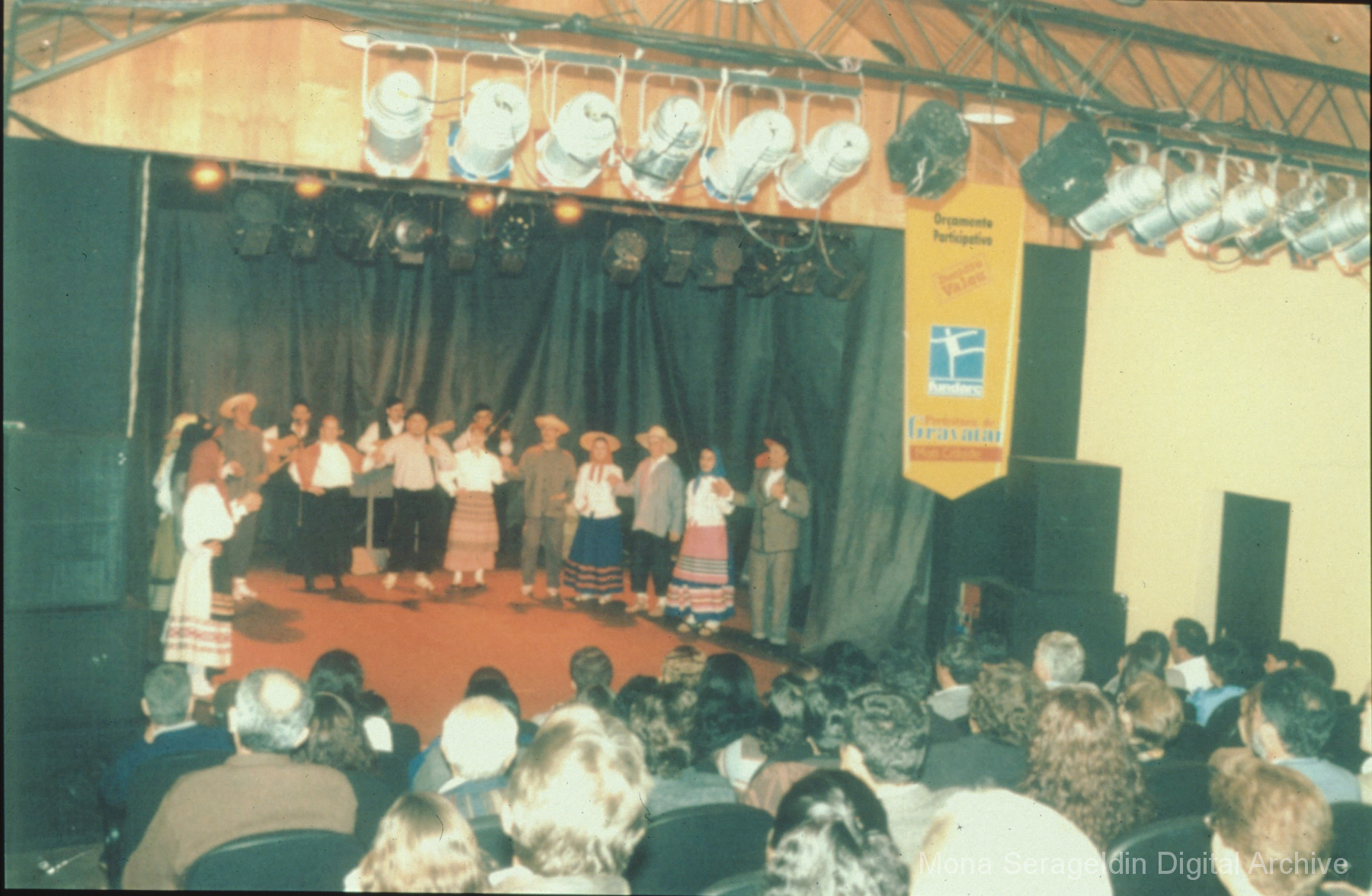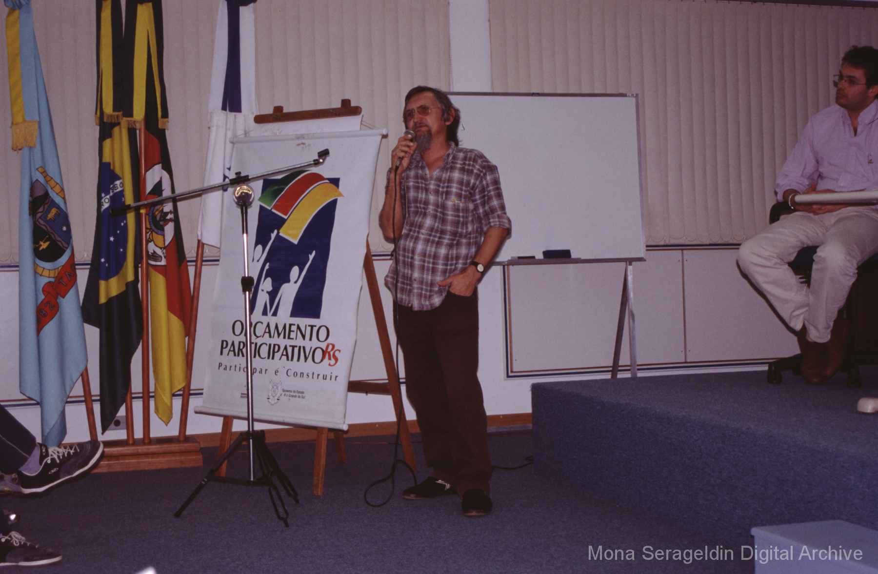 This gallery contains photographs of a participatory budgeting forum “Orçamento Participativo: Participar é Construir” for the municipality of Taquara, in the state of Rio Grande do Sul in southern Brazil, from around 2001. Views include meeting participants, presenters and presentation slides, and musicians, as well as landscape views of fields. Mona Serageldin is pictured.