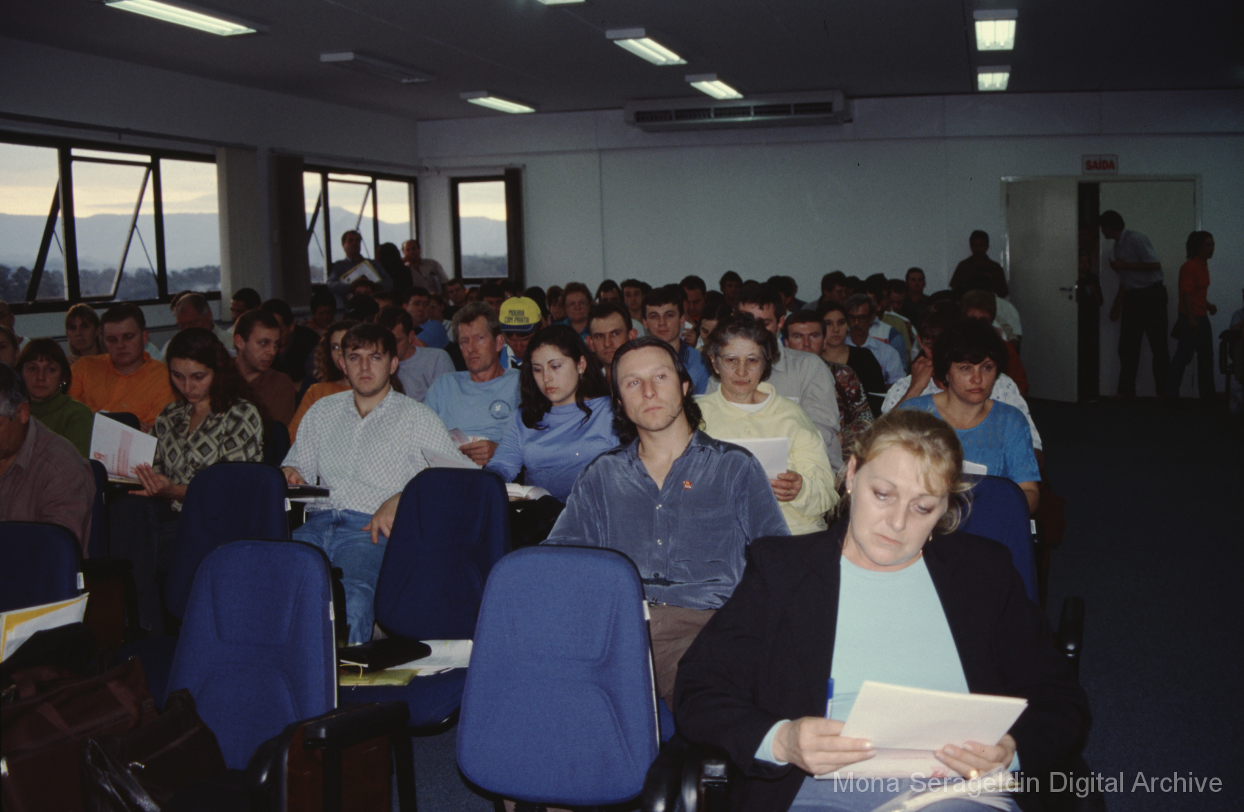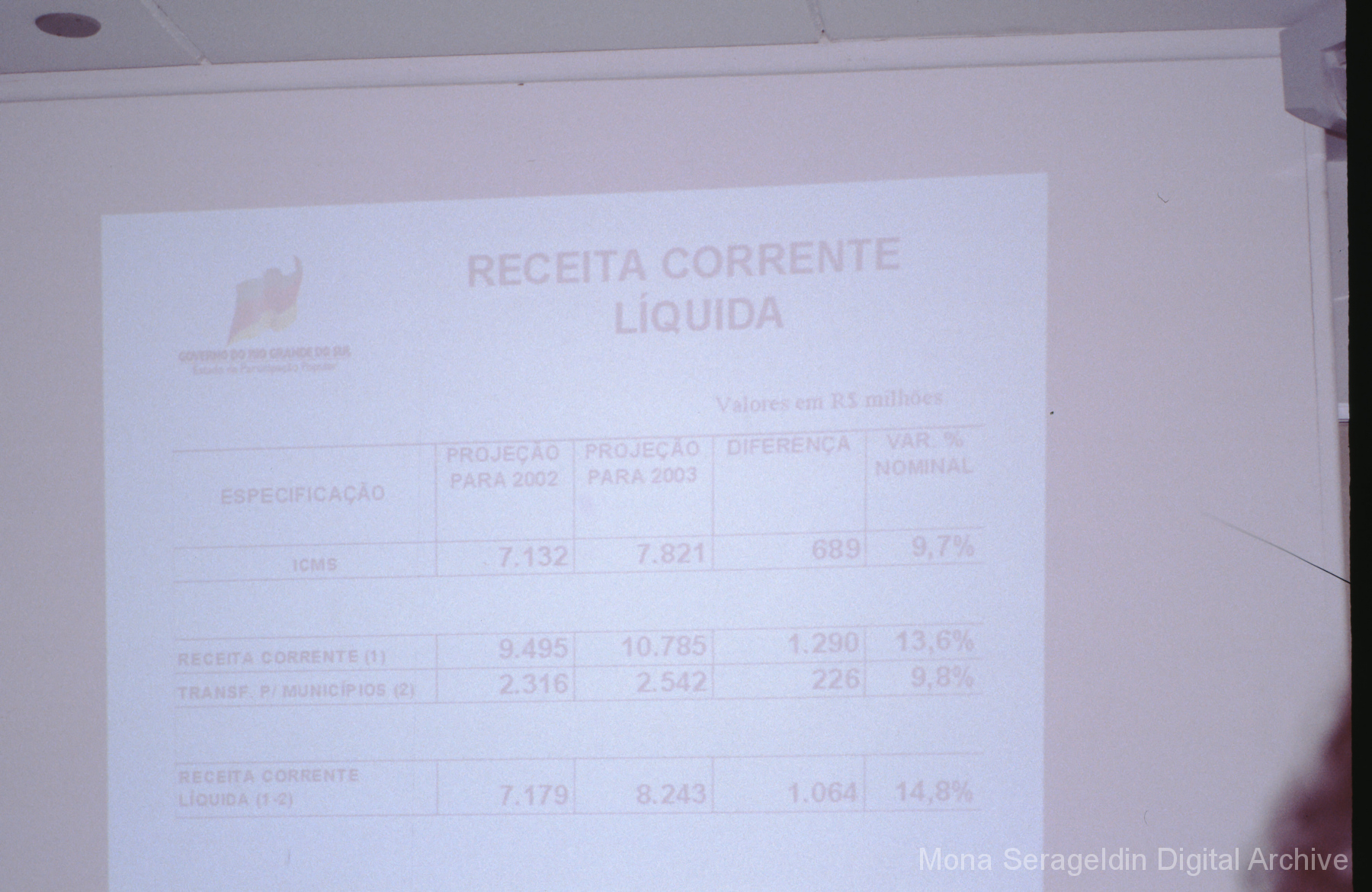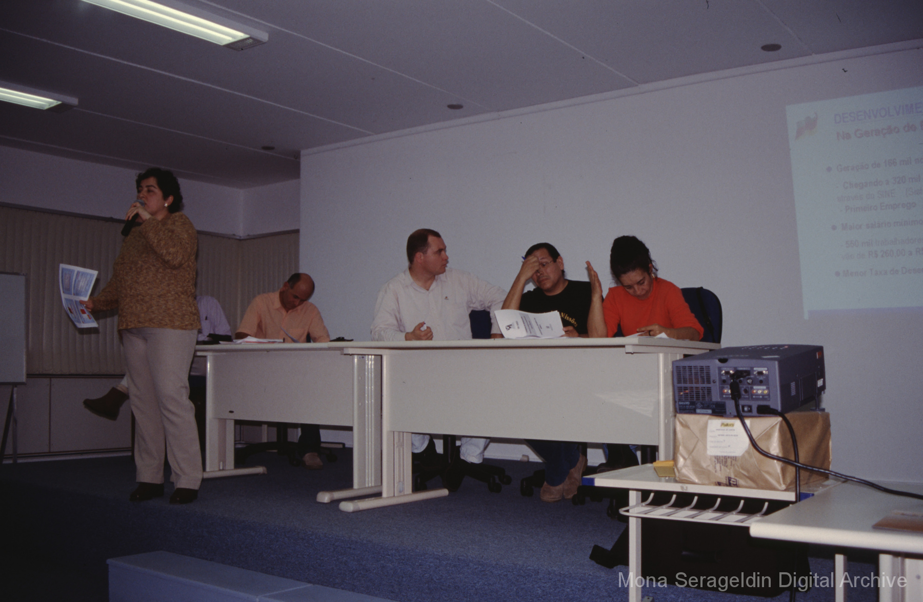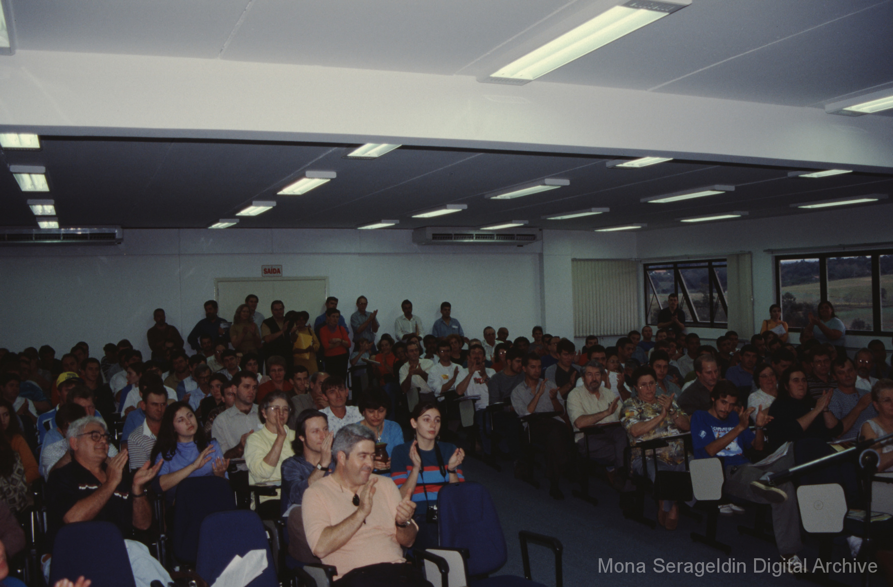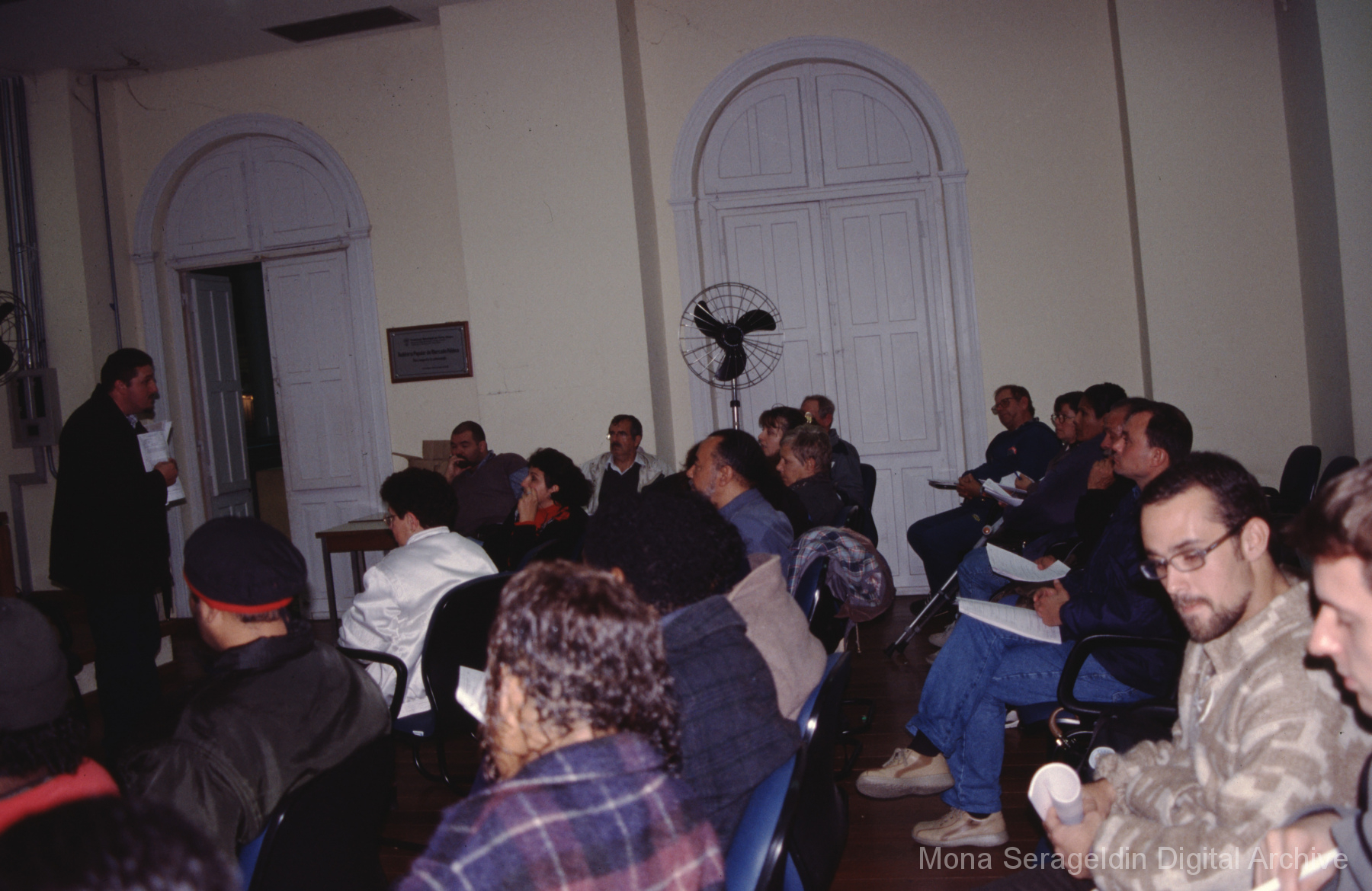 This gallery contains photographs of a participatory budgeting forum “Orçamento Participativo: Participar é Construir” for the municipality of Taquara, in the state of Rio Grande do Sul in southern Brazil, from around 2001. Views include meeting participants, presenters and presentation slides, and musicians, as well as landscape views of fields. Mona Serageldin is pictured.