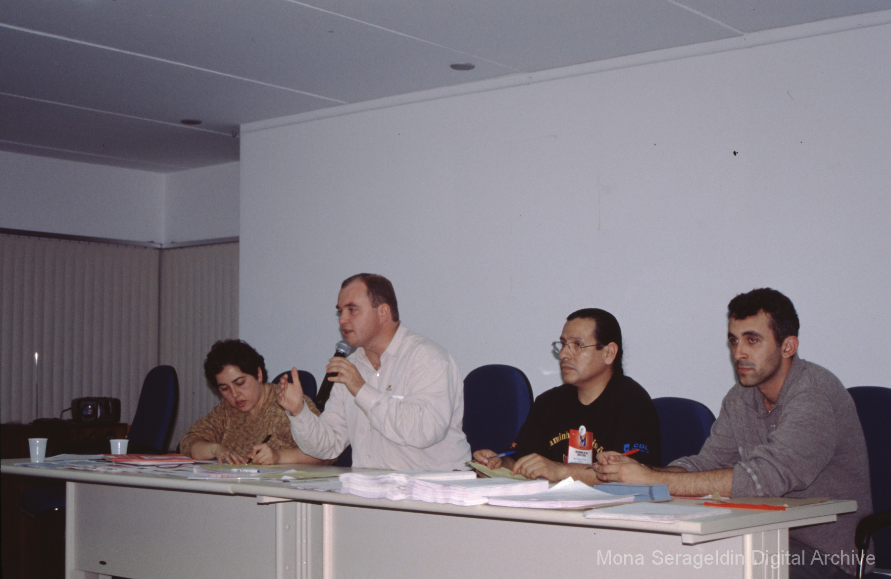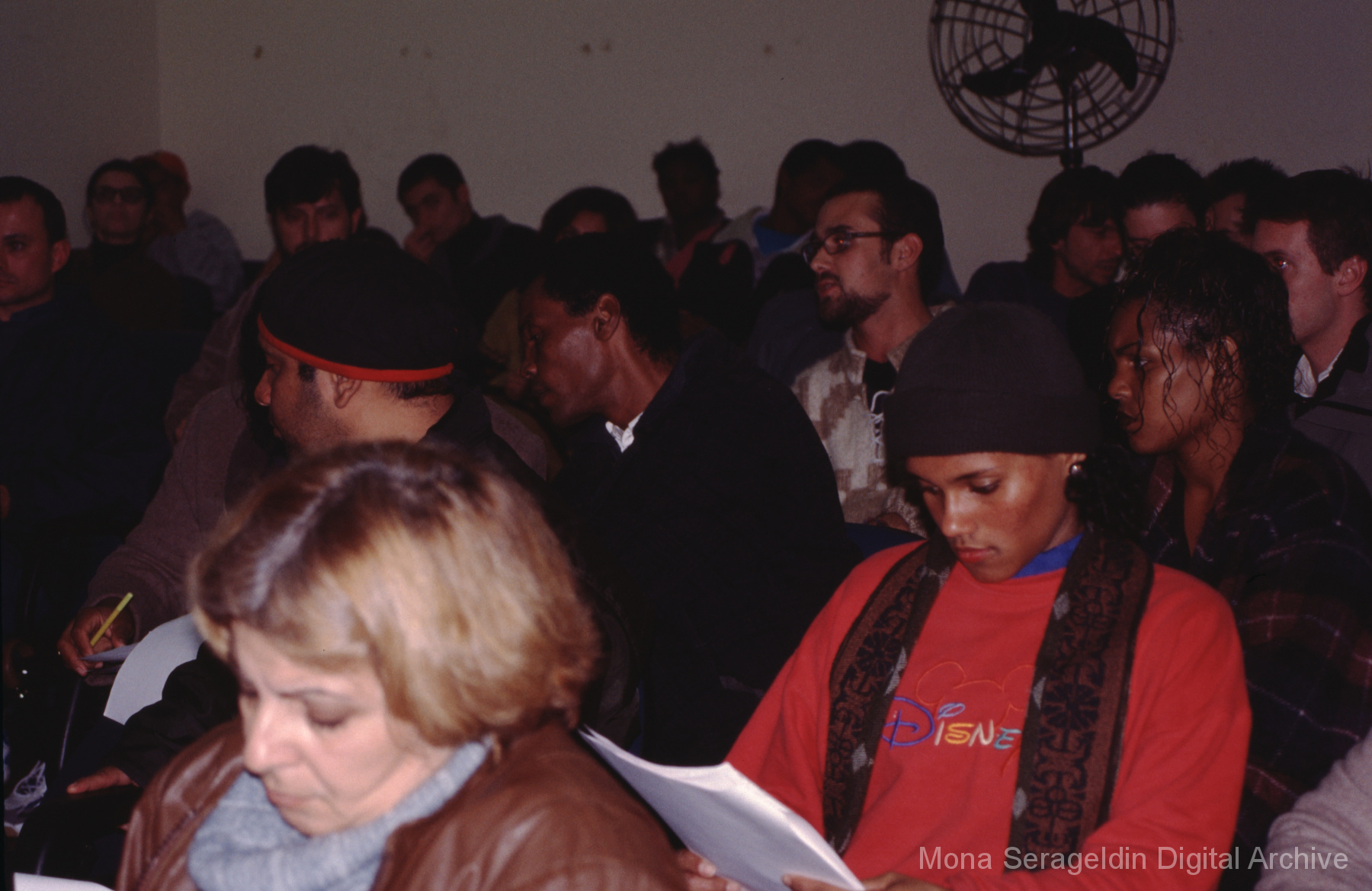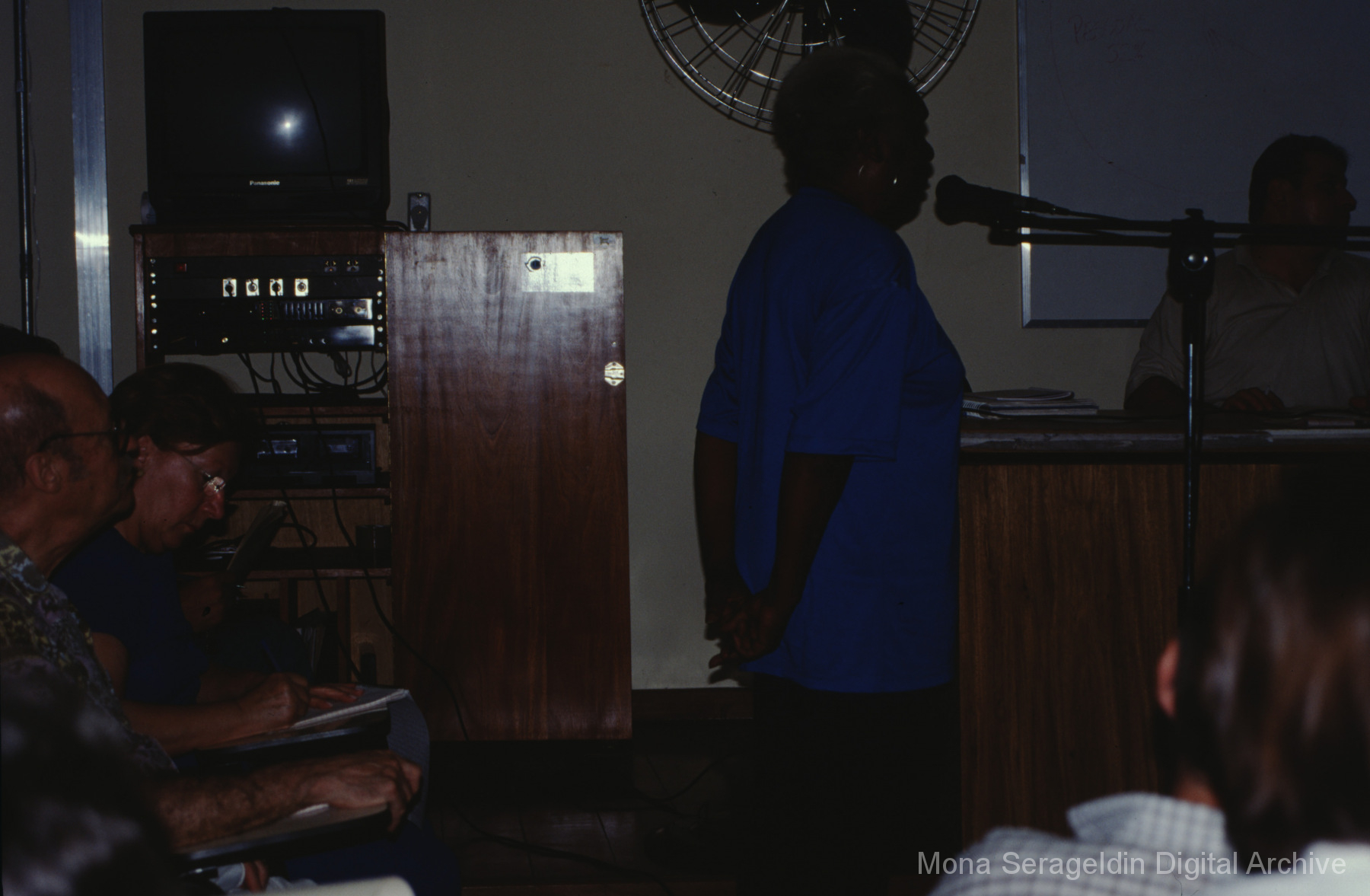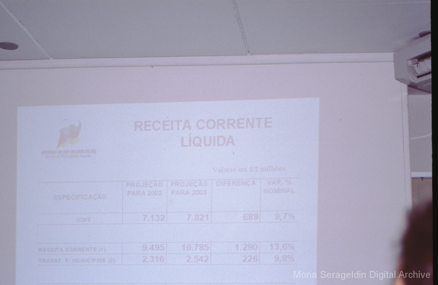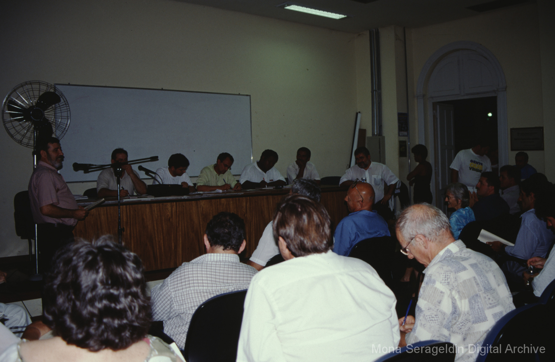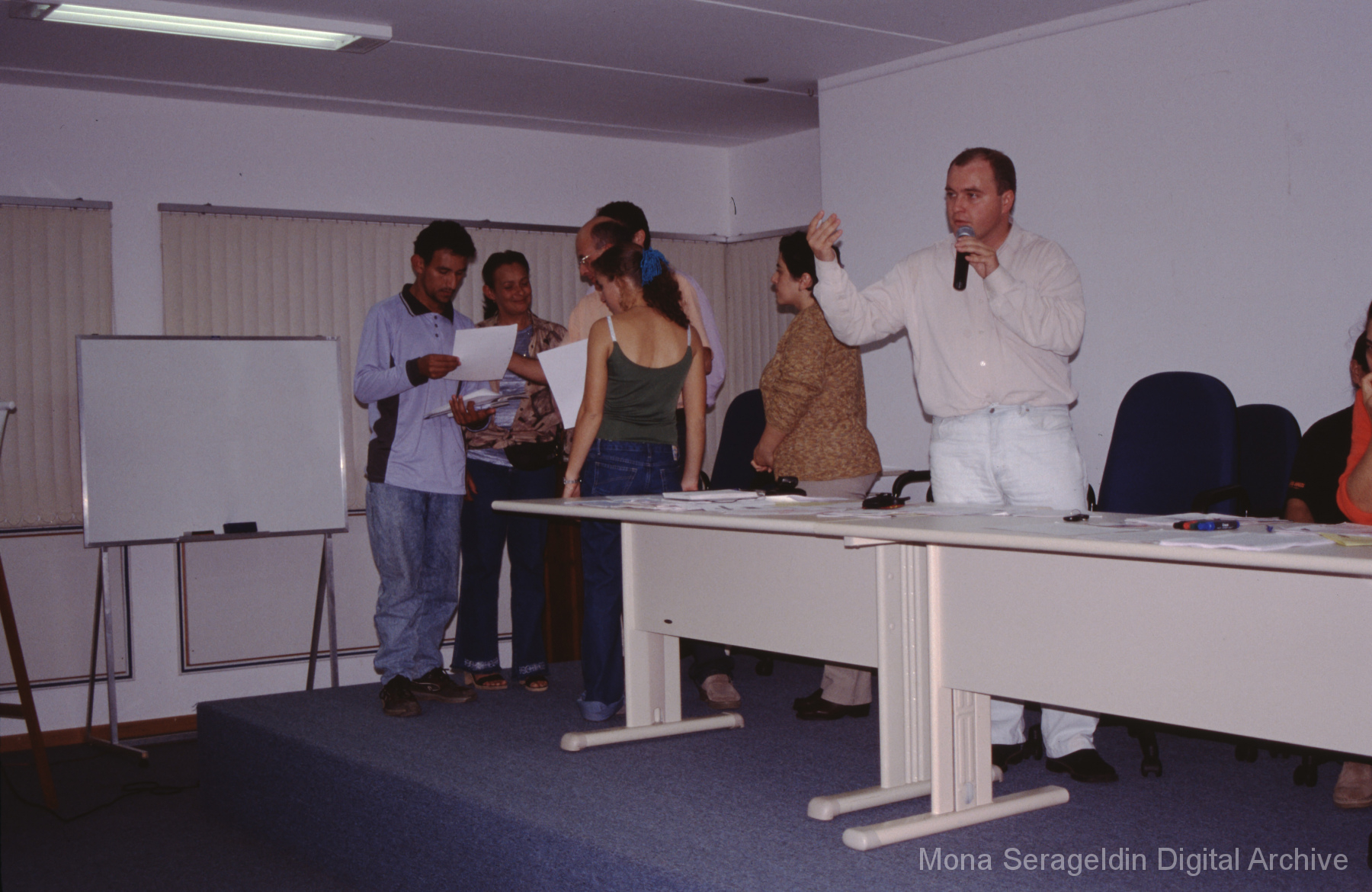 This gallery contains photographs of a participatory budgeting forum “Orçamento Participativo: Participar é Construir” for the municipality of Taquara, in the state of Rio Grande do Sul in southern Brazil, from around 2001. Views include meeting participants, presenters and presentation slides, and musicians, as well as landscape views of fields. Mona Serageldin is pictured.