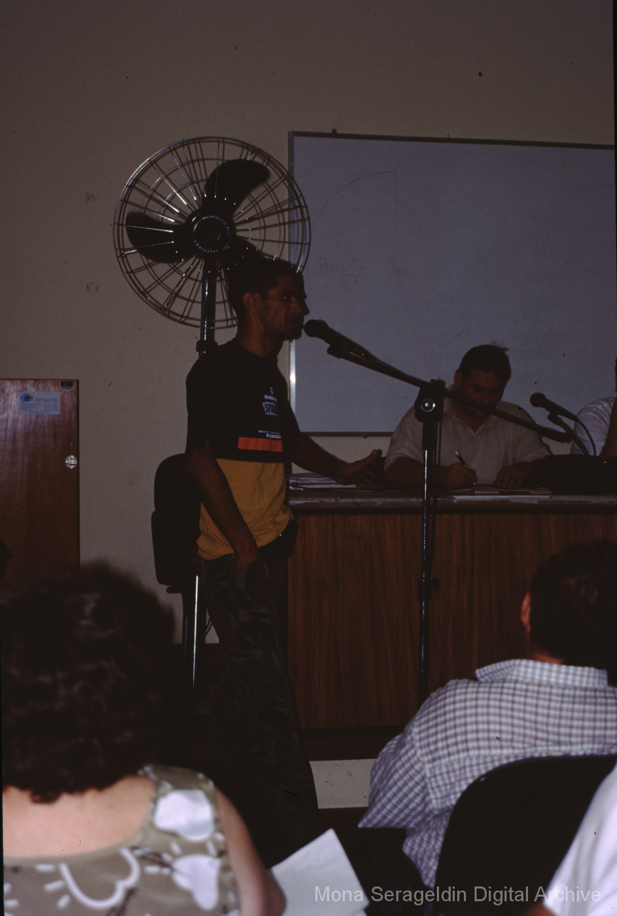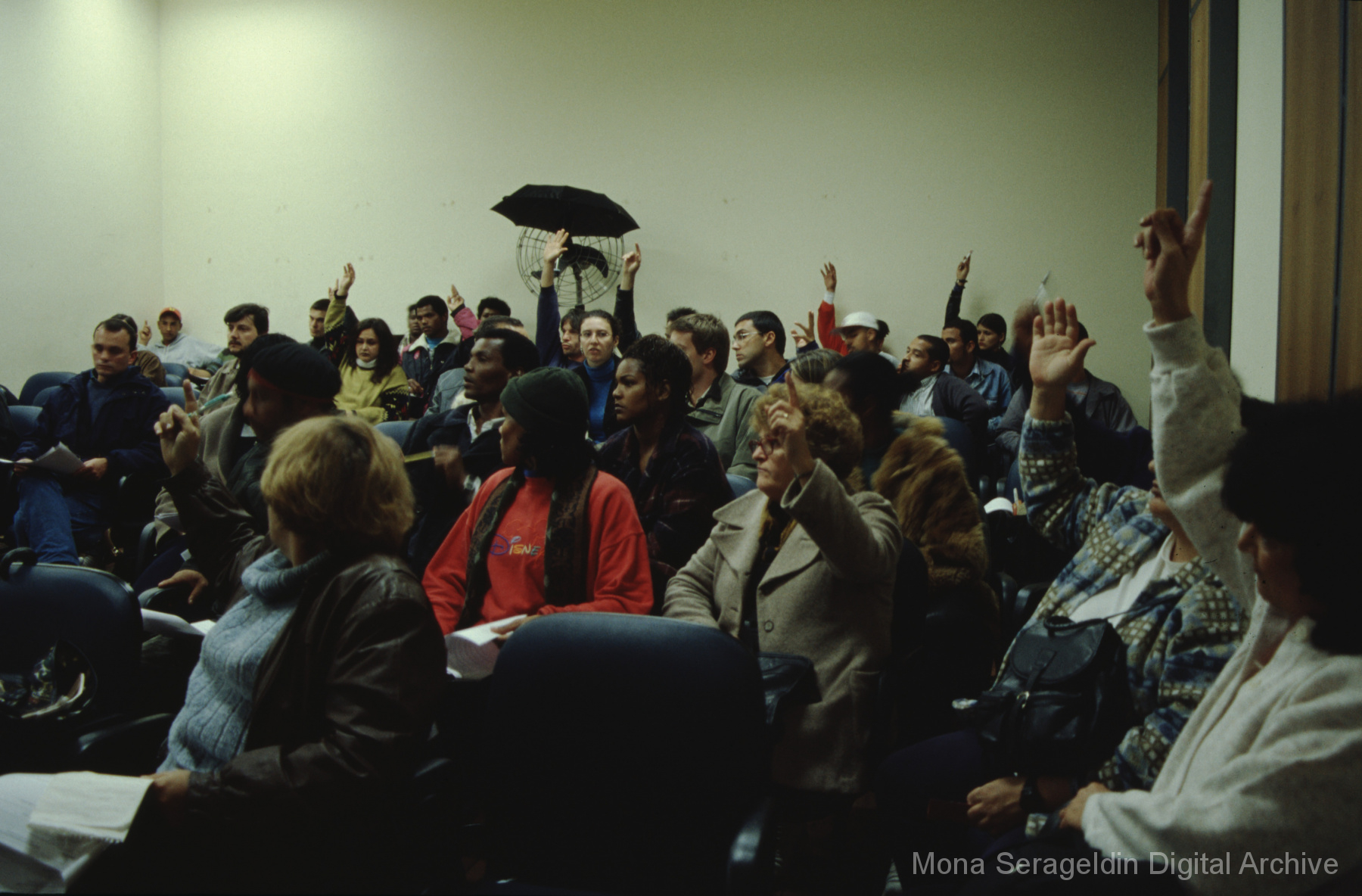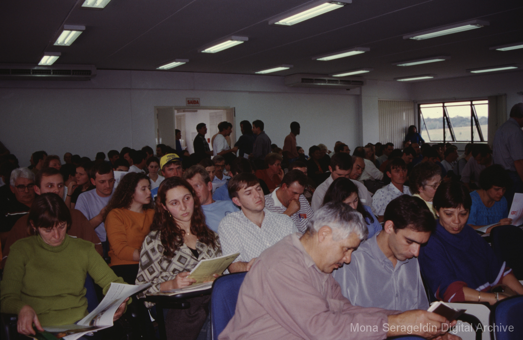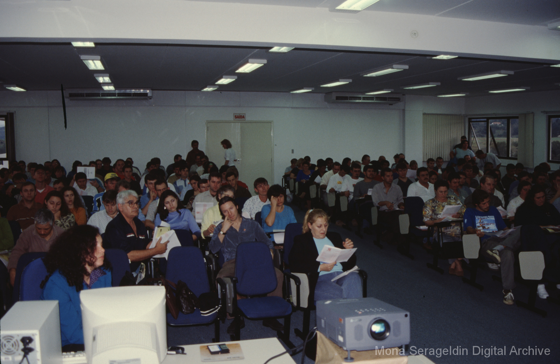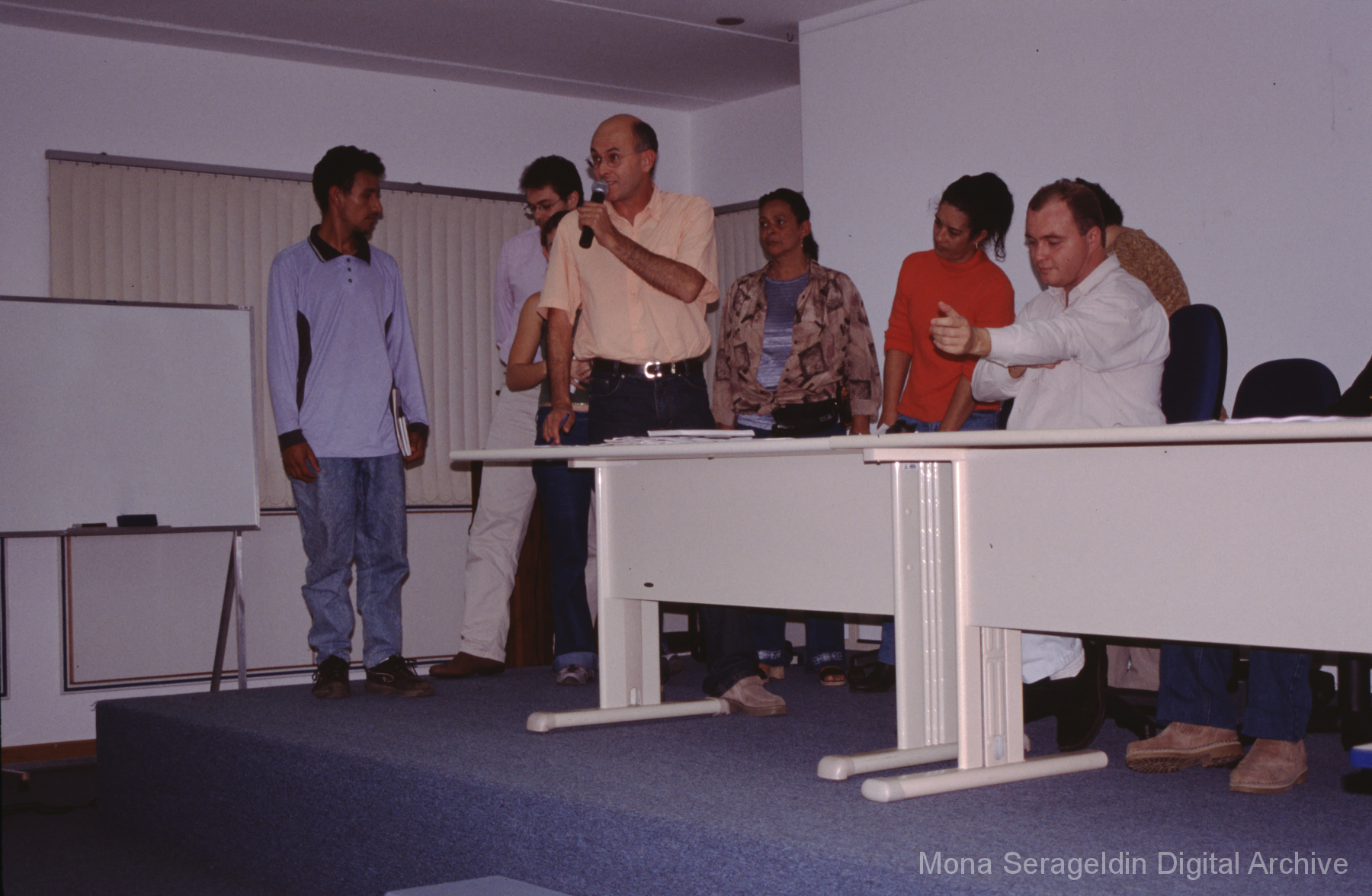 This gallery contains photographs of a participatory budgeting forum “Orçamento Participativo: Participar é Construir” for the municipality of Taquara, in the state of Rio Grande do Sul in southern Brazil, from around 2001. Views include meeting participants, presenters and presentation slides, and musicians, as well as landscape views of fields. Mona Serageldin is pictured.