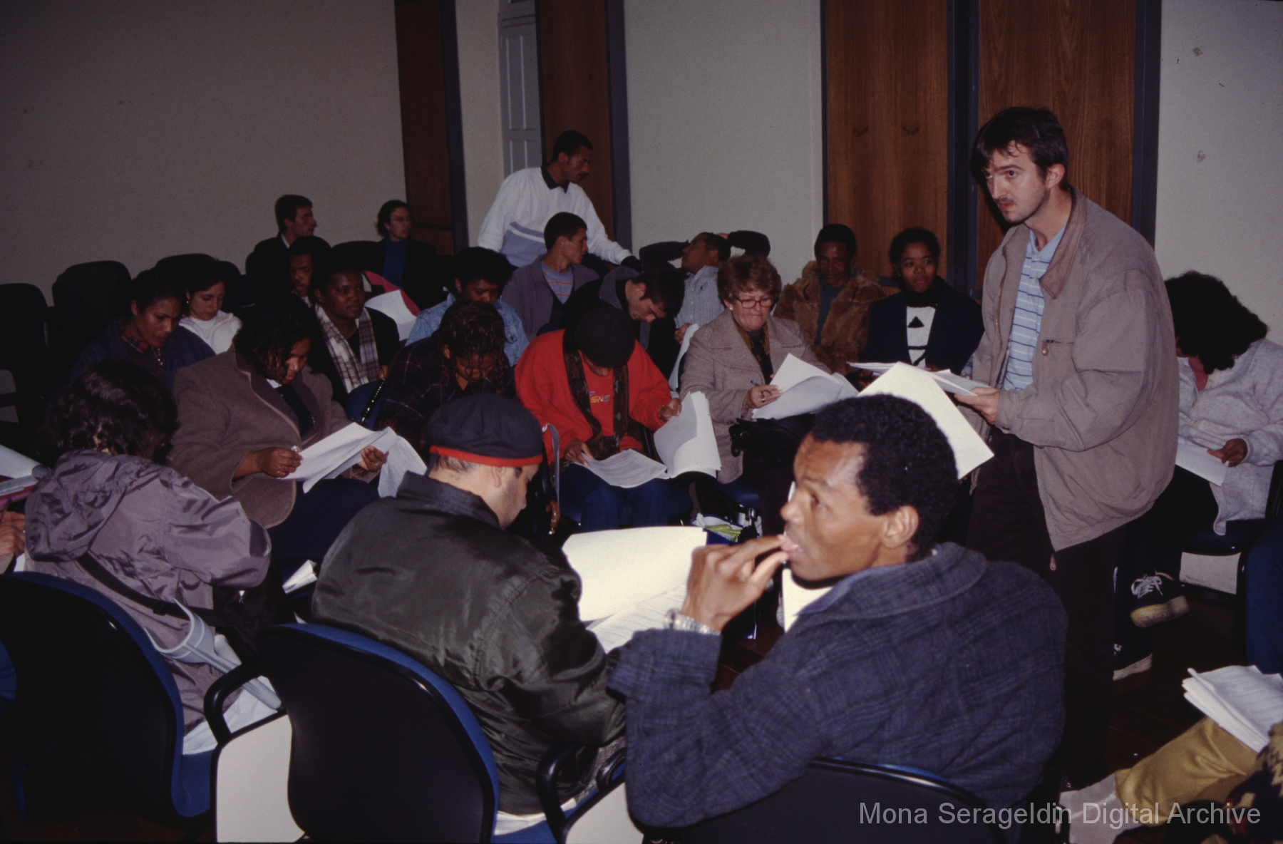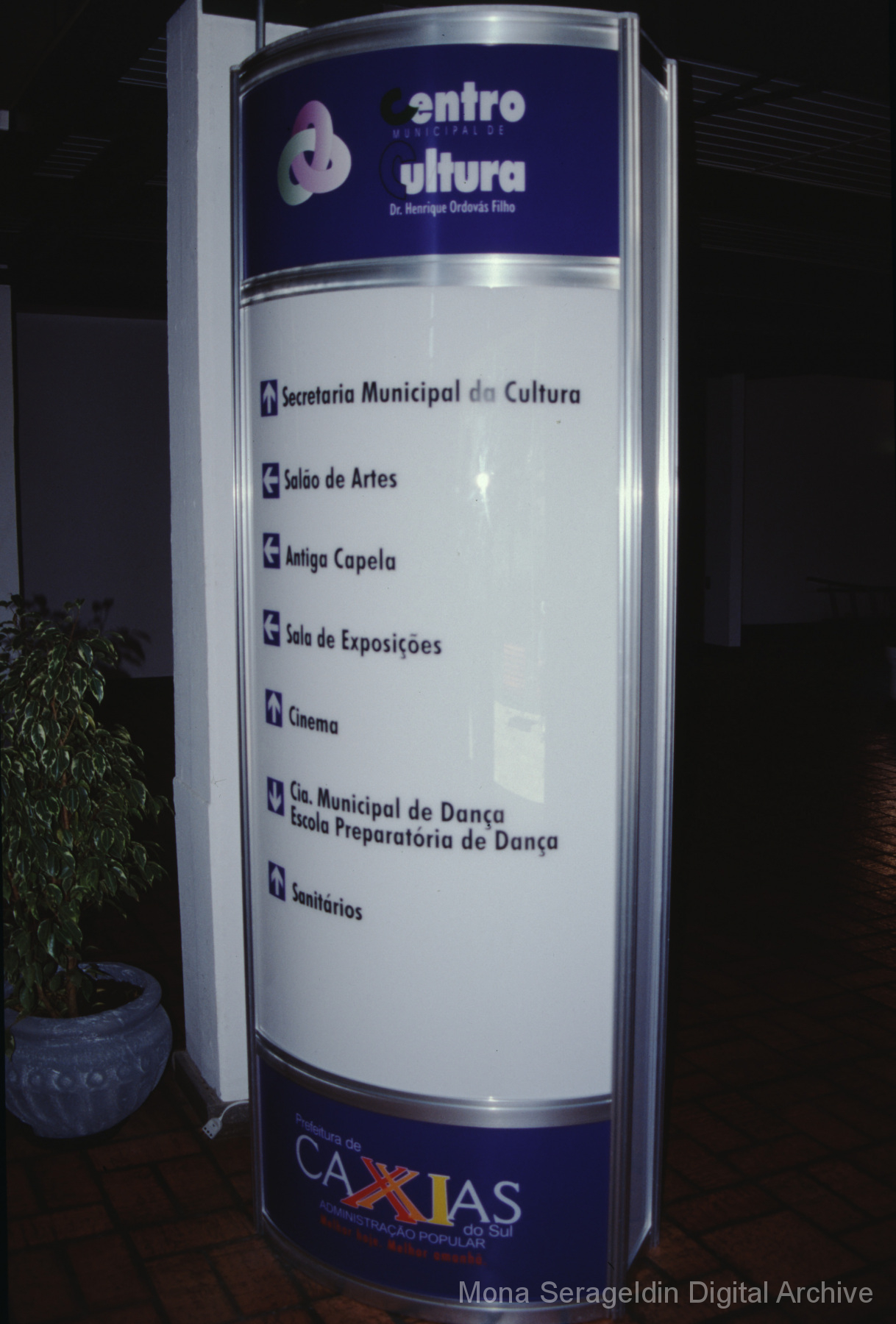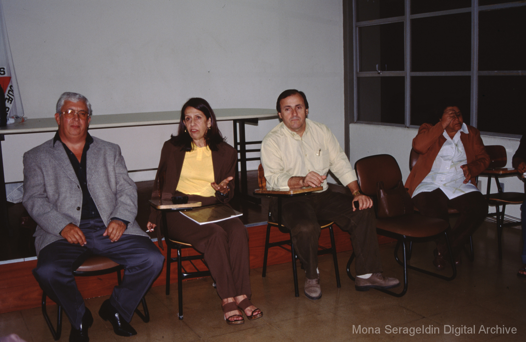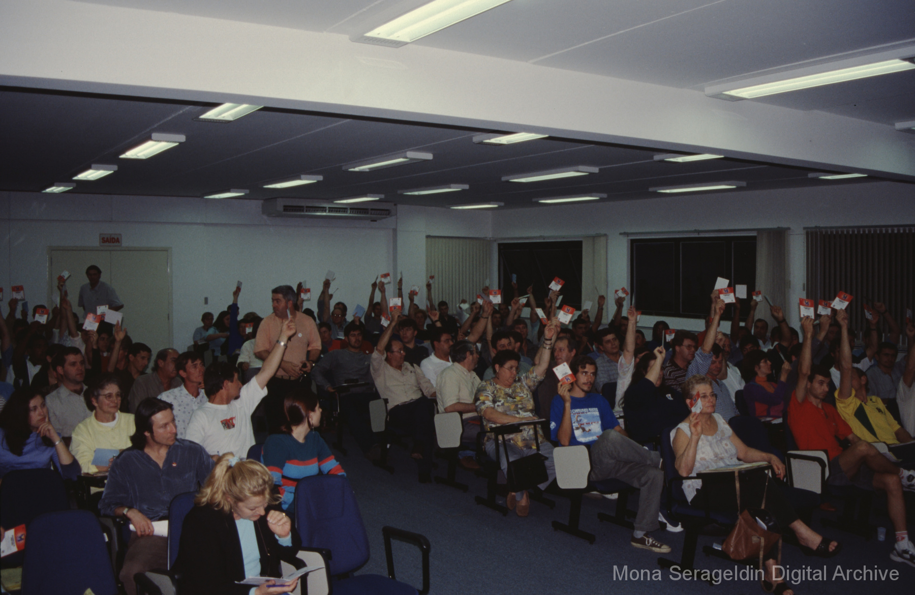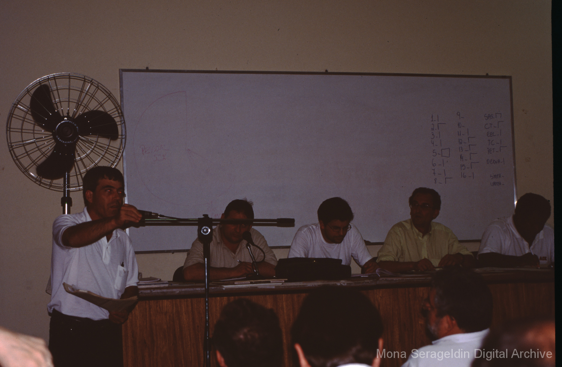 This gallery contains photographs of a participatory budgeting forum “Orçamento Participativo: Participar é Construir” for the municipality of Taquara, in the state of Rio Grande do Sul in southern Brazil, from around 2001. Views include meeting participants, presenters and presentation slides, and musicians, as well as landscape views of fields. Mona Serageldin is pictured.