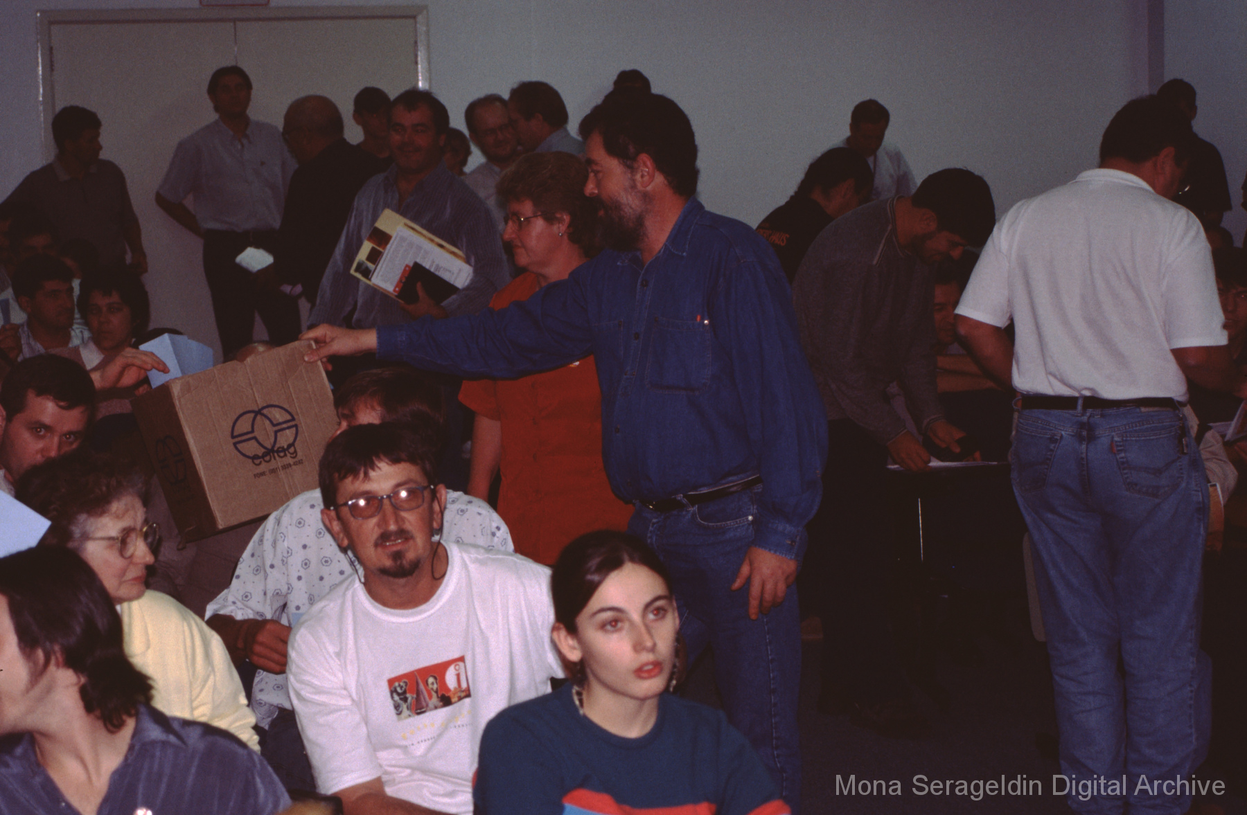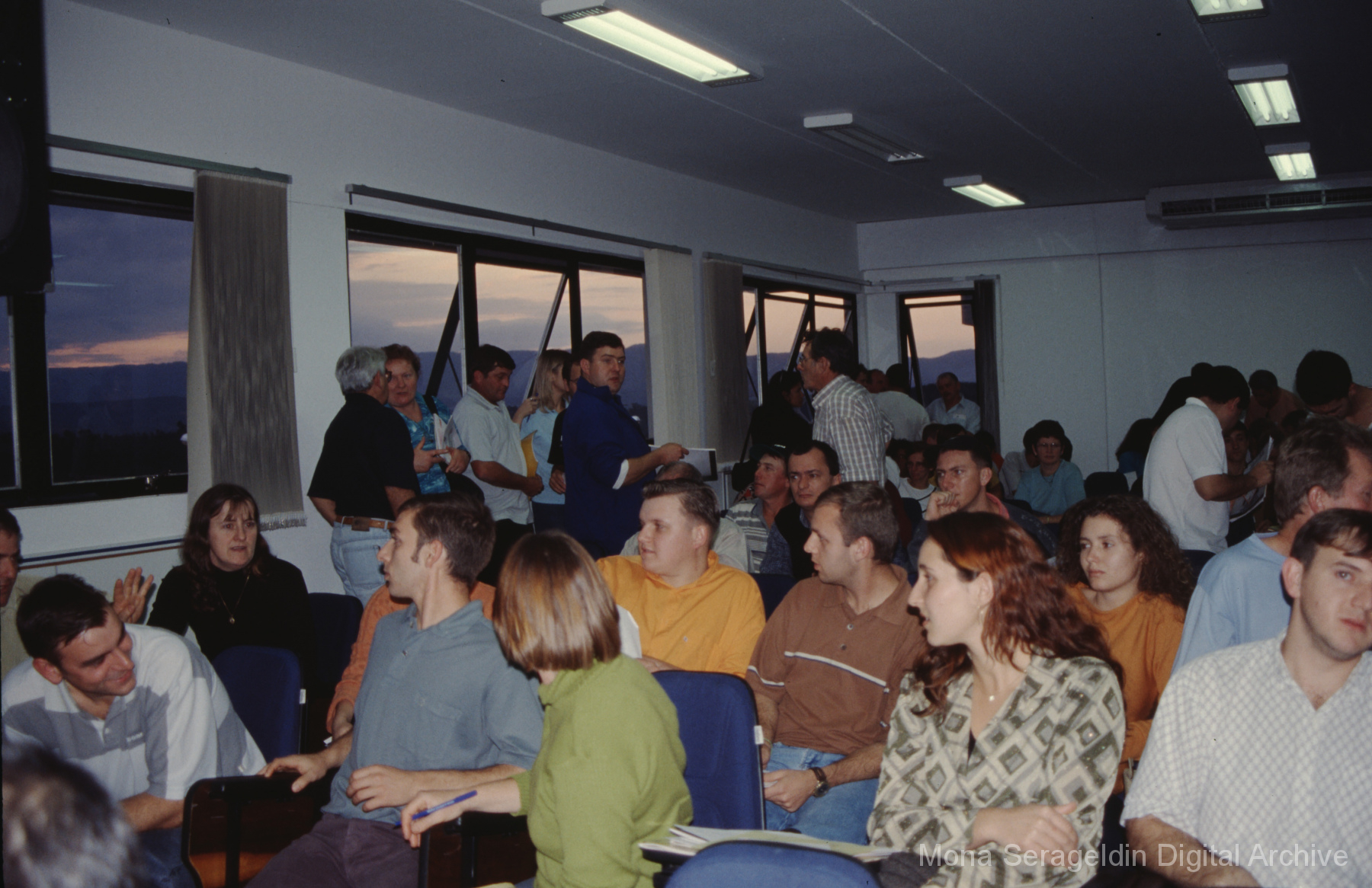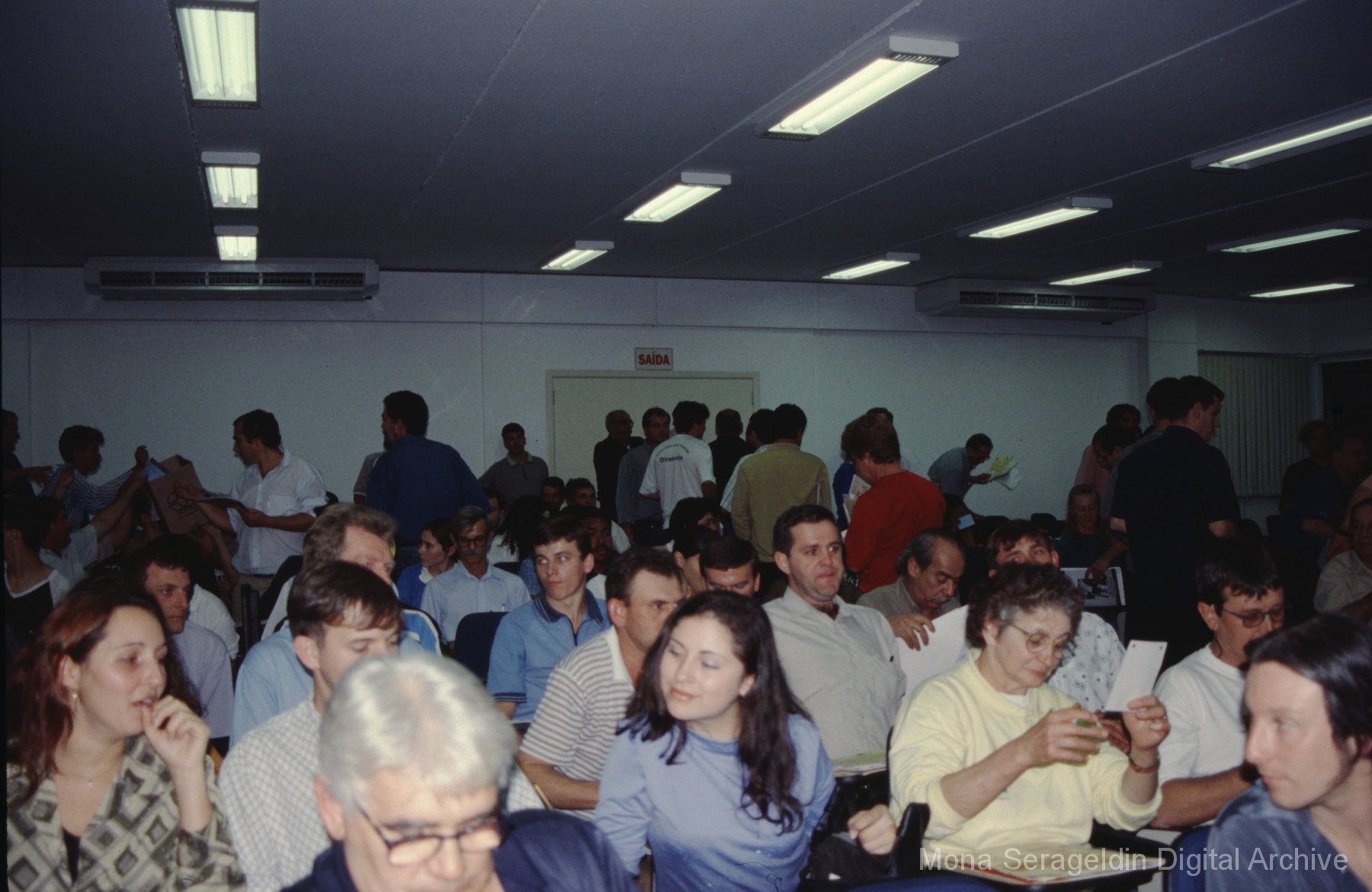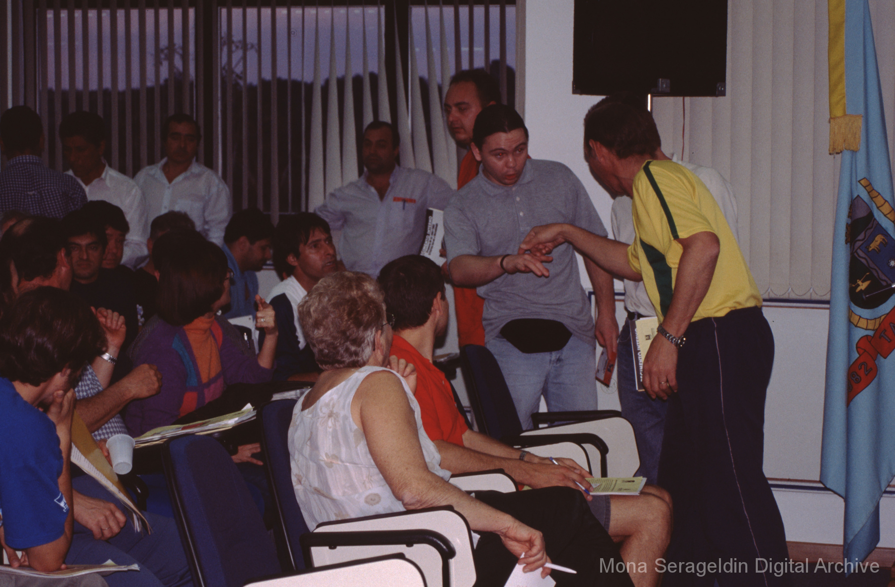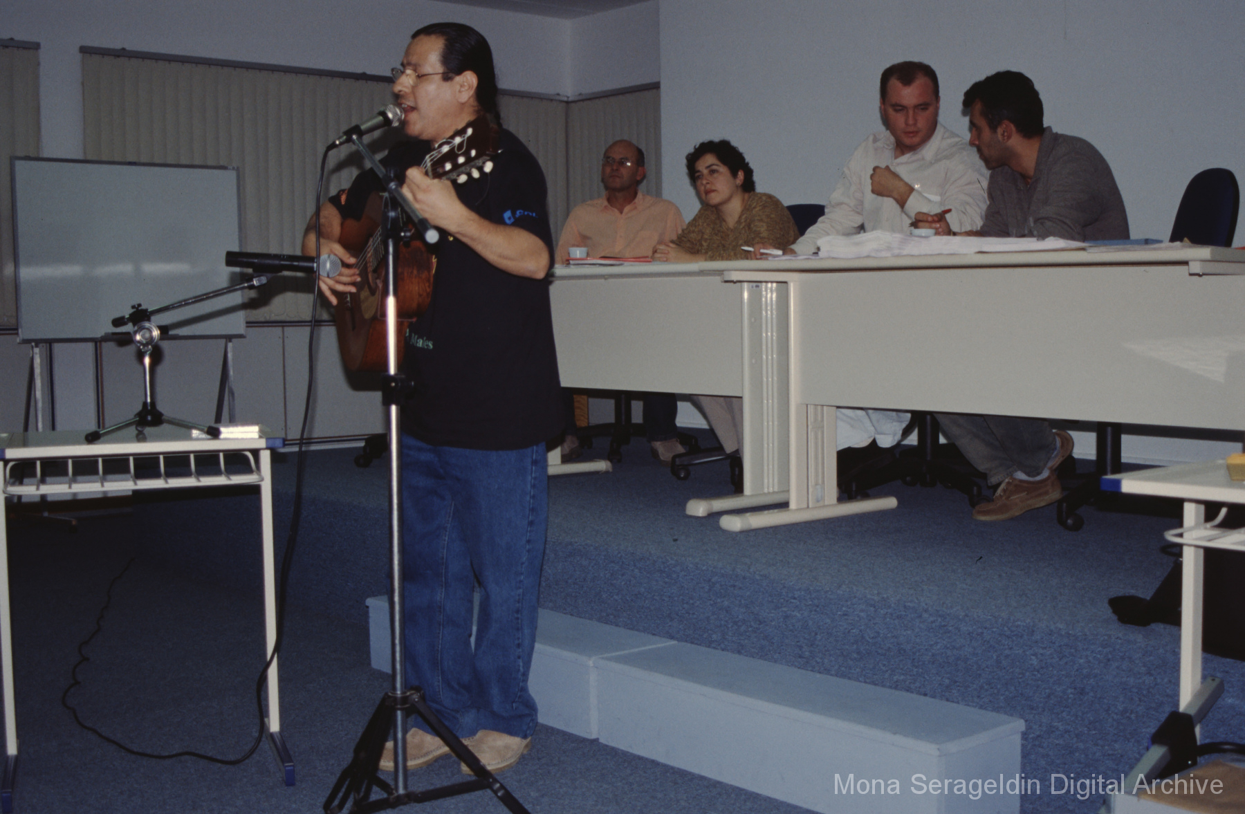 This gallery contains photographs of a participatory budgeting forum “Orçamento Participativo: Participar é Construir” for the municipality of Taquara, in the state of Rio Grande do Sul in southern Brazil, from around 2001. Views include meeting participants, presenters and presentation slides, and musicians, as well as landscape views of fields. Mona Serageldin is pictured.