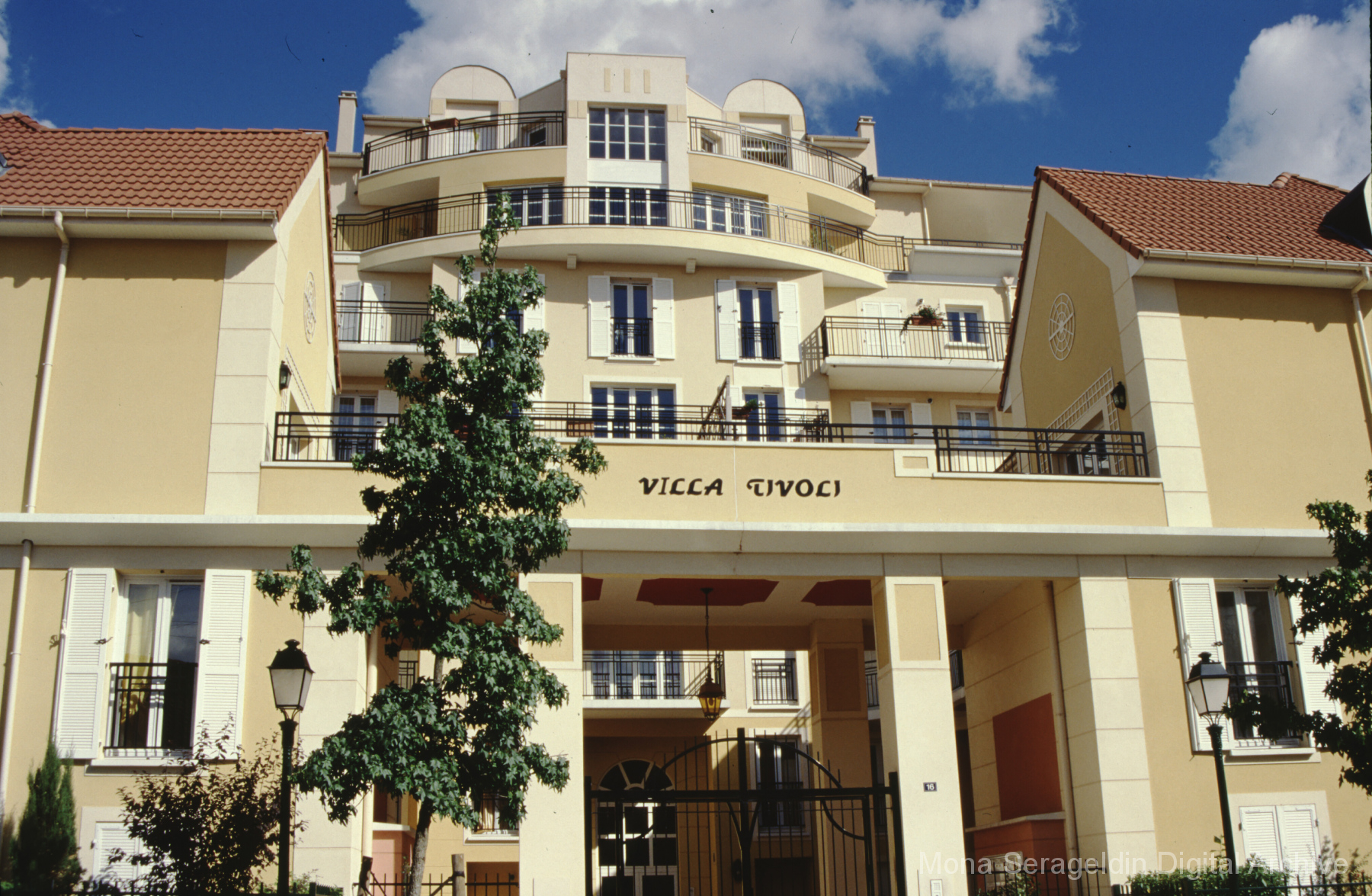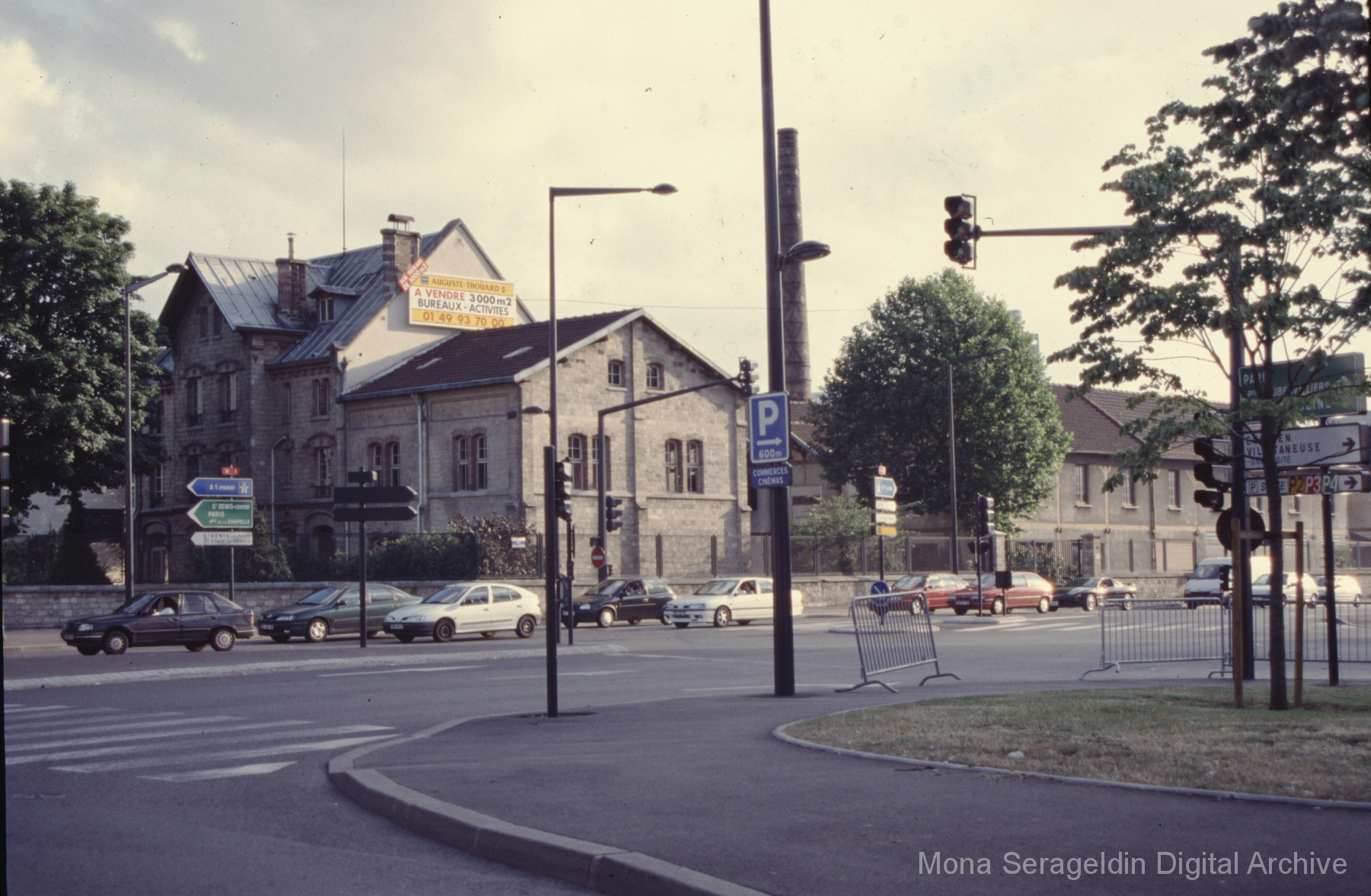 Photographs of the commune of Aubervilliers, northeast of Paris, France from July 2003. The gallery shows commercial and residential buildings, parks and plazas, and new and old housing, showing building exteriors and surrounding streetscapes.