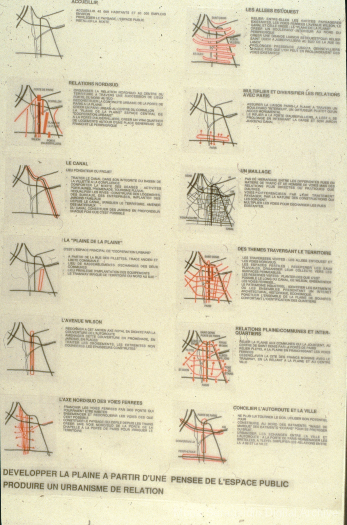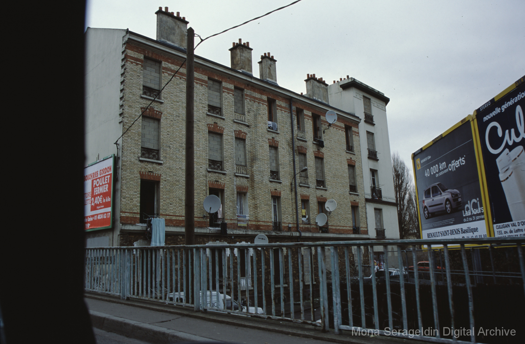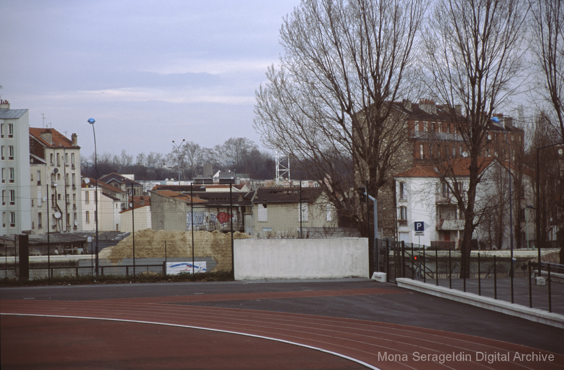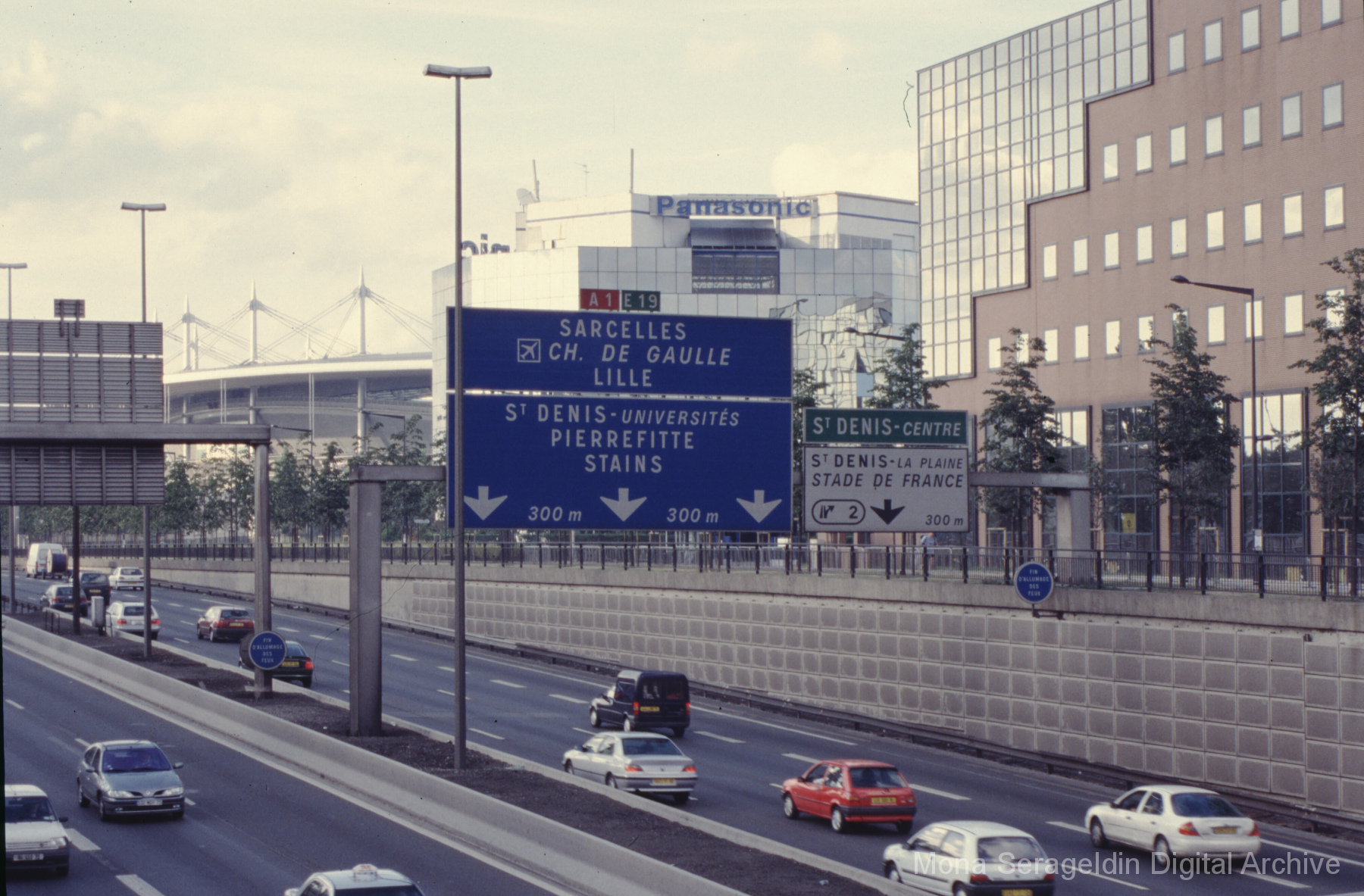 This gallery documents the commune of Saint-Denis in the suburbs north of Paris, France from 1991 through 2003. Photographs cover transportation and housing in the region, including the Autoroute du Nord and a Réseau Express Régional (Regional Express Network) project site for implementing a rail transit system around Paris and its suburbs. A variety of housing developments are represented, including low-income, public, and private housing developments. The gallery also shows the Saint-Denis commercial center, canals, and industrial zones, and the Stade de France. Views include portraits of residents, building interiors and exteriors, streetscapes, and maps and diagrams.