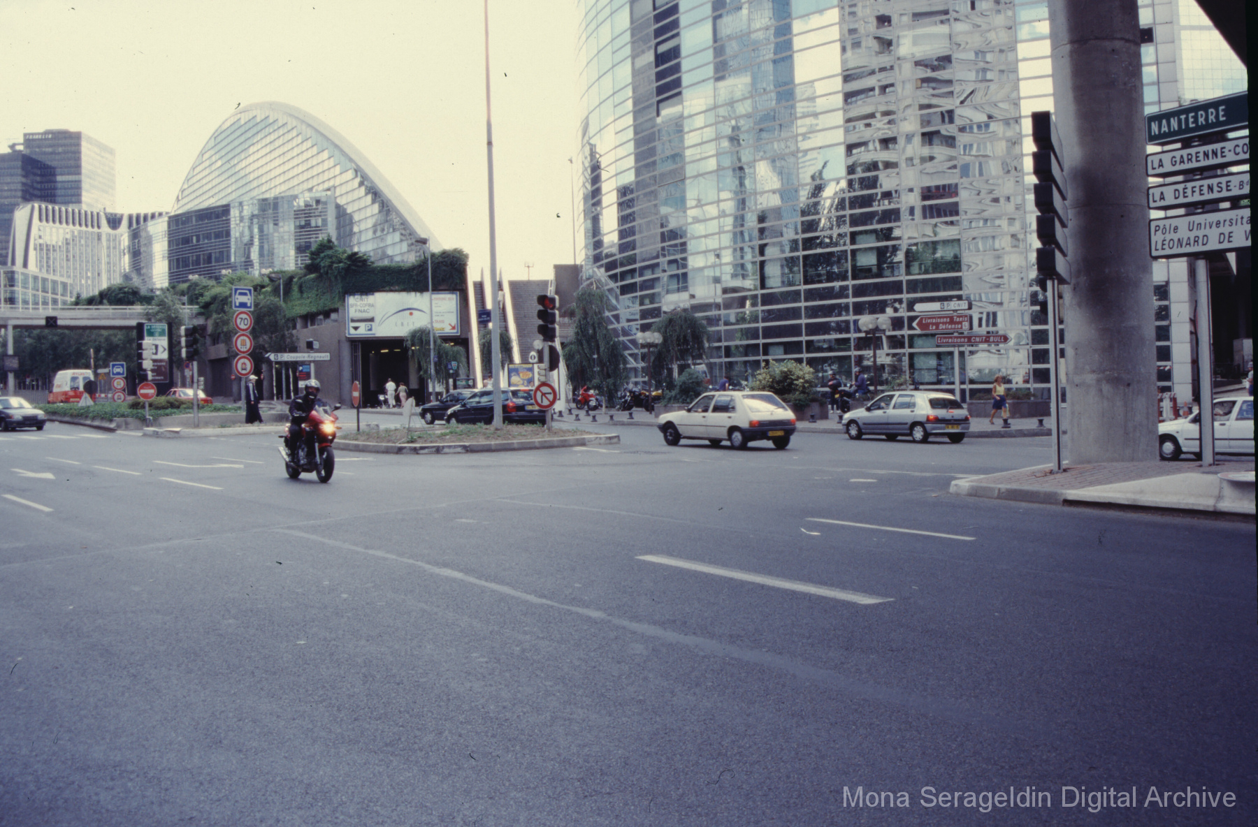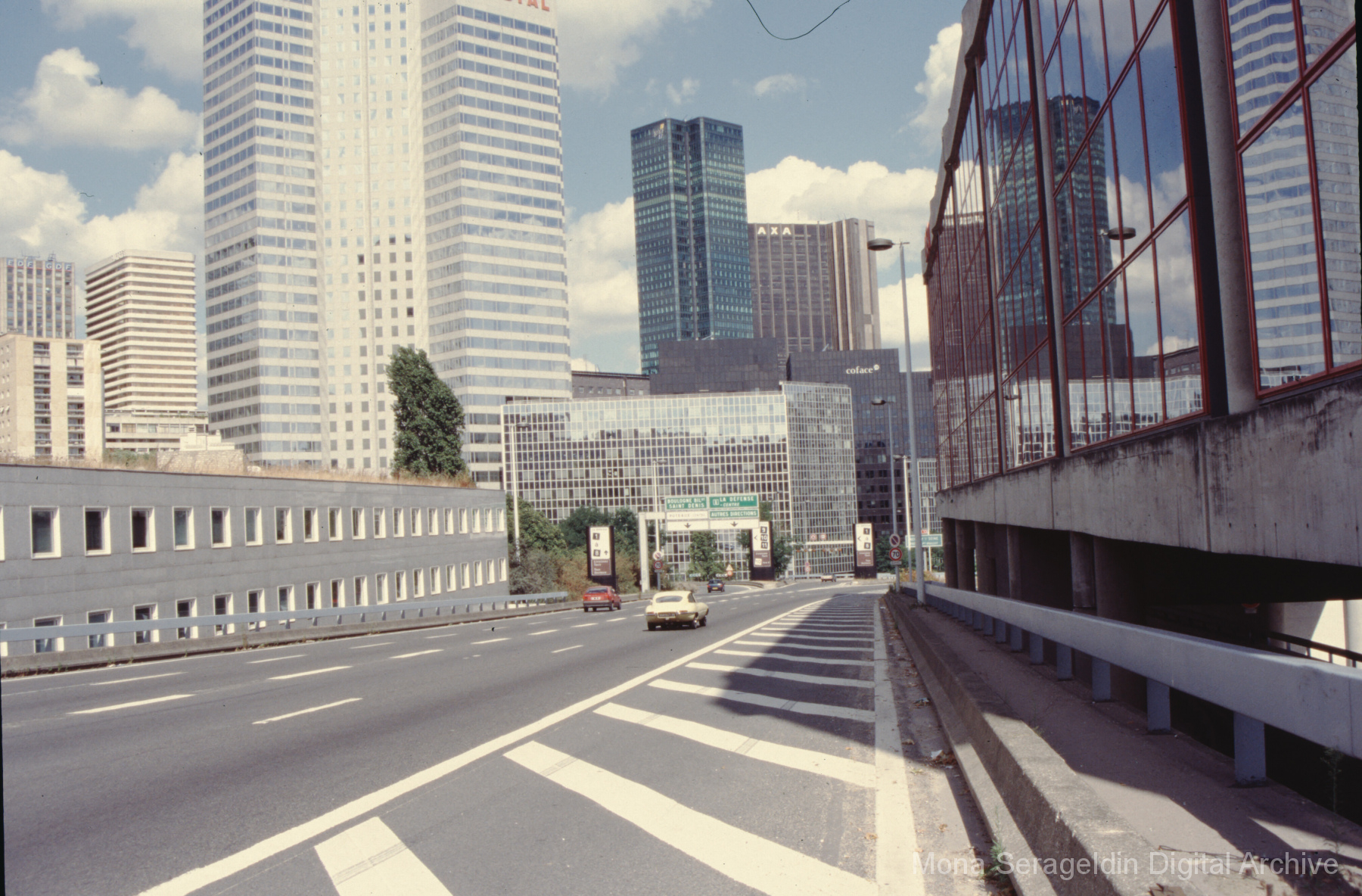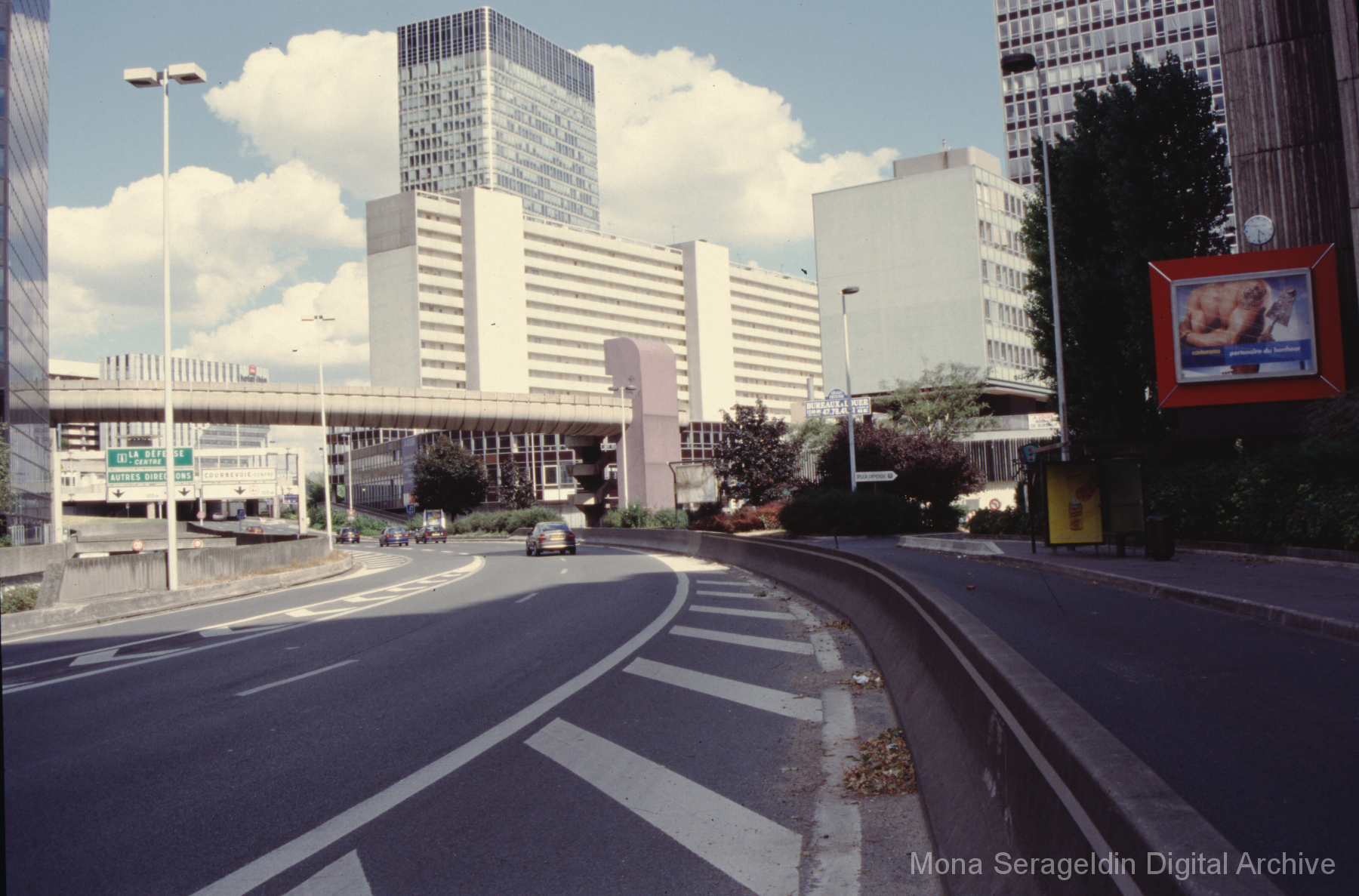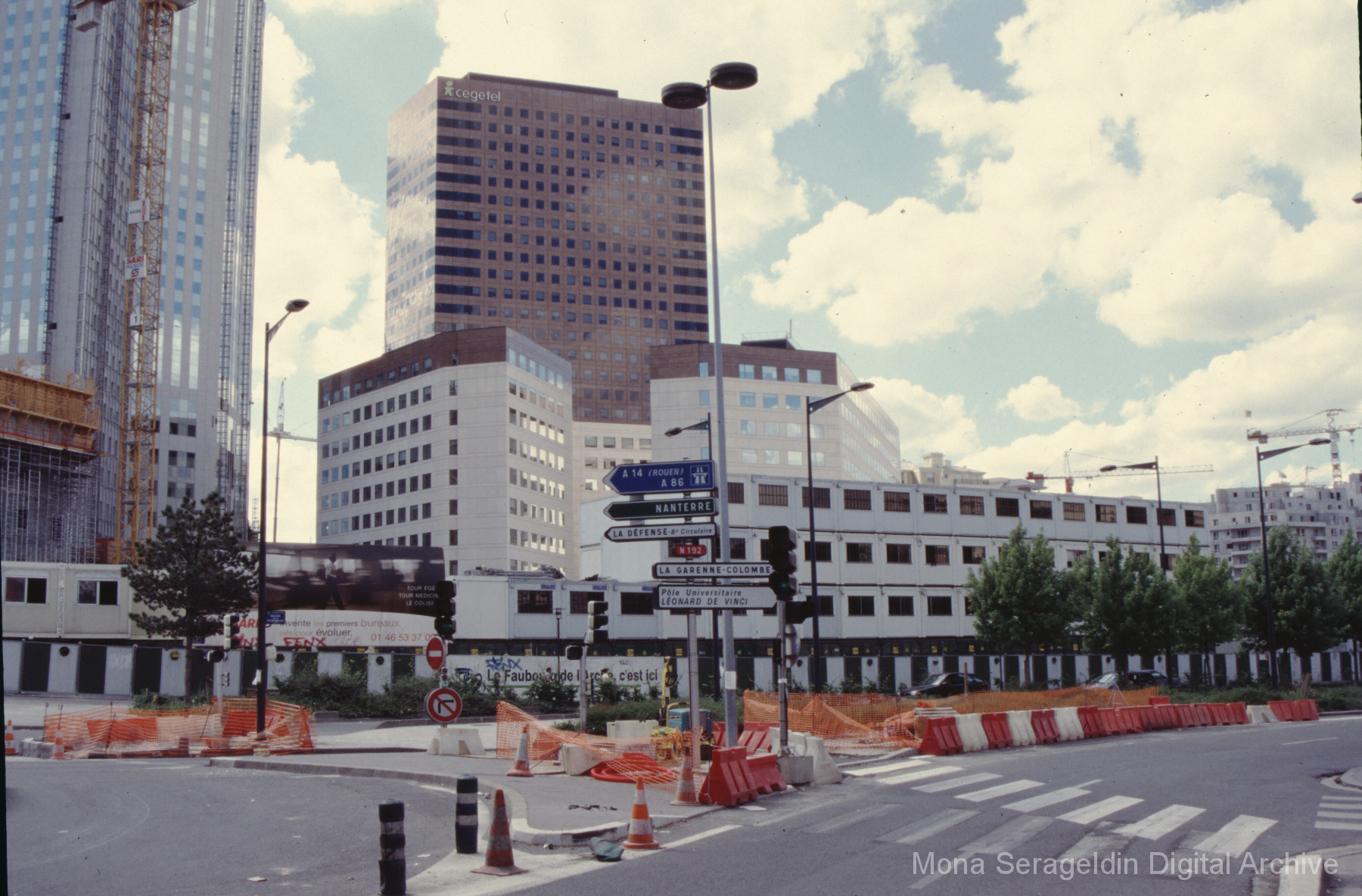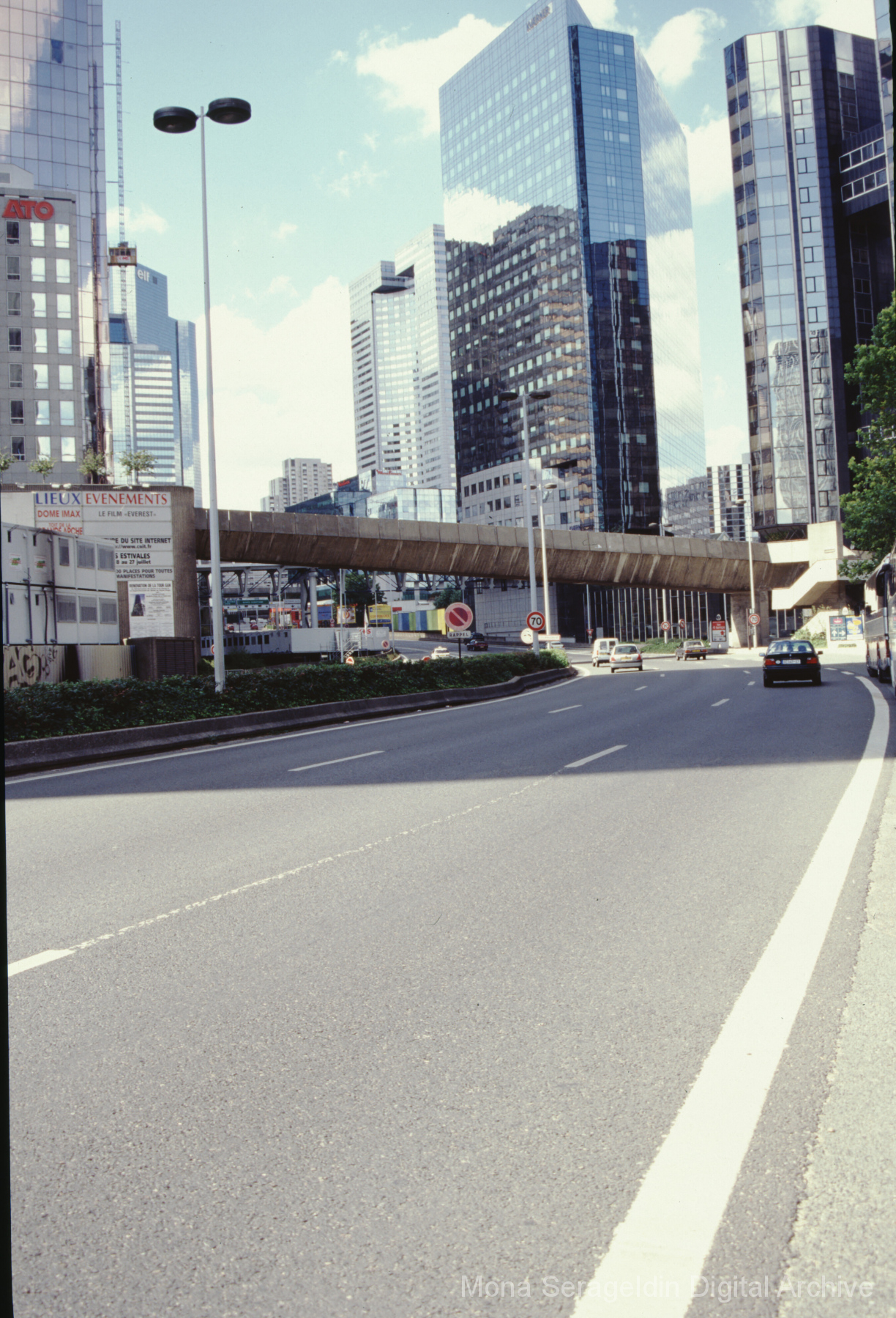 This gallery covers La Défense business district outside Paris in the Île-de-France region of France from August 1999. Photographs show views of roadways through the district, high-rise buildings, residential and commercial buildings, and areas under construction.