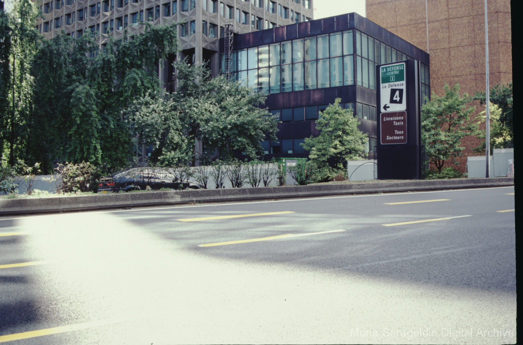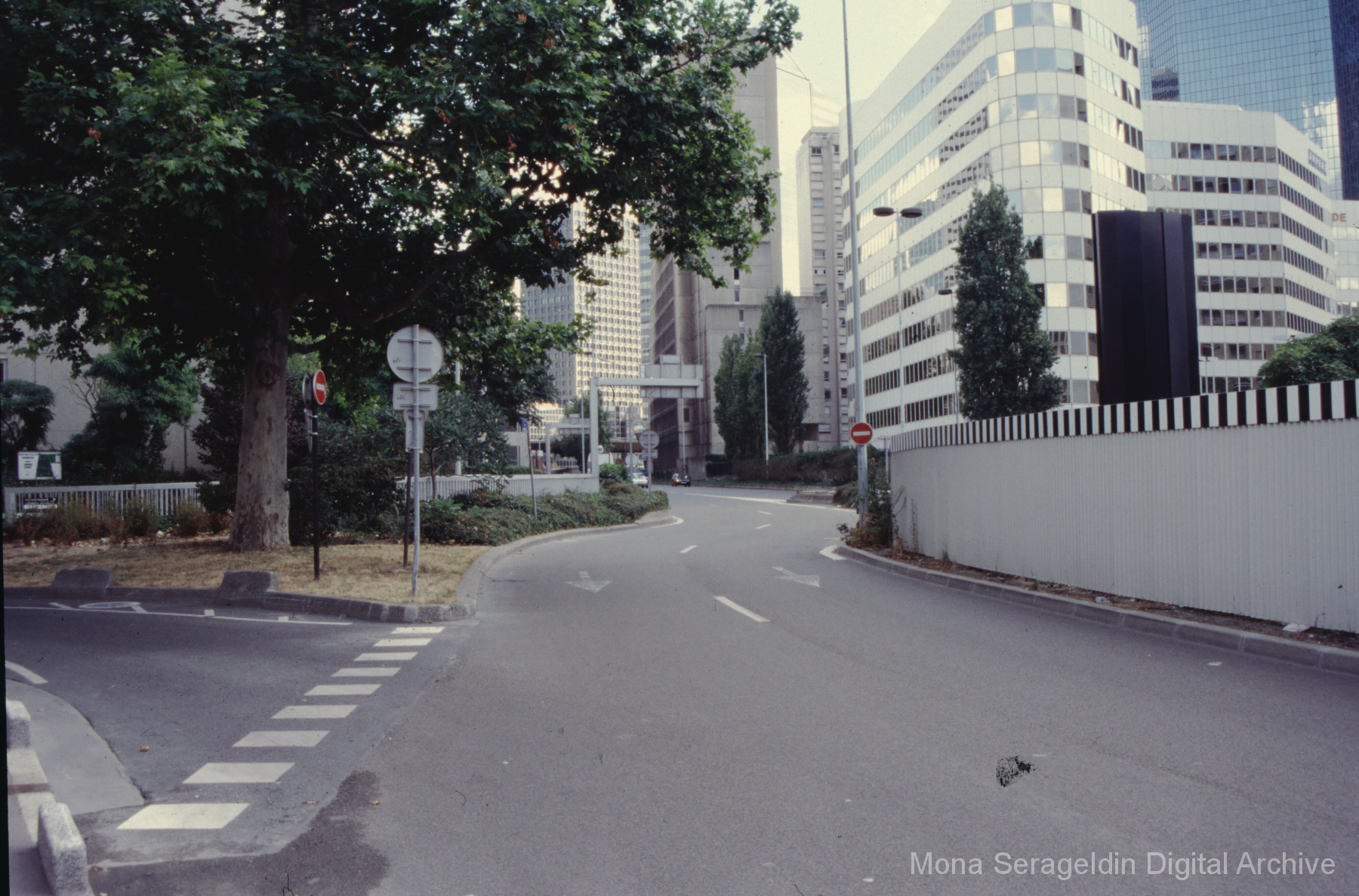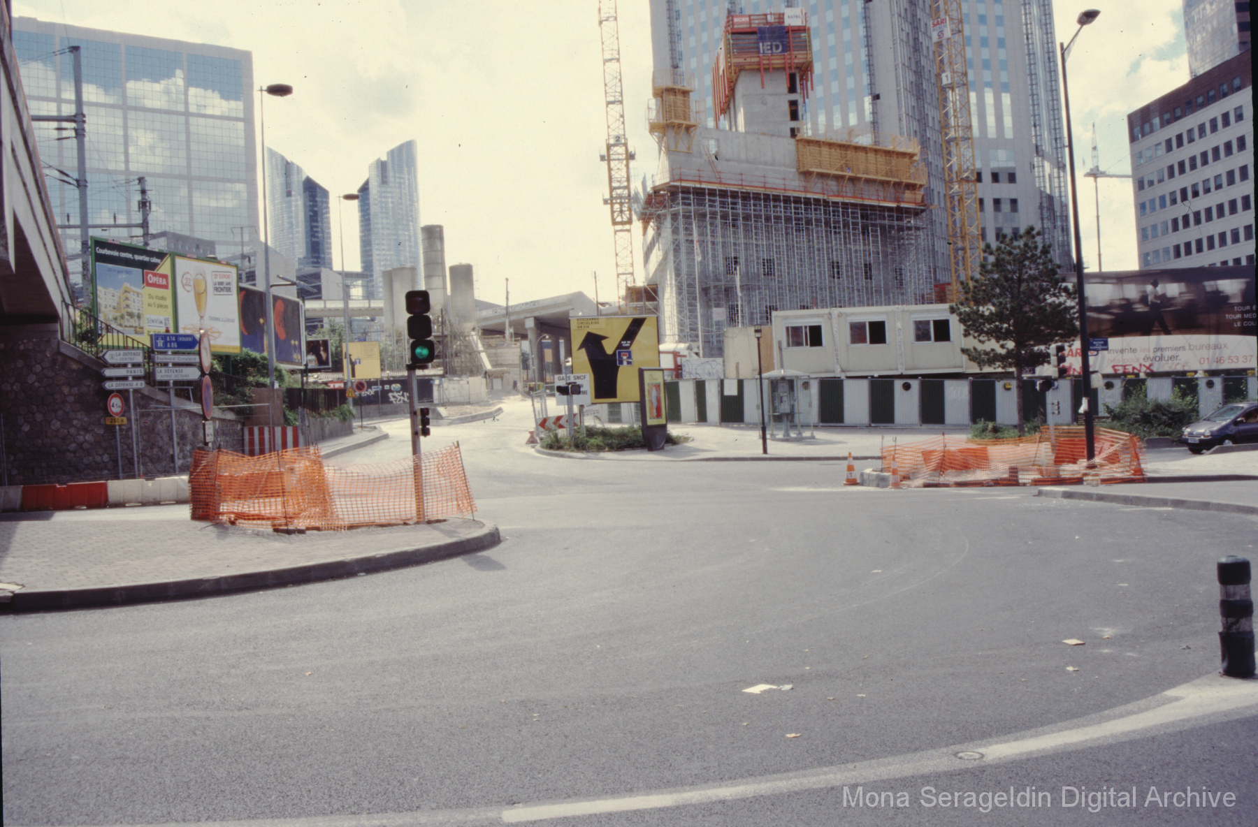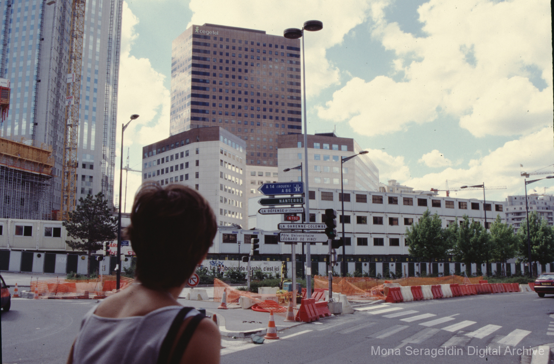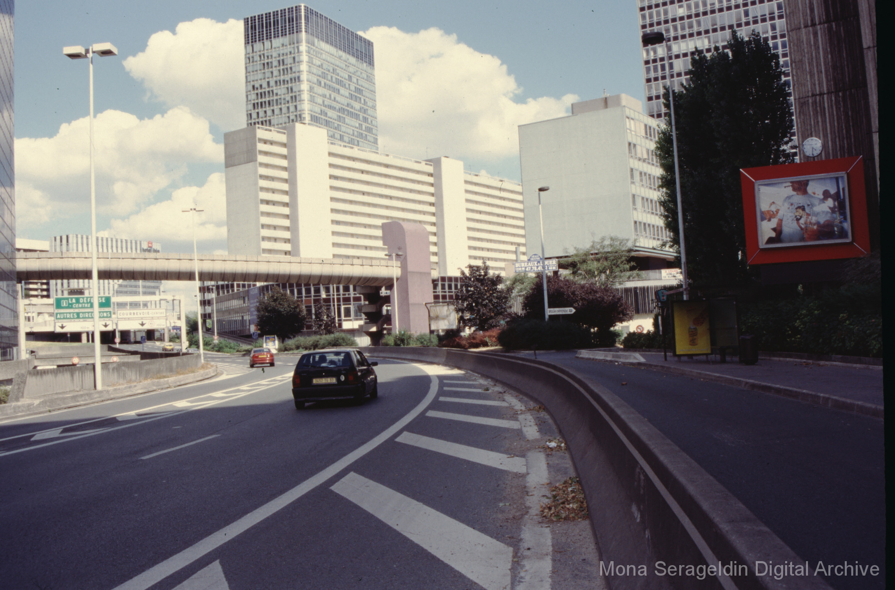 This gallery covers La Défense business district outside Paris in the Île-de-France region of France from August 1999. Photographs show views of roadways through the district, high-rise buildings, residential and commercial buildings, and areas under construction.
