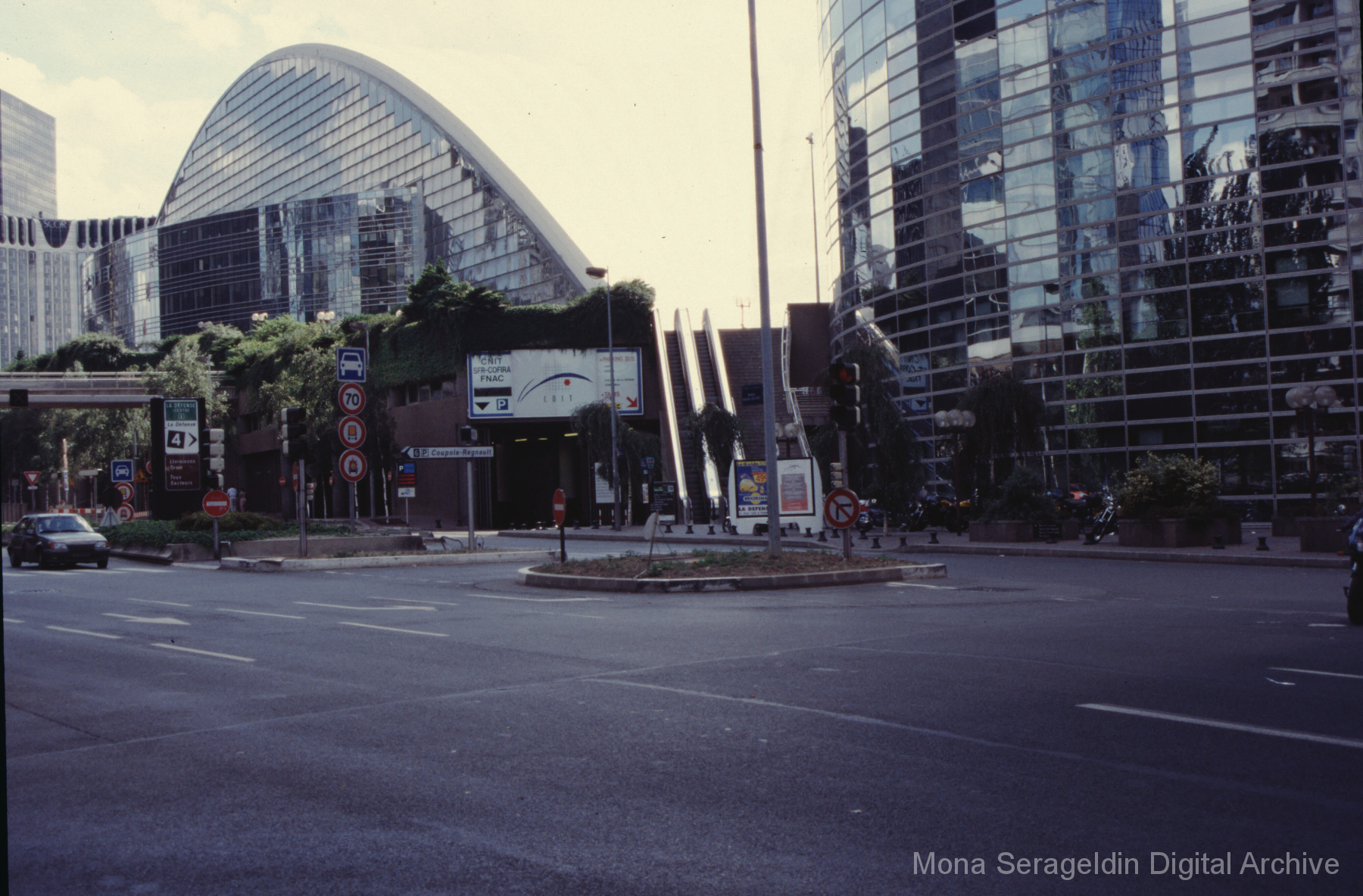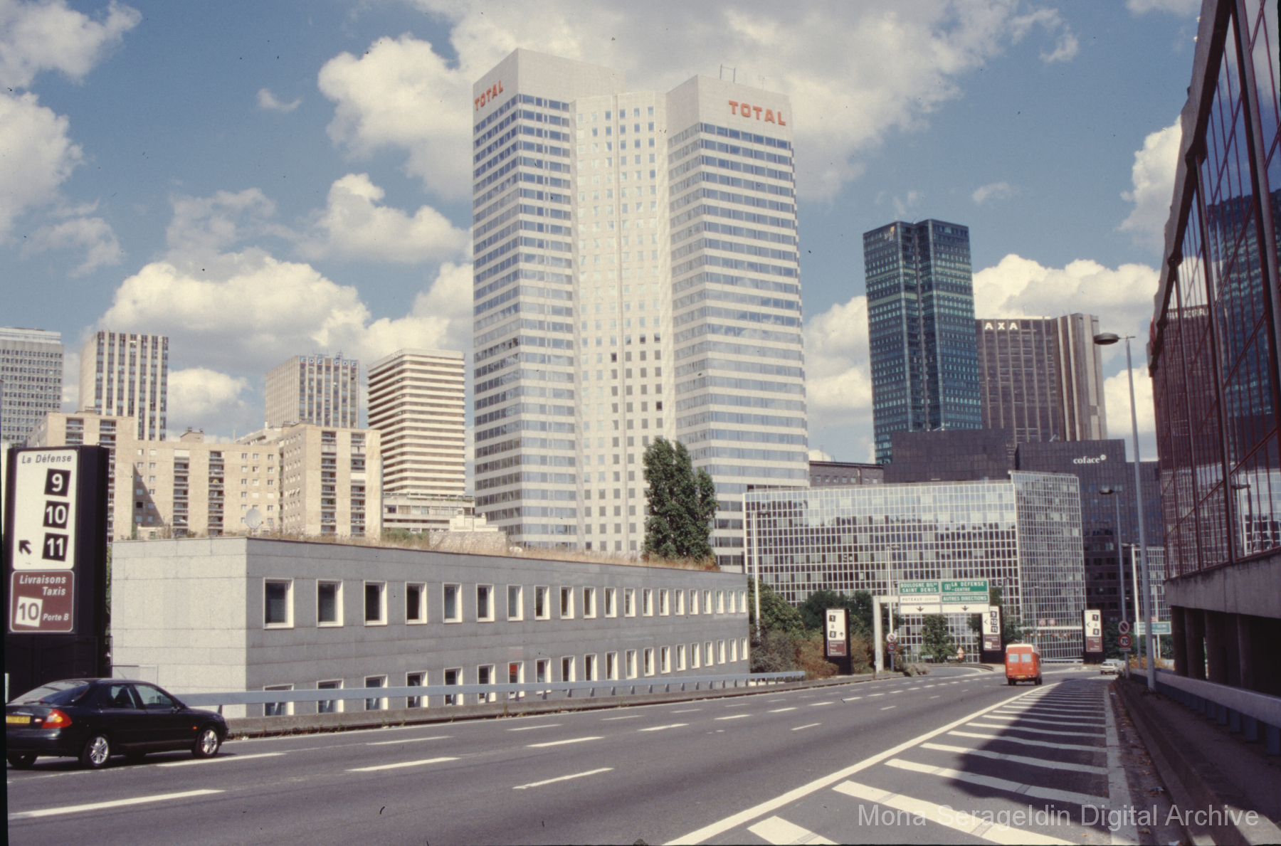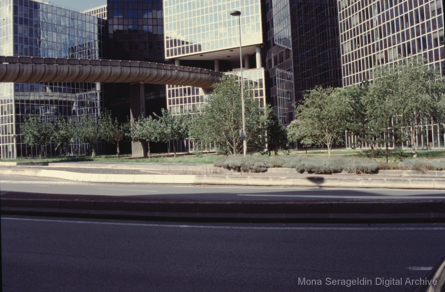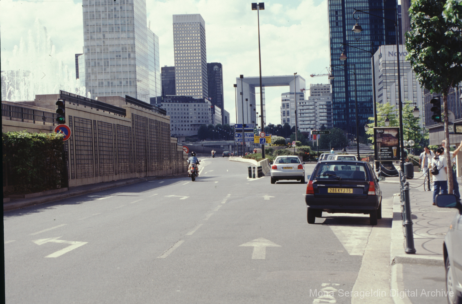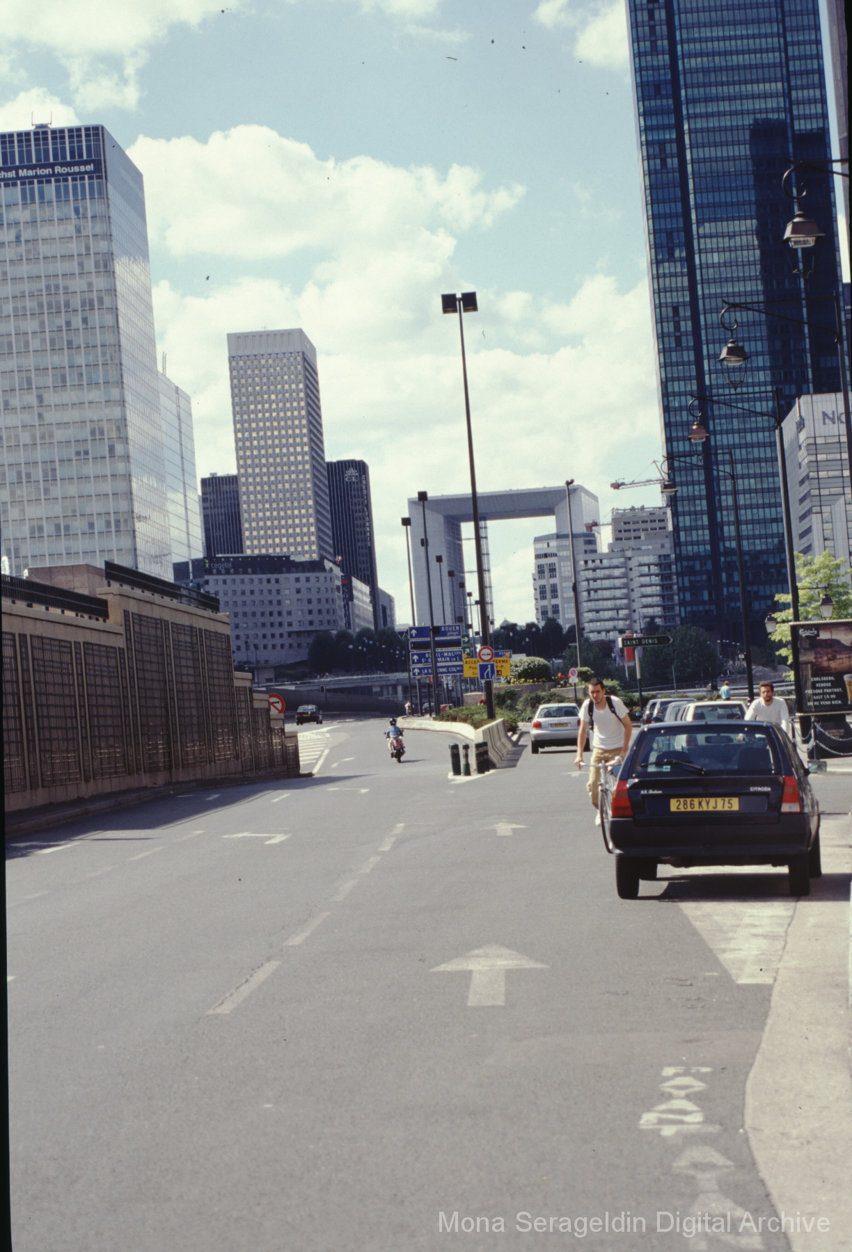 This gallery covers La Défense business district outside Paris in the Île-de-France region of France from August 1999. Photographs show views of roadways through the district, high-rise buildings, residential and commercial buildings, and areas under construction.