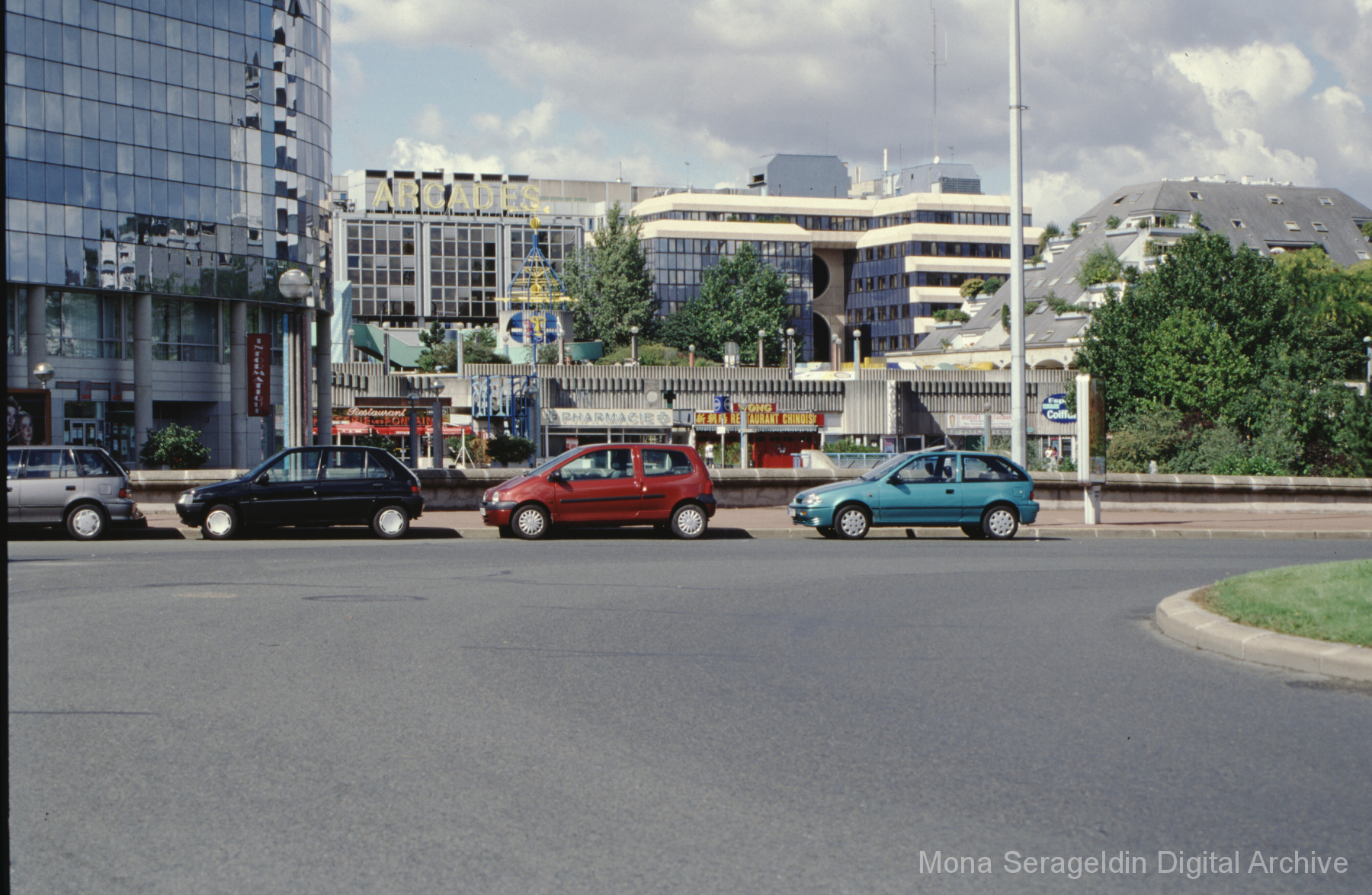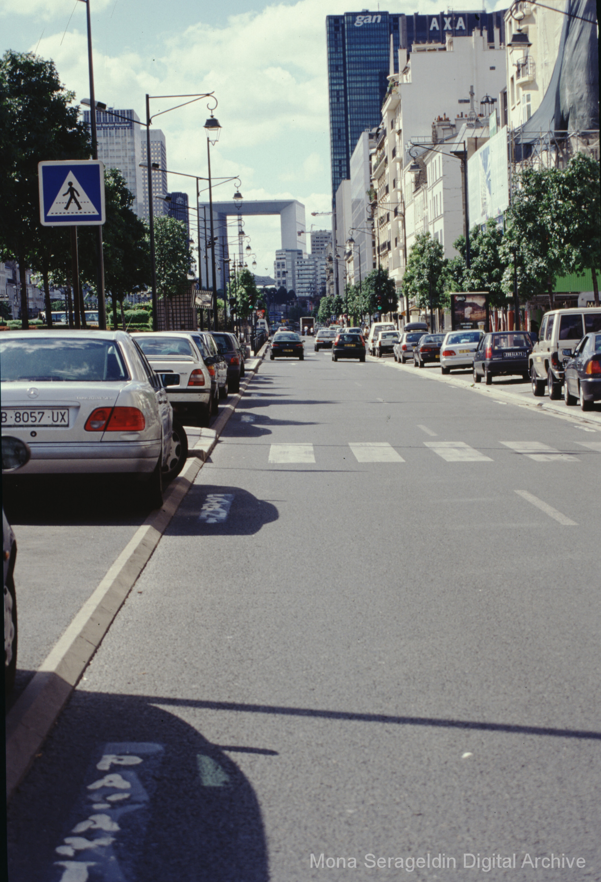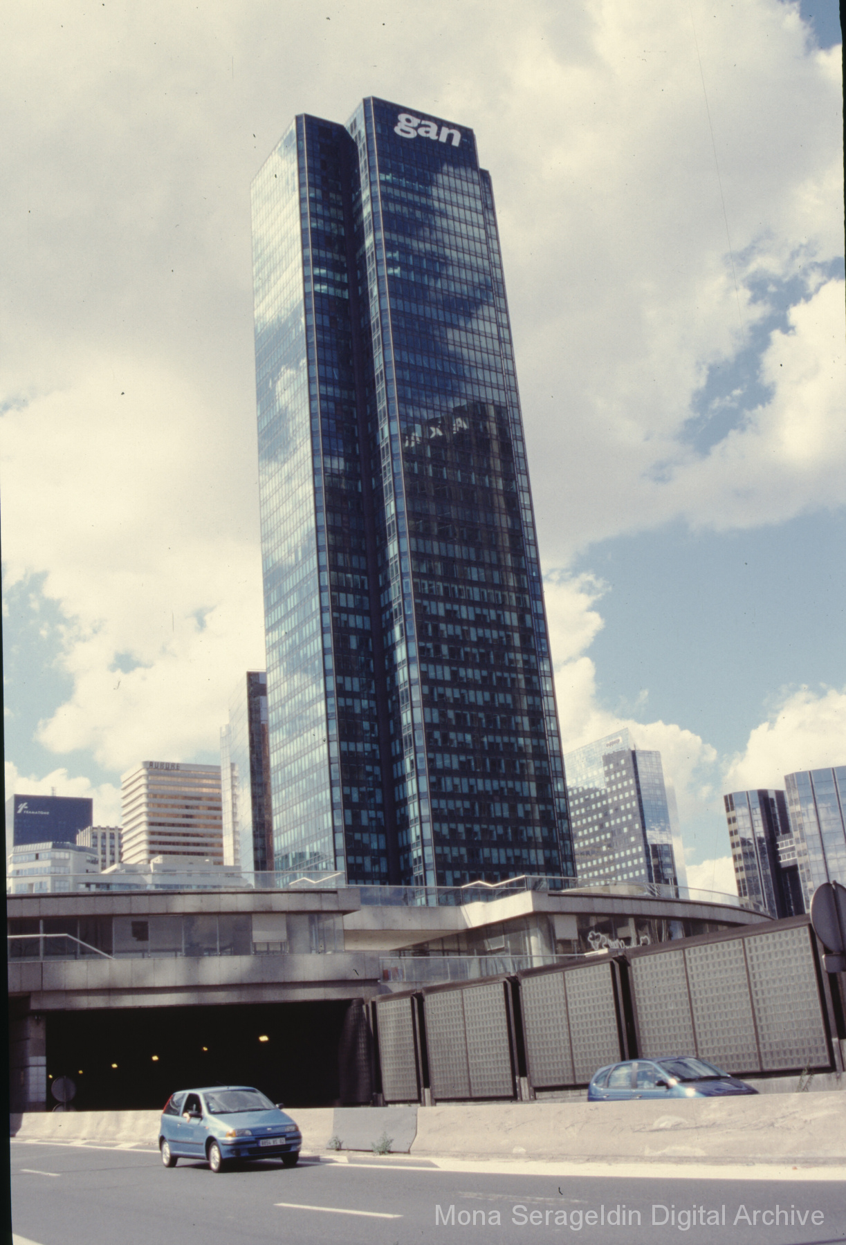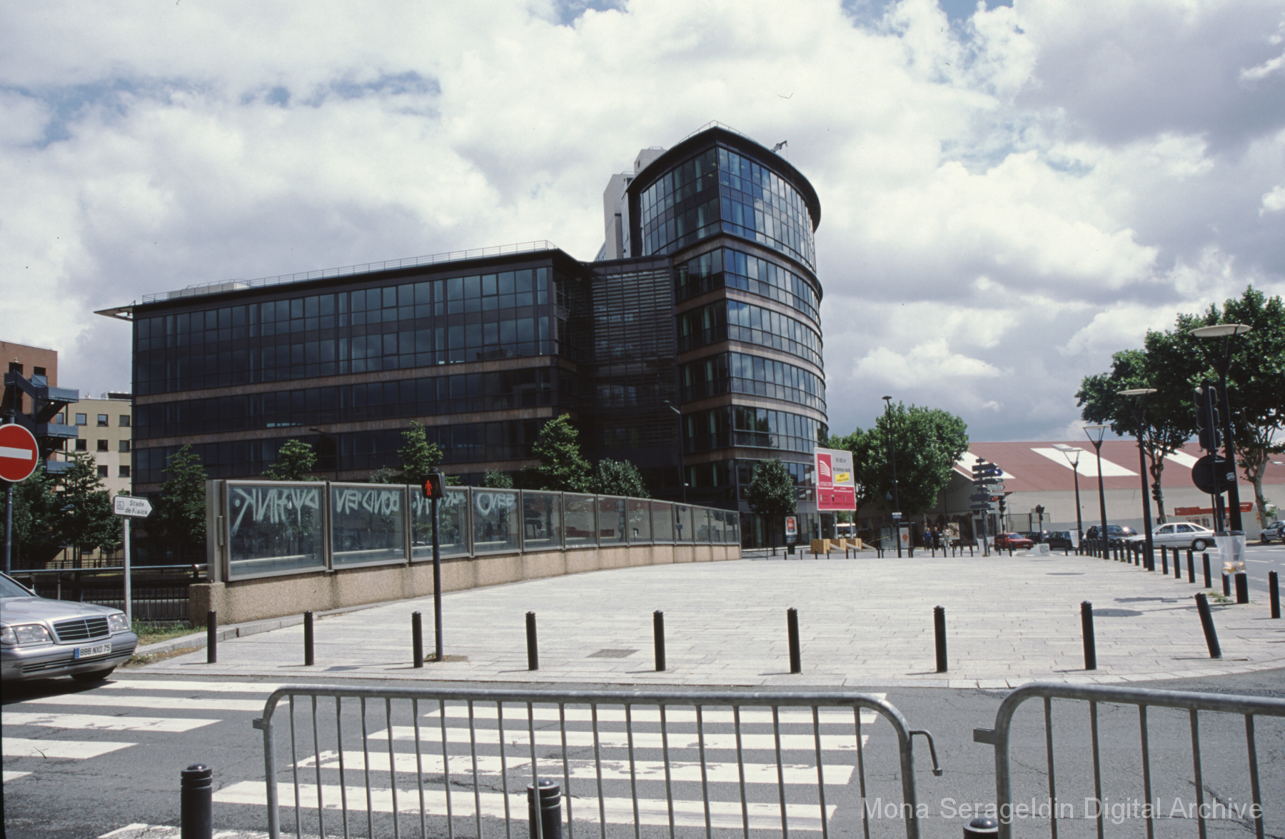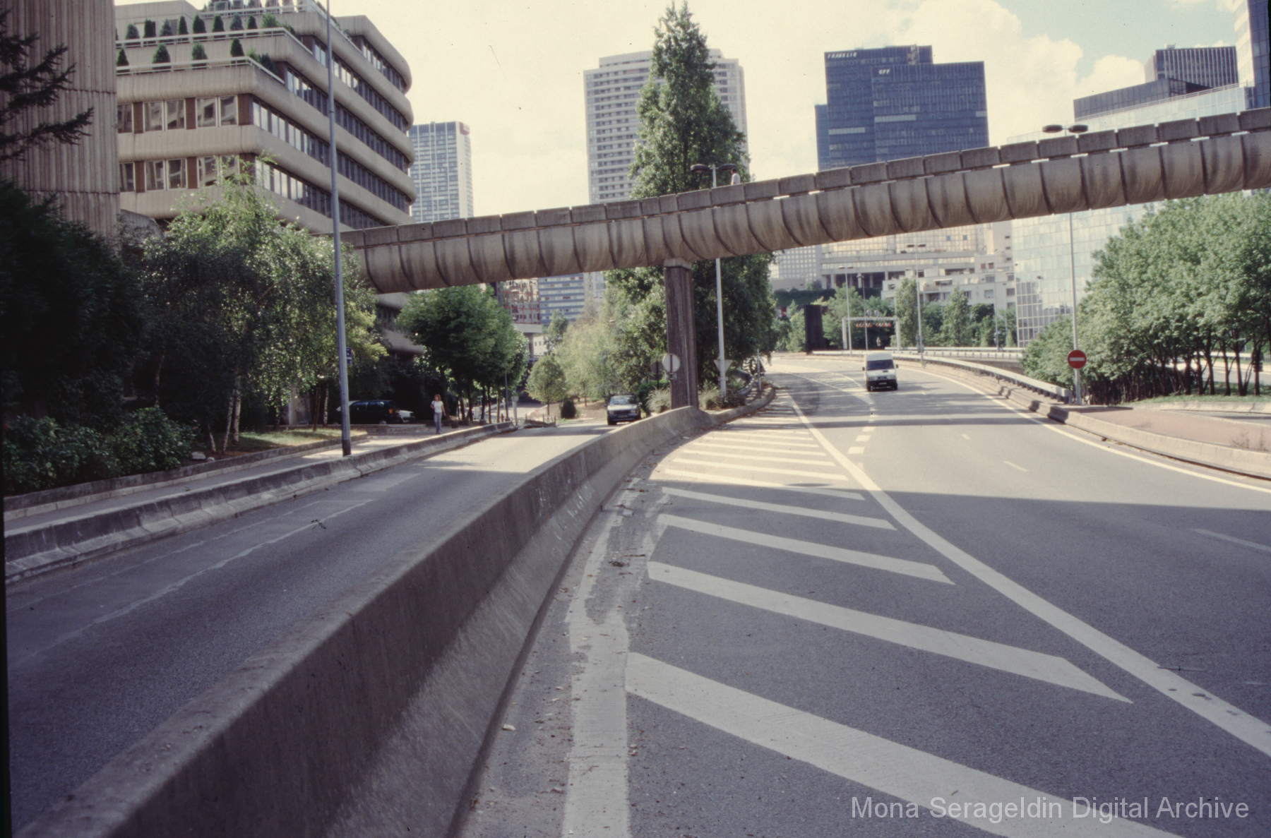 This gallery covers La Défense business district outside Paris in the Île-de-France region of France from August 1999. Photographs show views of roadways through the district, high-rise buildings, residential and commercial buildings, and areas under construction.