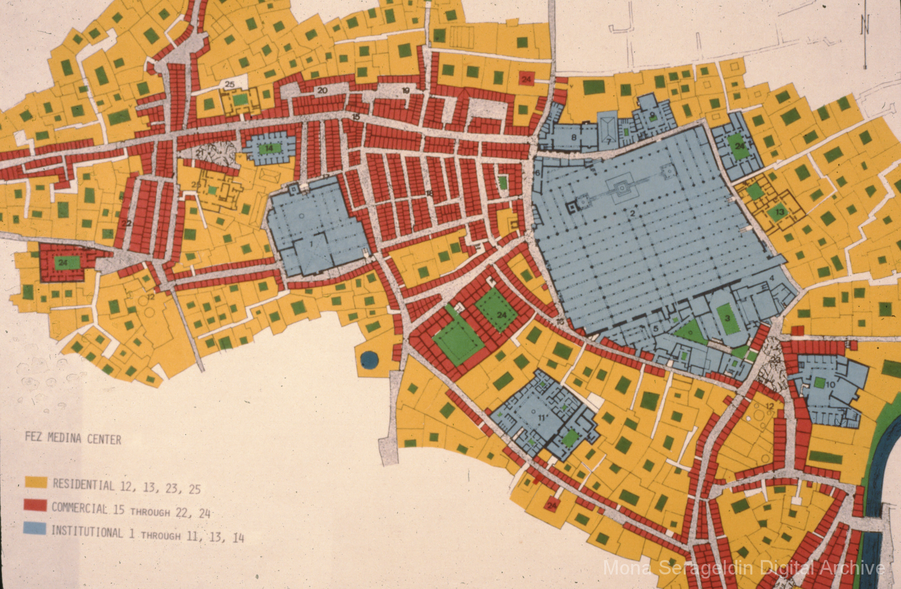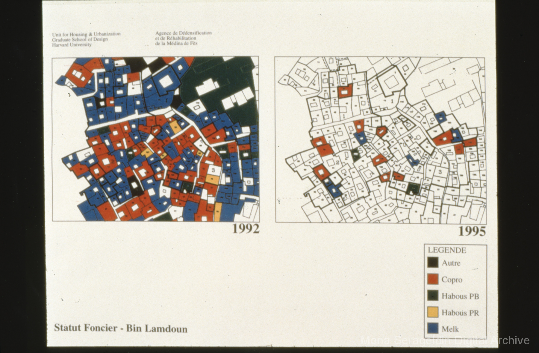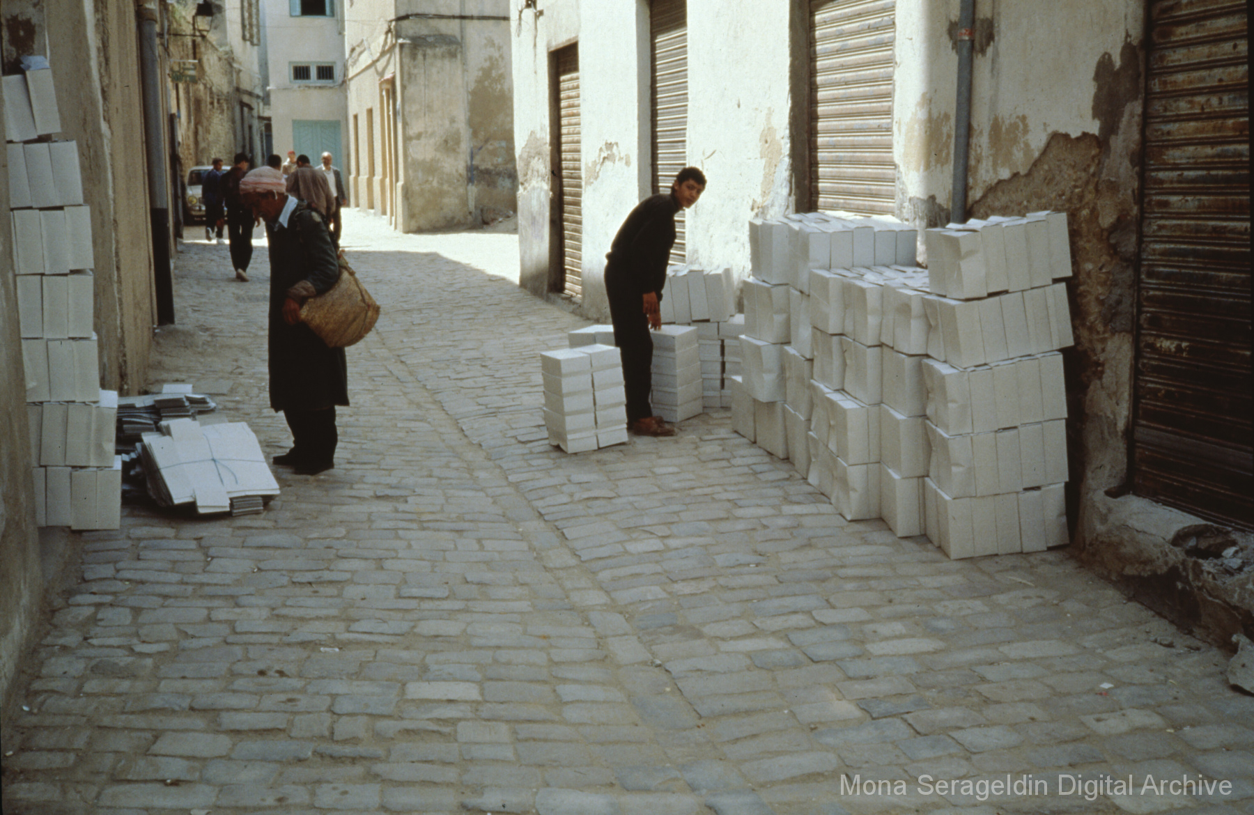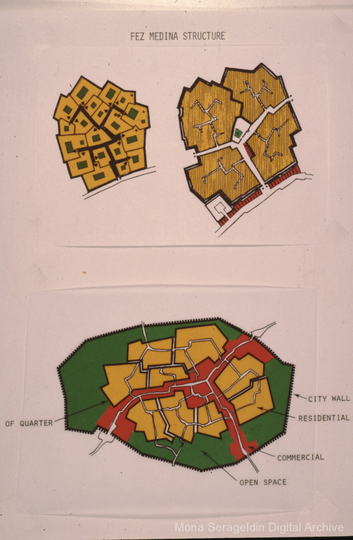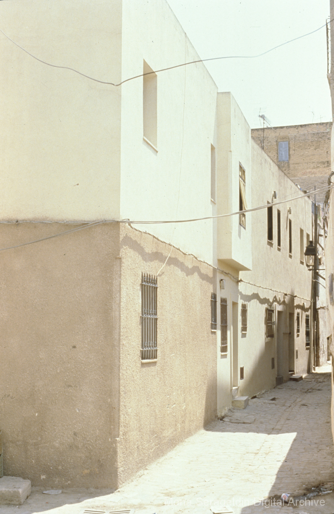 The following 2 galleries represent Mona Serageldin’s analog slide collection on historic districts, as arranged in box M06, “Hafsia, Tunis / Fez Medina,” and consist of color photographs and charts for presentation slides. The collection documents conditions in historic urban regions and corresponding revitalization projects. Images include housing overviews and details, streetscapes, marketplaces and mosques, and community members, as well as planning maps and graphics.