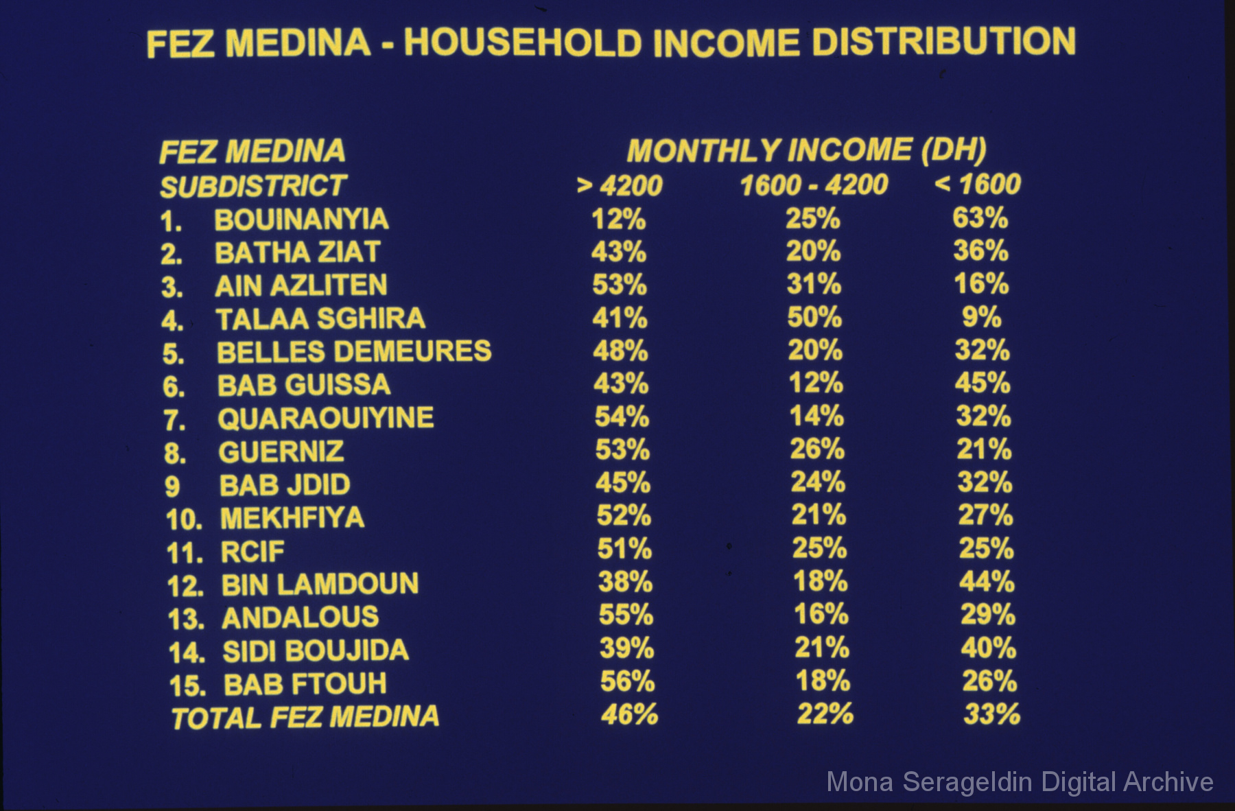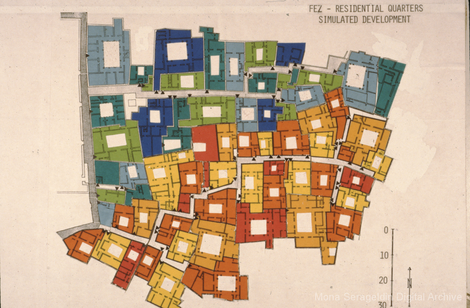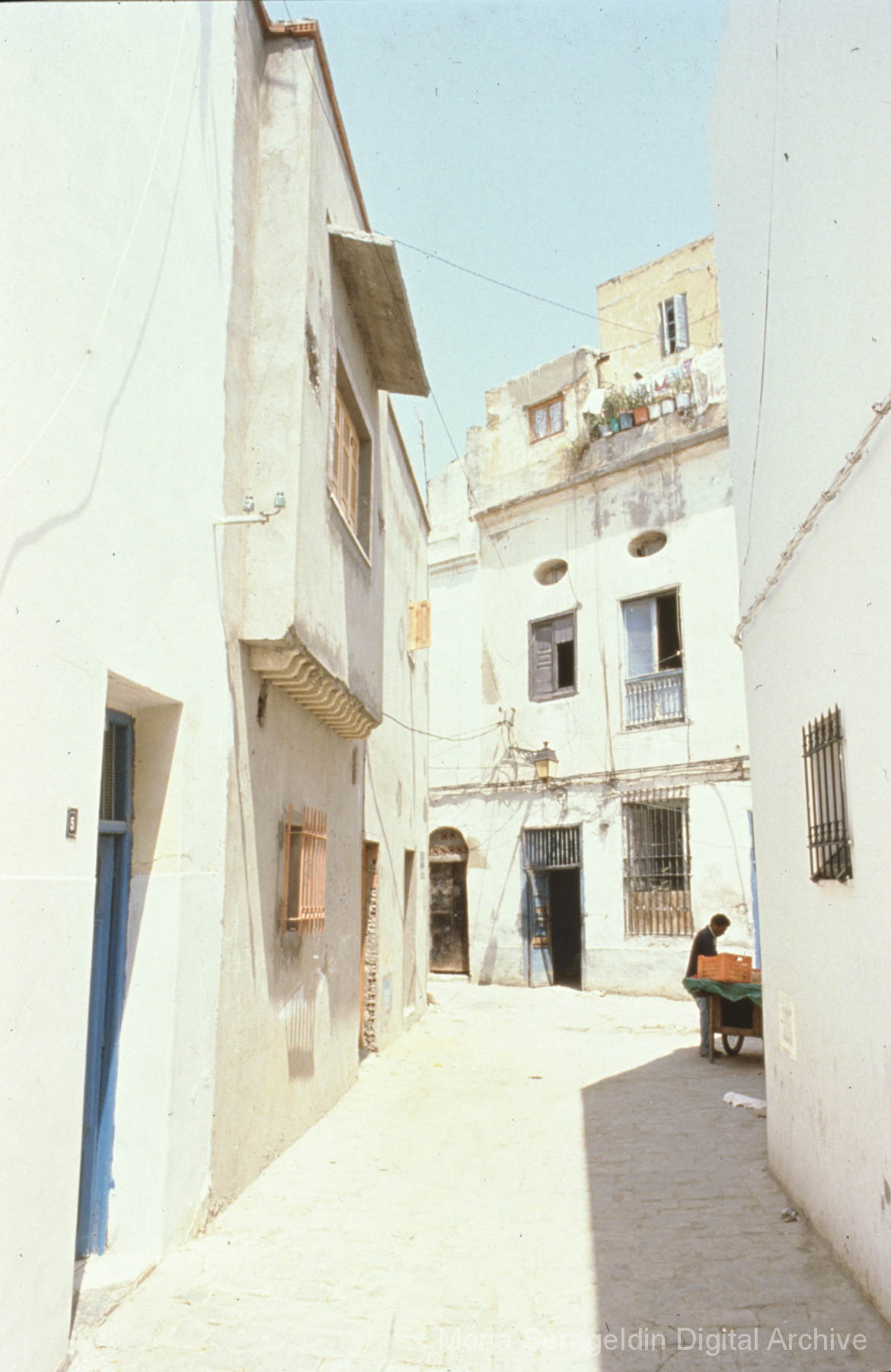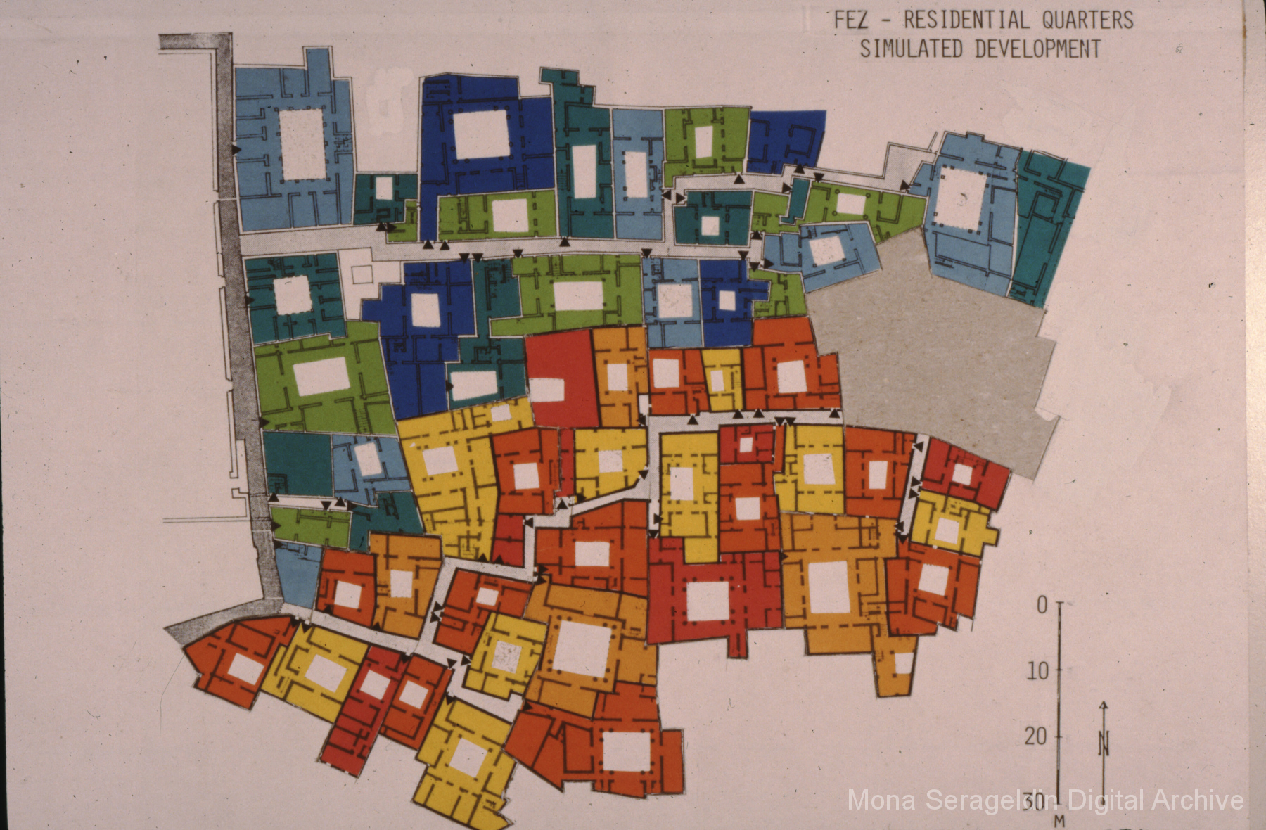 The following 2 galleries represent Mona Serageldin’s analog slide collection on historic districts, as arranged in box M06, “Hafsia, Tunis / Fez Medina,” and consist of color photographs and charts for presentation slides. The collection documents conditions in historic urban regions and corresponding revitalization projects. Images include housing overviews and details, streetscapes, marketplaces and mosques, and community members, as well as planning maps and graphics.
