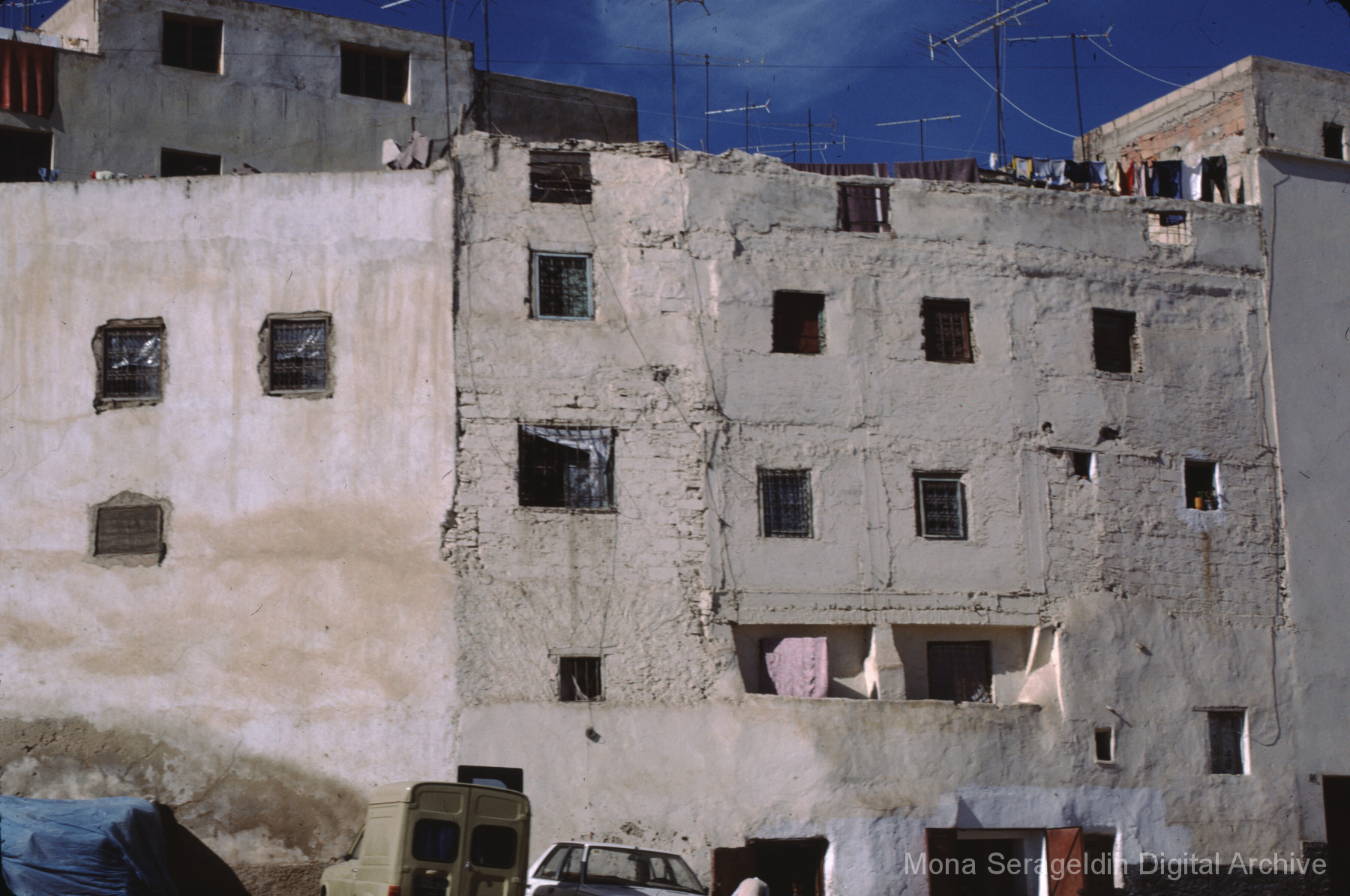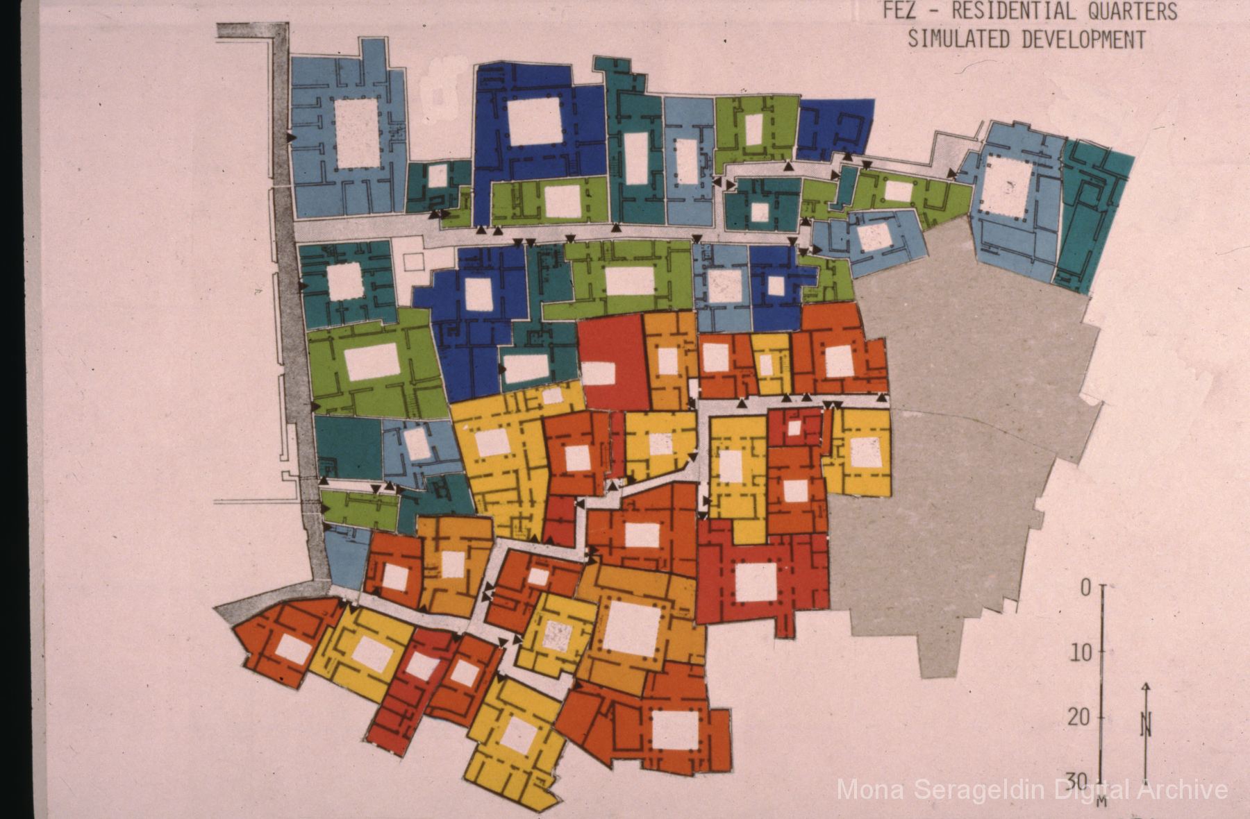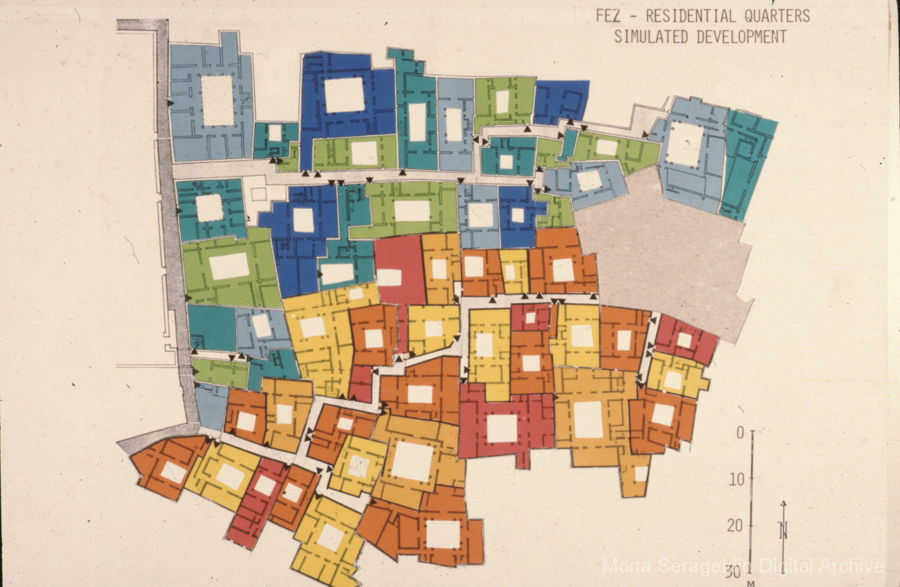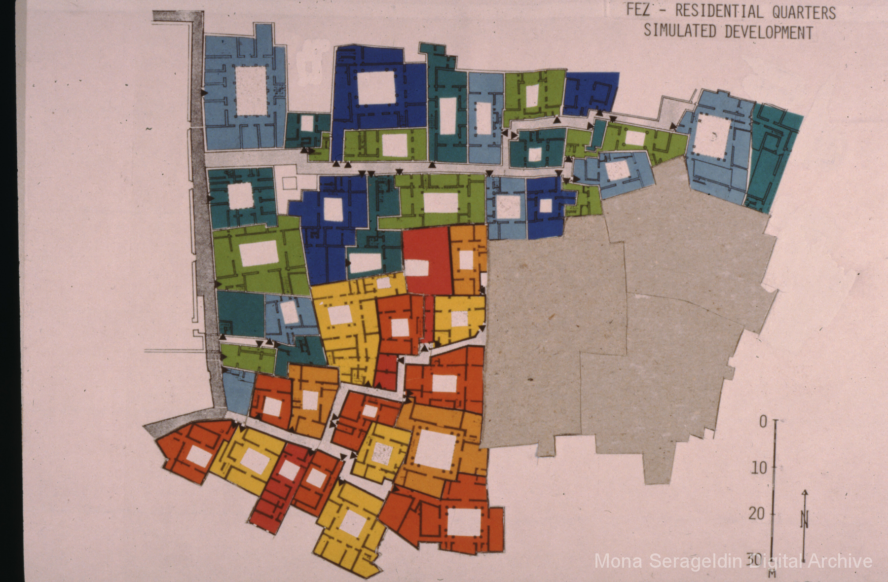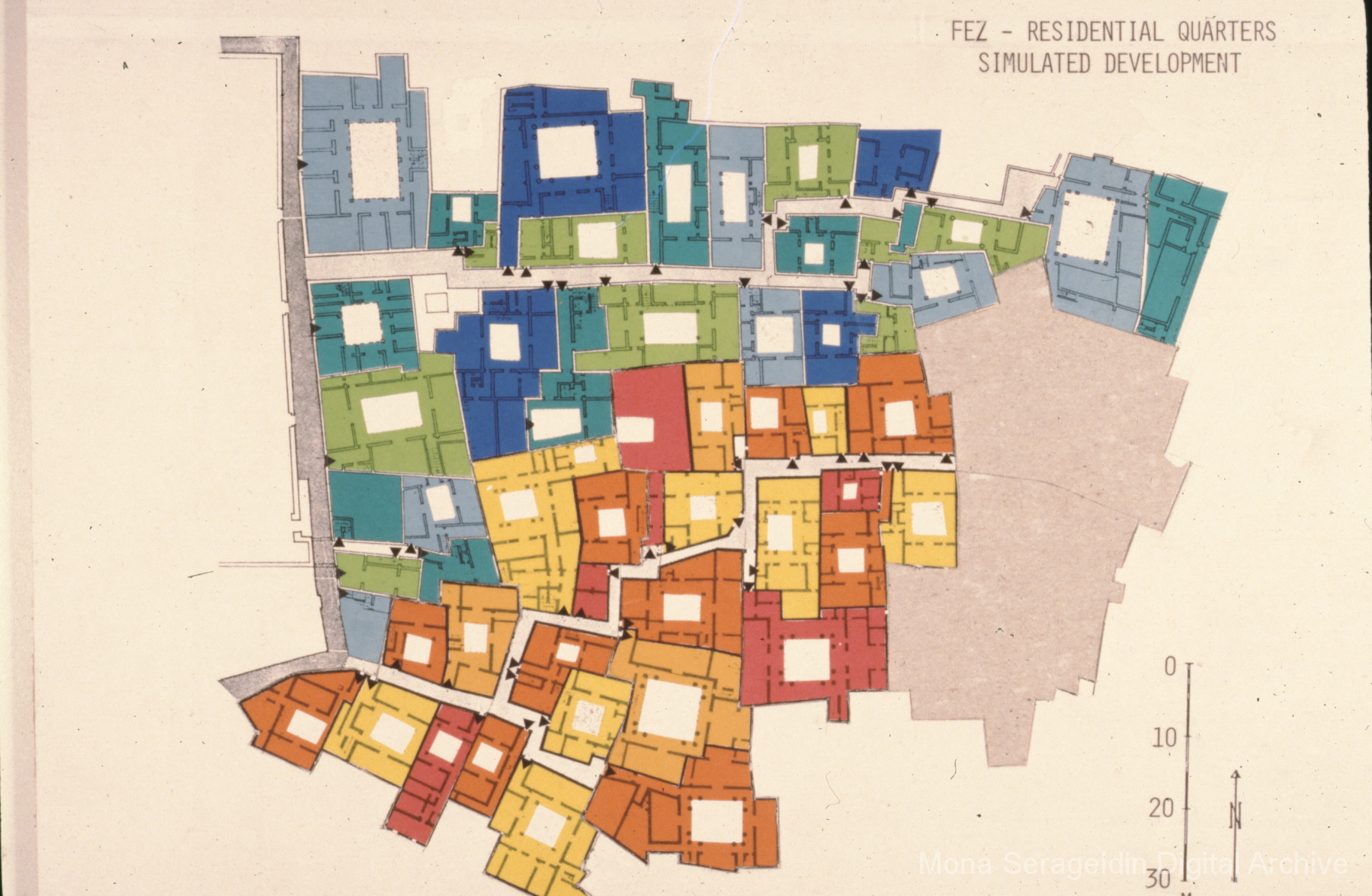 The following 2 galleries represent Mona Serageldin’s analog slide collection on historic districts, as arranged in box M06, “Hafsia, Tunis / Fez Medina,” and consist of color photographs and charts for presentation slides. The collection documents conditions in historic urban regions and corresponding revitalization projects. Images include housing overviews and details, streetscapes, marketplaces and mosques, and community members, as well as planning maps and graphics.