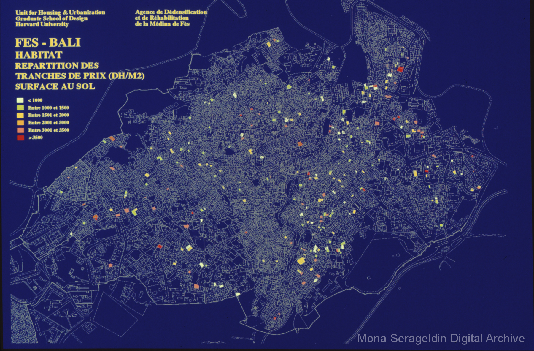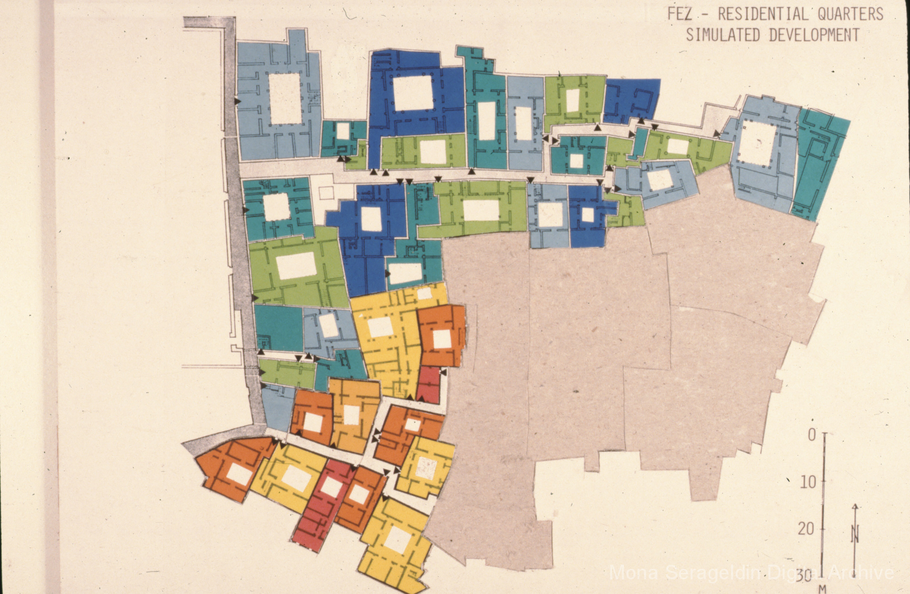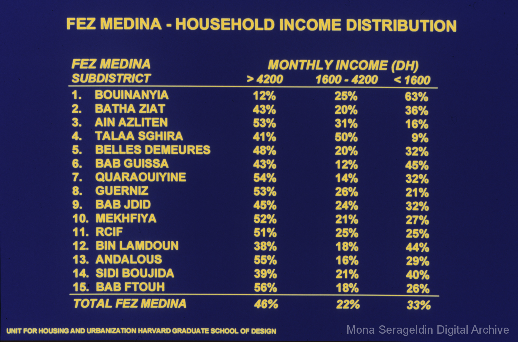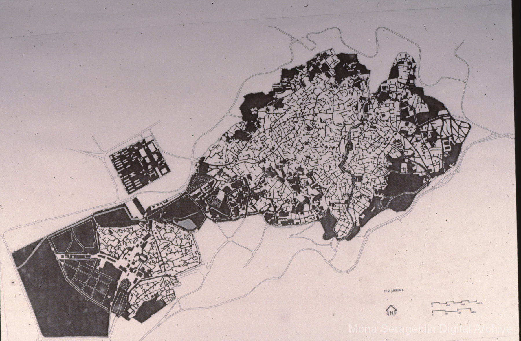 The following 2 galleries represent Mona Serageldin’s analog slide collection on historic districts, as arranged in box M06, “Hafsia, Tunis / Fez Medina,” and consist of color photographs and charts for presentation slides. The collection documents conditions in historic urban regions and corresponding revitalization projects. Images include housing overviews and details, streetscapes, marketplaces and mosques, and community members, as well as planning maps and graphics.