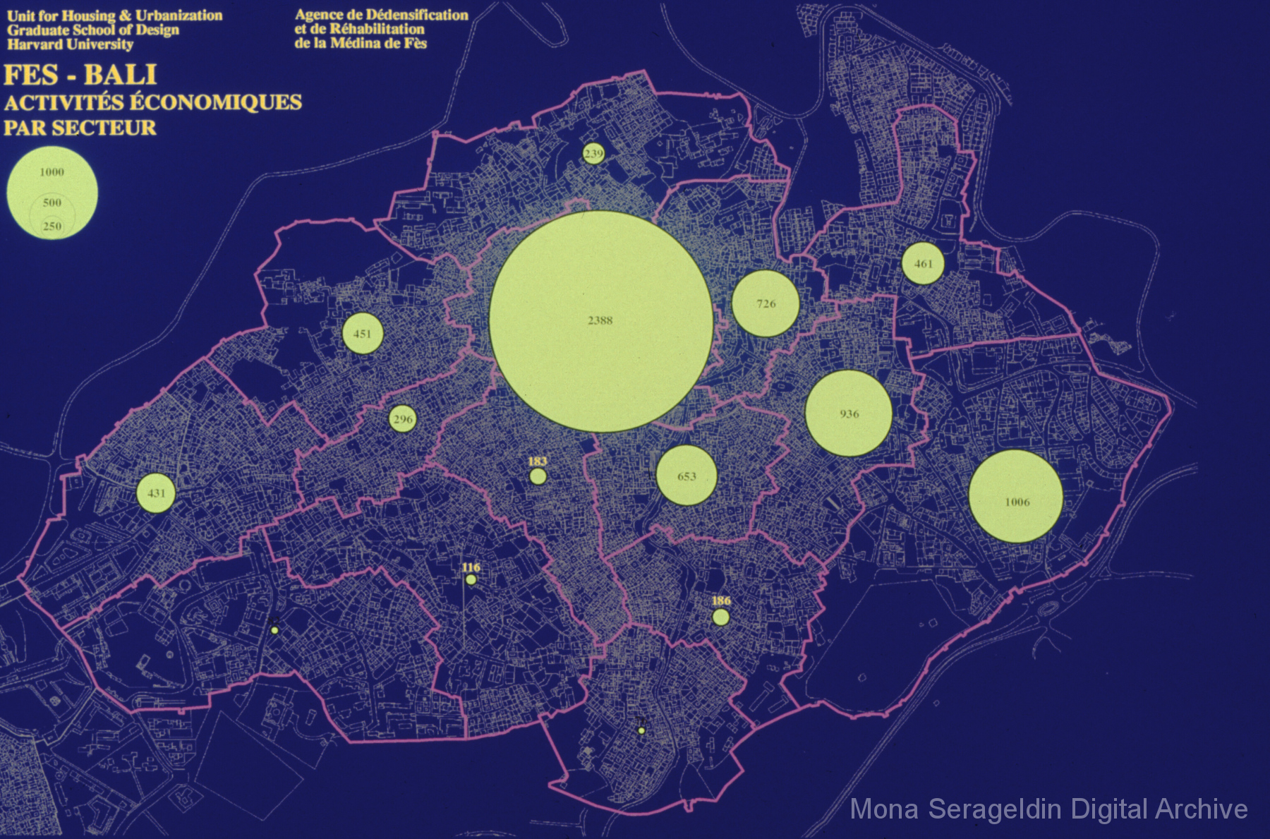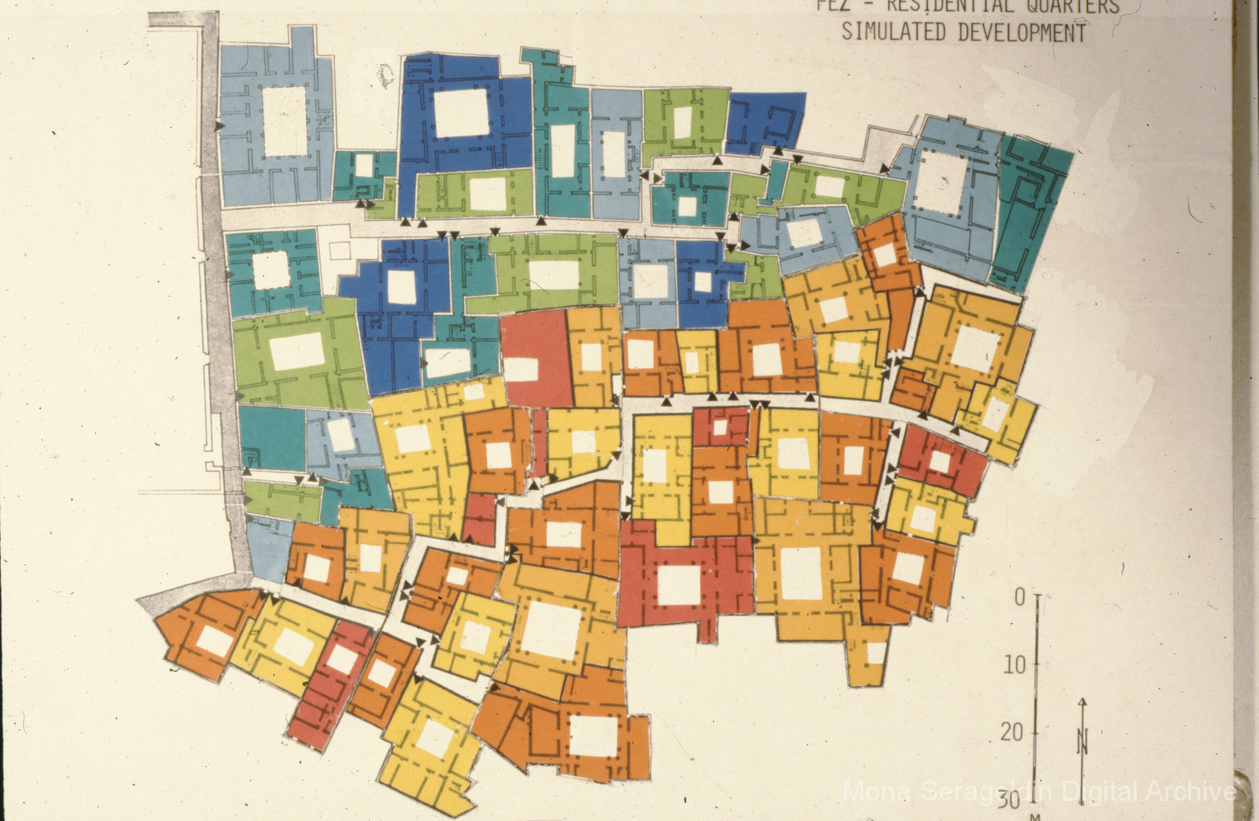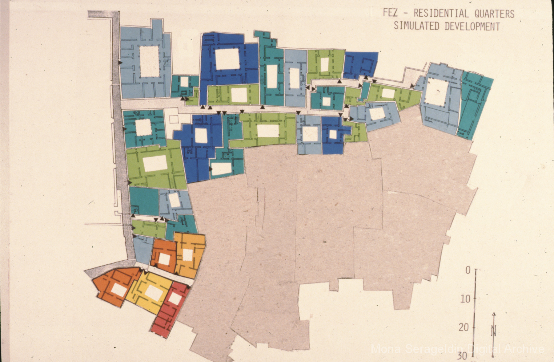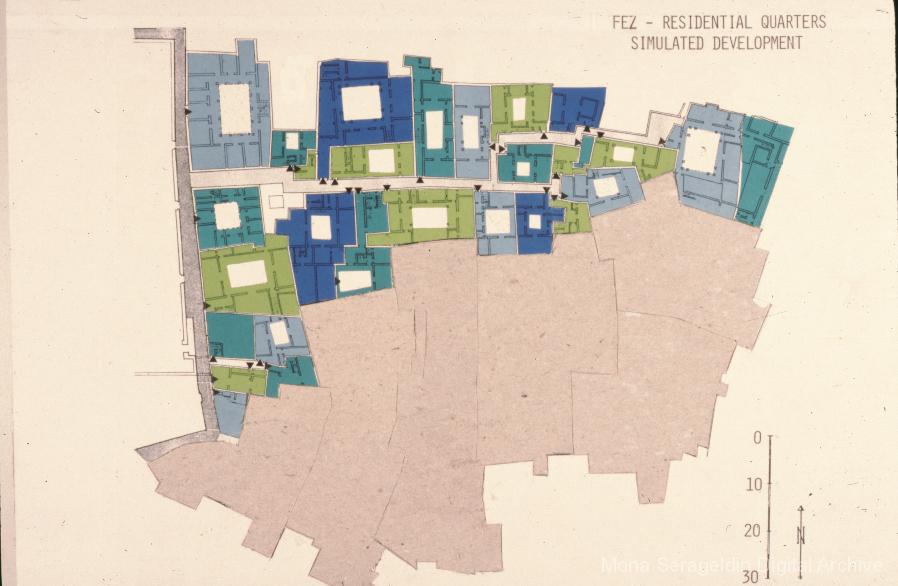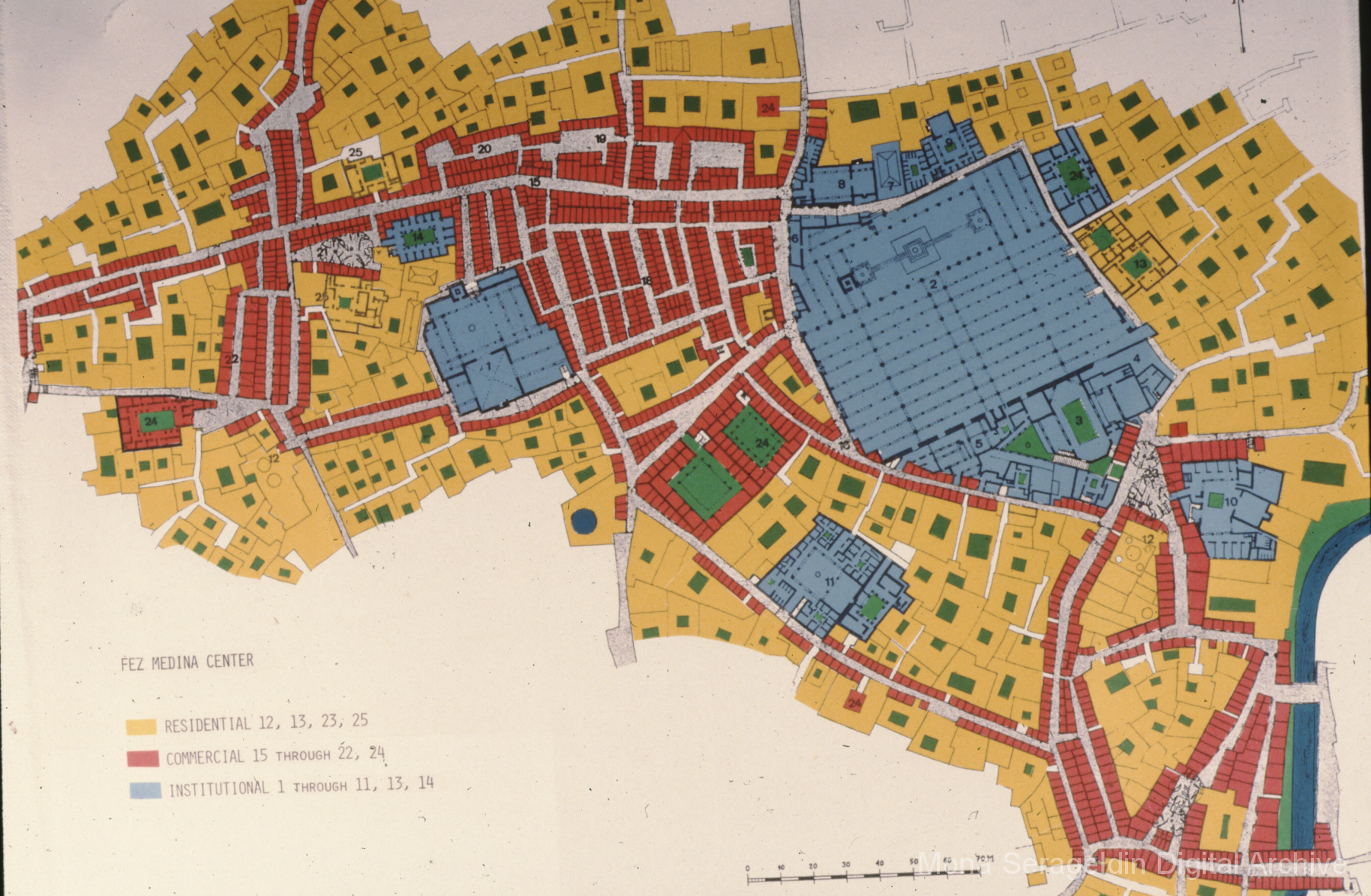The following 2 galleries represent Mona Serageldin’s analog slide collection on historic districts, as arranged in box M06, “Hafsia, Tunis / Fez Medina,” and consist of color photographs and charts for presentation slides. The collection documents conditions in historic urban regions and corresponding revitalization projects. Images include housing overviews and details, streetscapes, marketplaces and mosques, and community members, as well as planning maps and graphics.