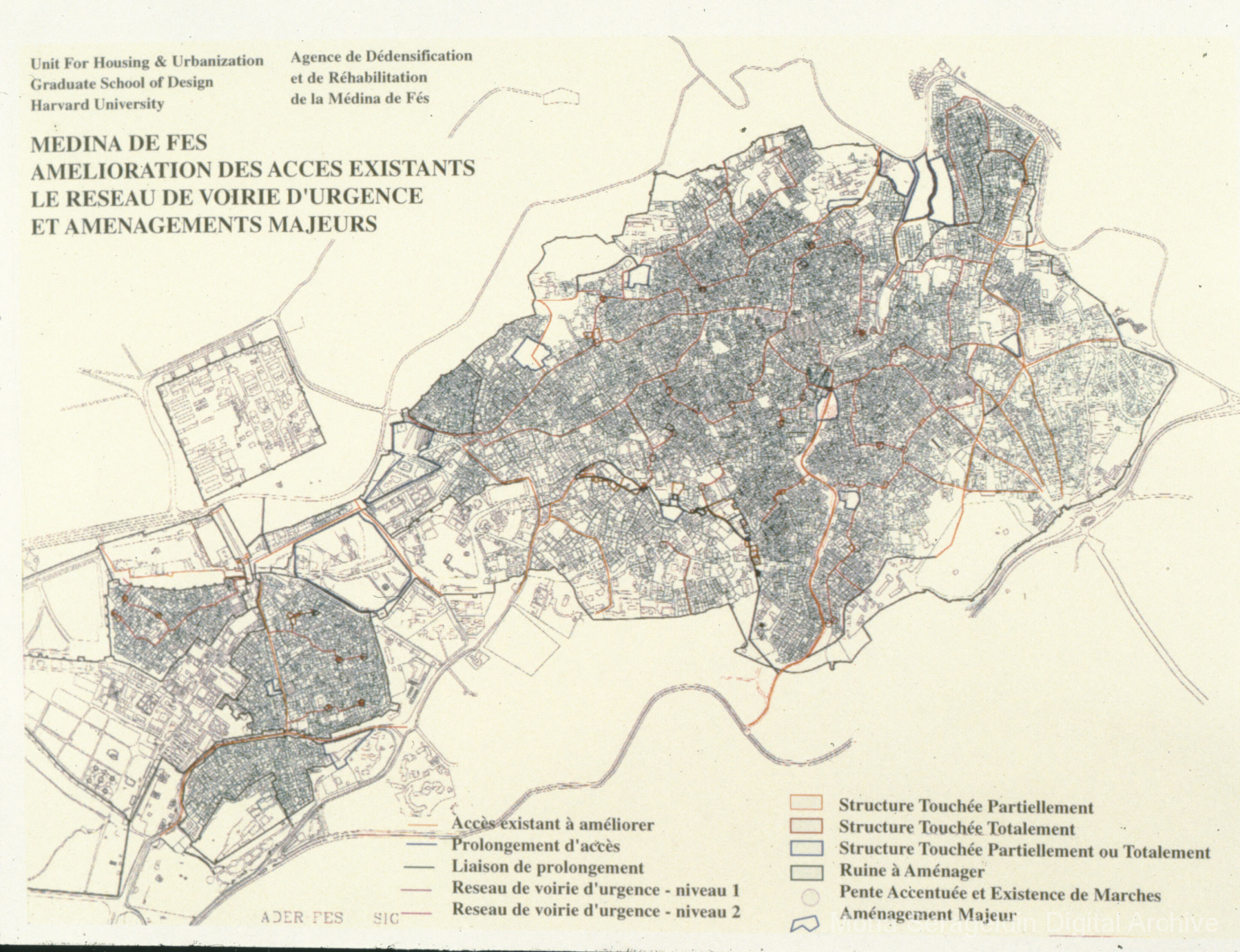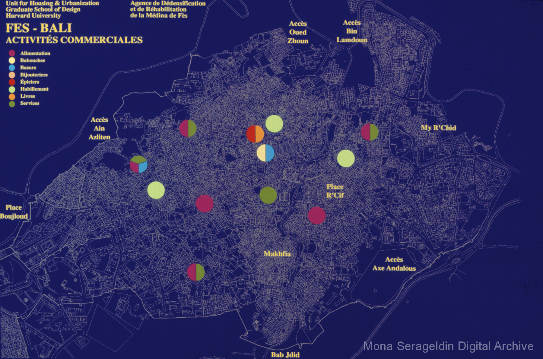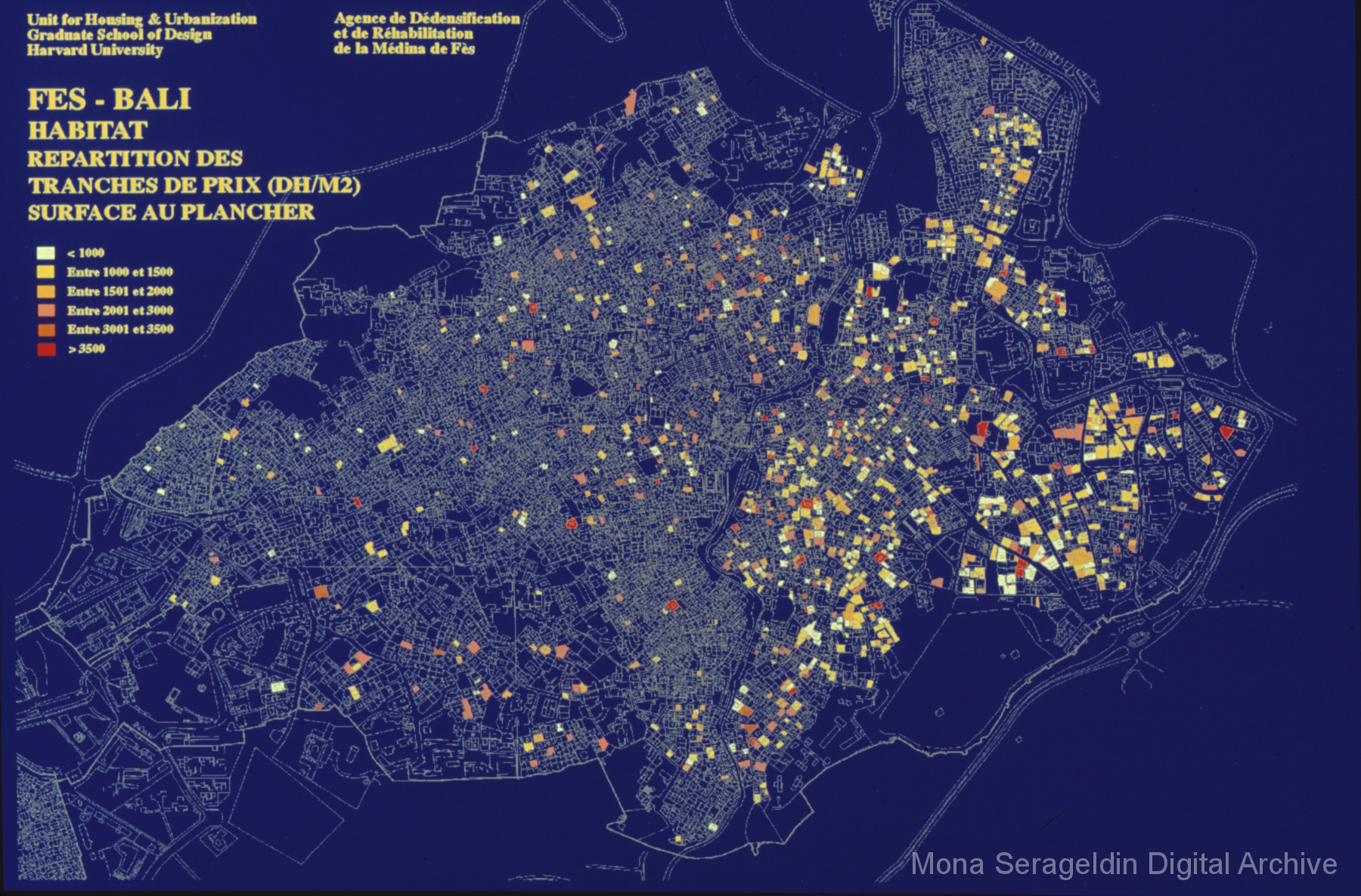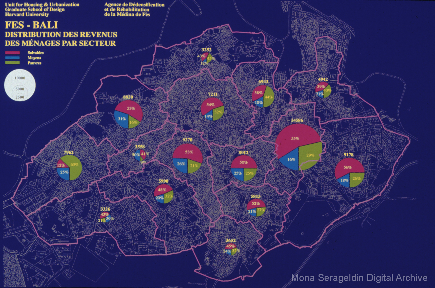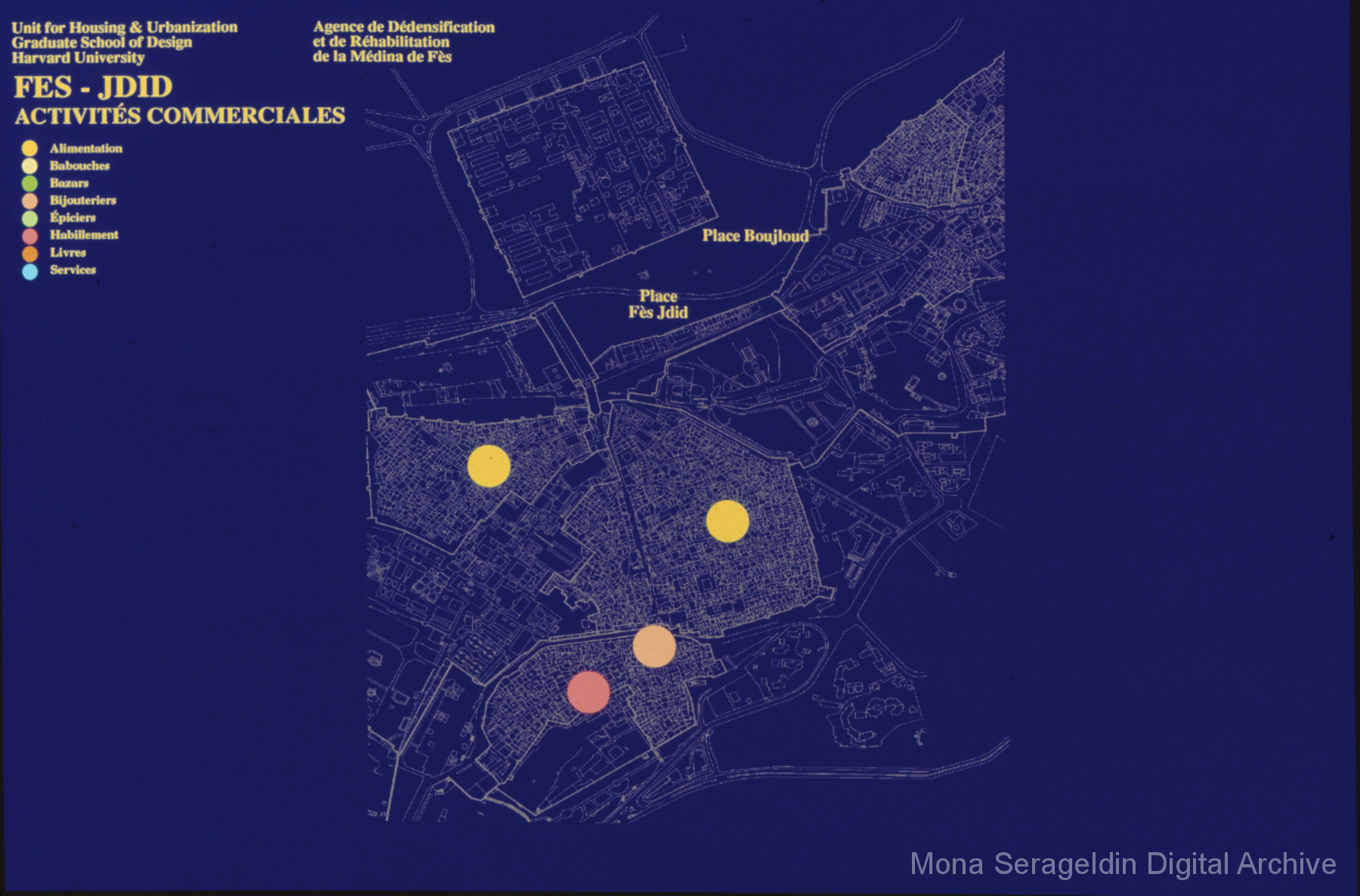 The following 2 galleries represent Mona Serageldin’s analog slide collection on historic districts, as arranged in box M06, “Hafsia, Tunis / Fez Medina,” and consist of color photographs and charts for presentation slides. The collection documents conditions in historic urban regions and corresponding revitalization projects. Images include housing overviews and details, streetscapes, marketplaces and mosques, and community members, as well as planning maps and graphics.