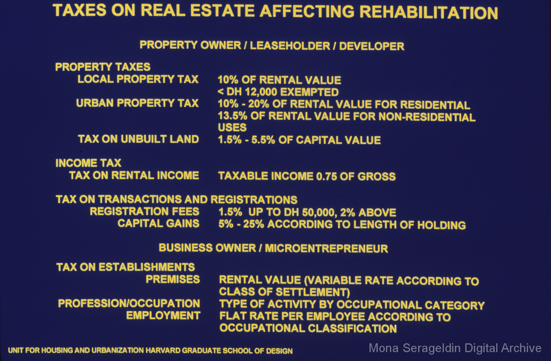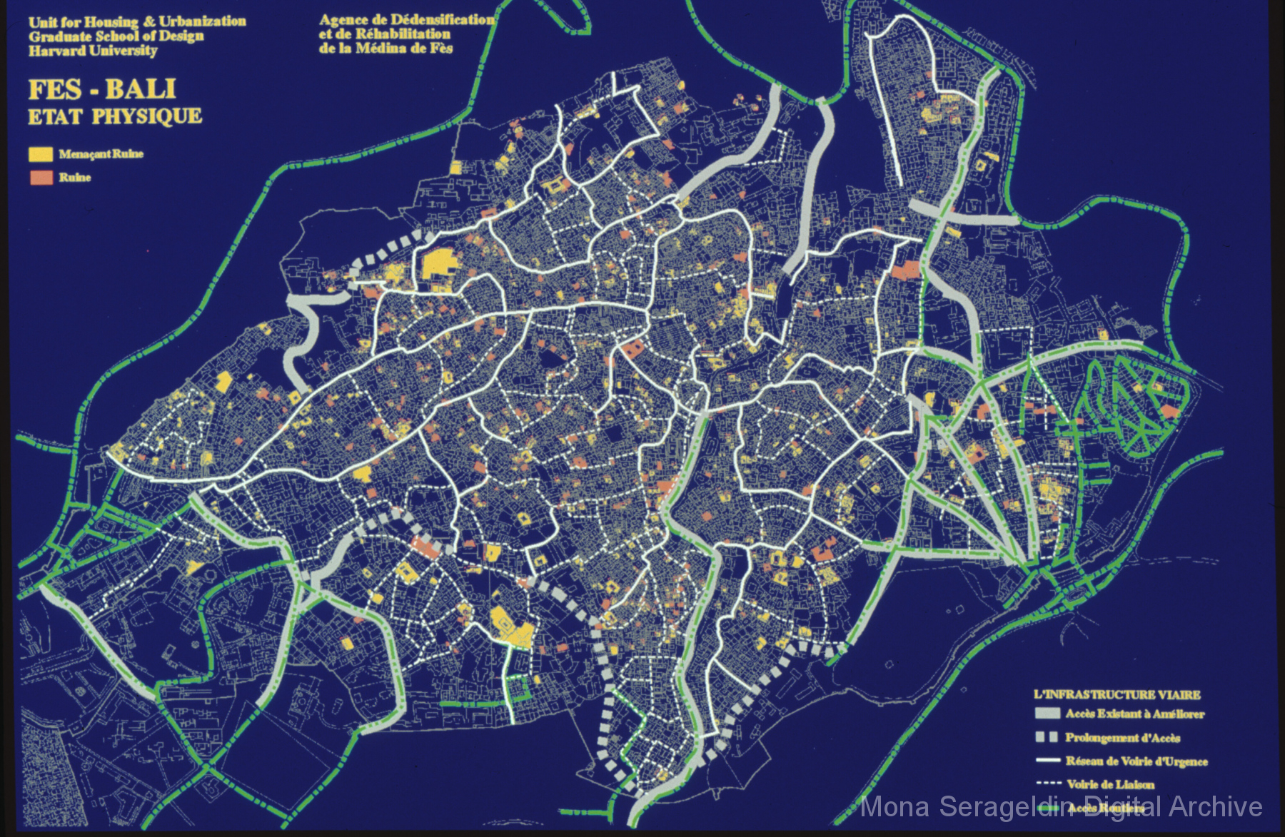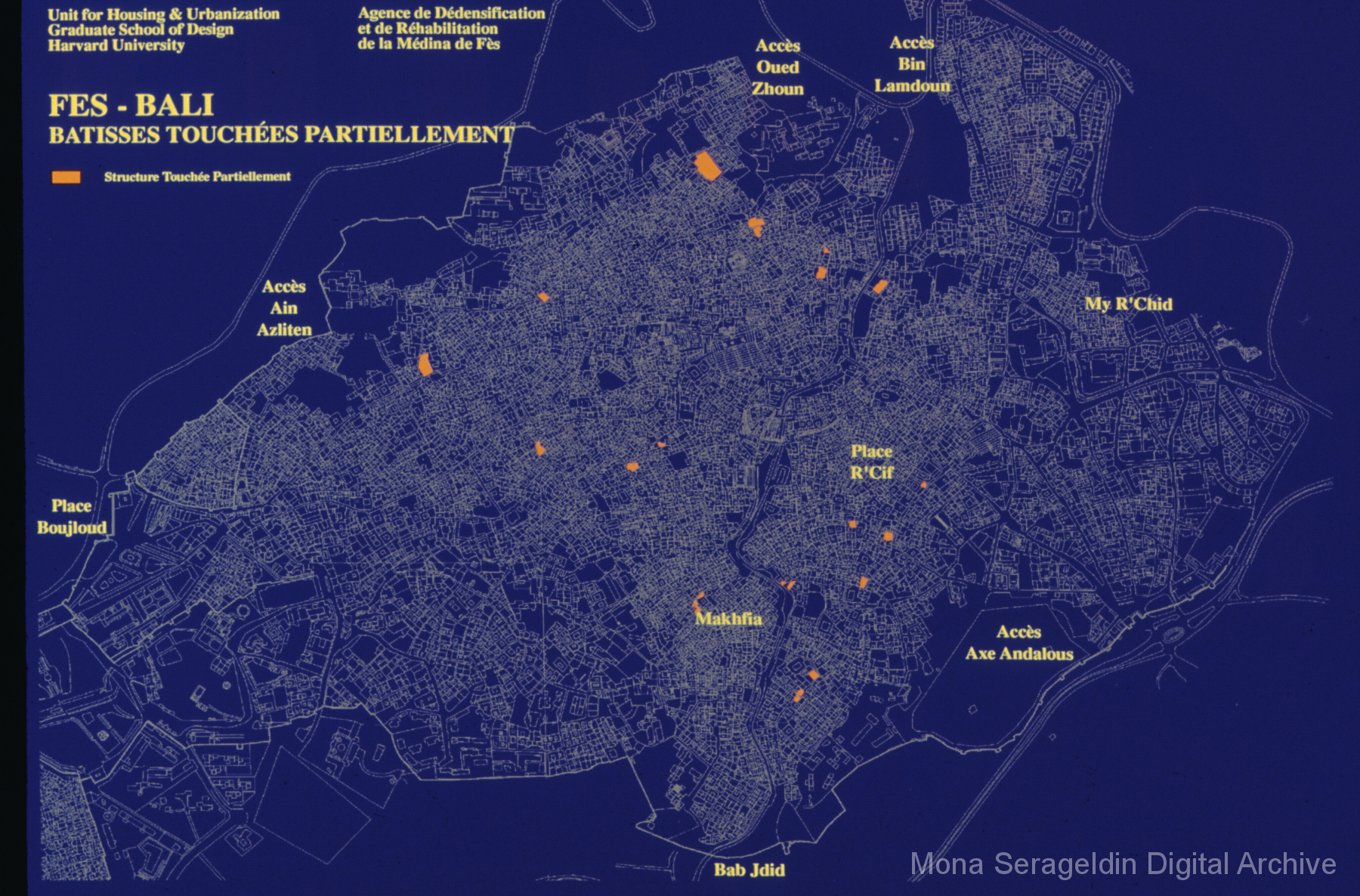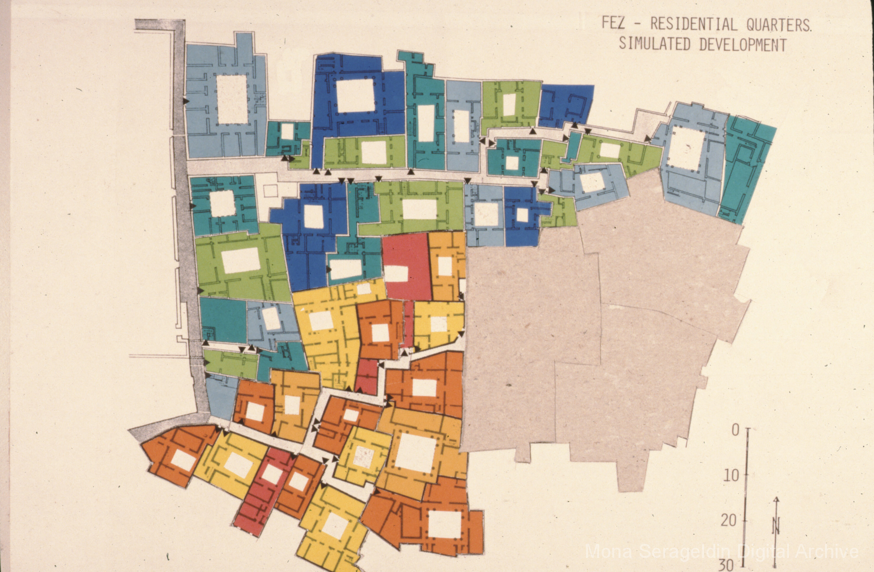 The following 2 galleries represent Mona Serageldin’s analog slide collection on historic districts, as arranged in box M06, “Hafsia, Tunis / Fez Medina,” and consist of color photographs and charts for presentation slides. The collection documents conditions in historic urban regions and corresponding revitalization projects. Images include housing overviews and details, streetscapes, marketplaces and mosques, and community members, as well as planning maps and graphics.