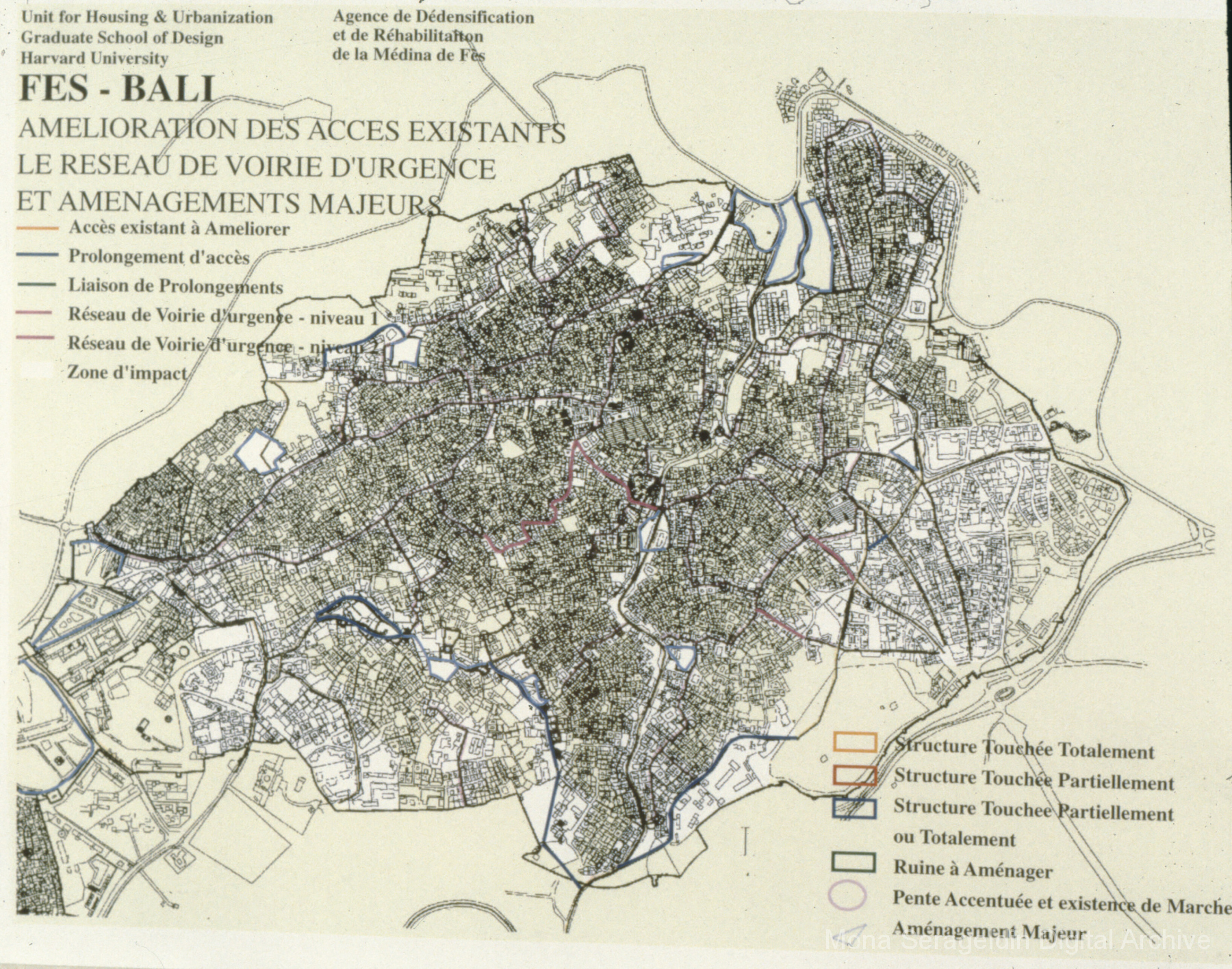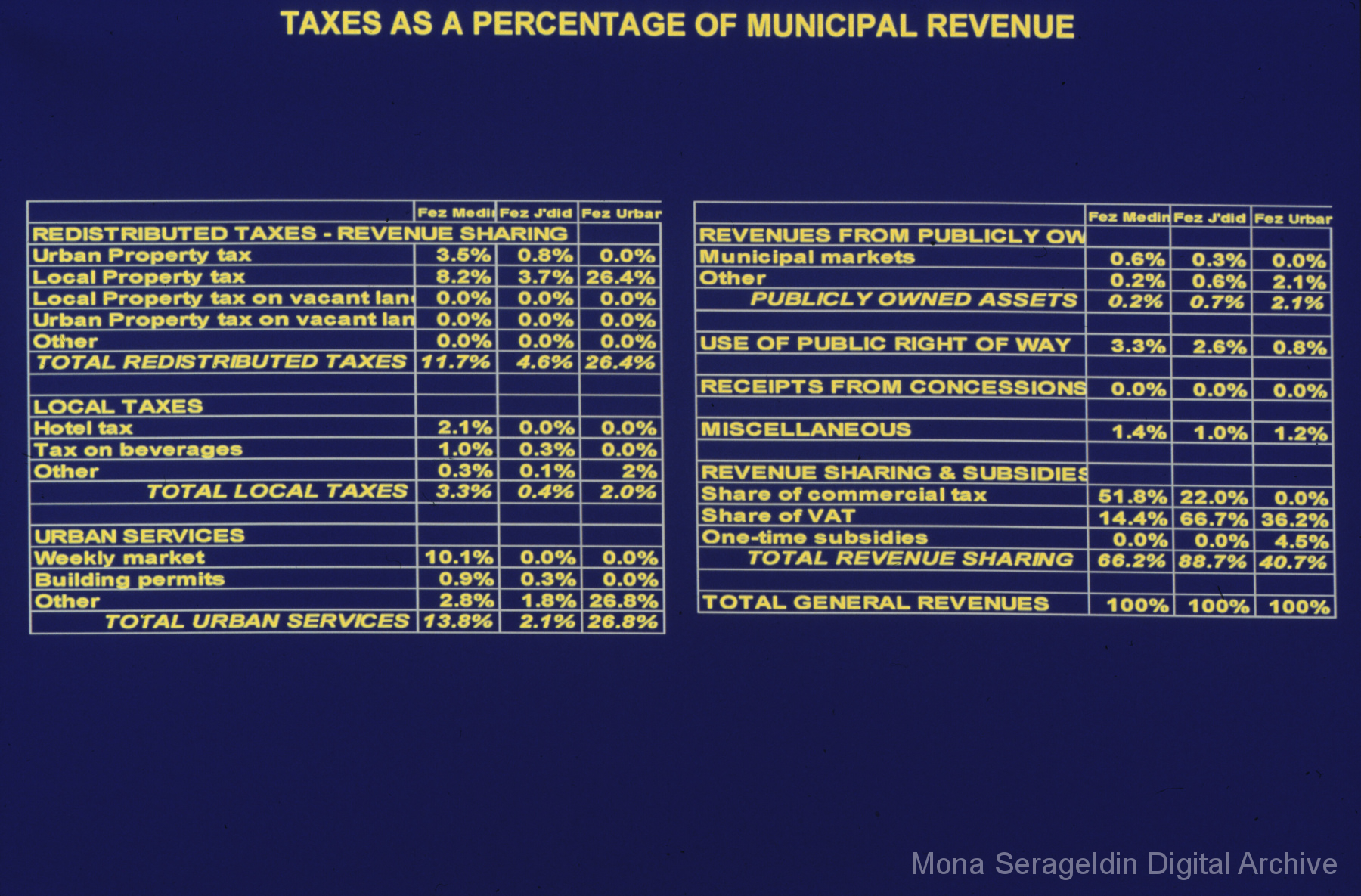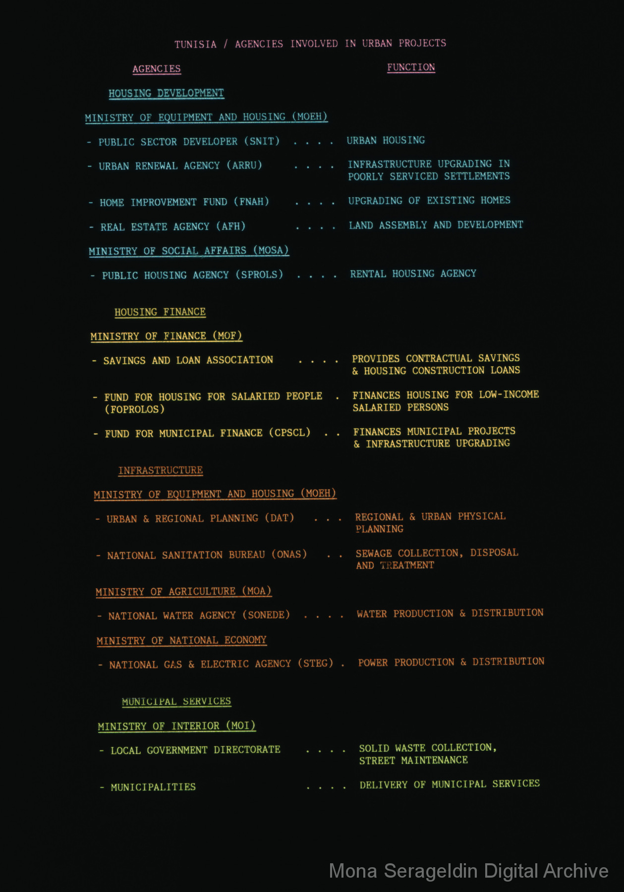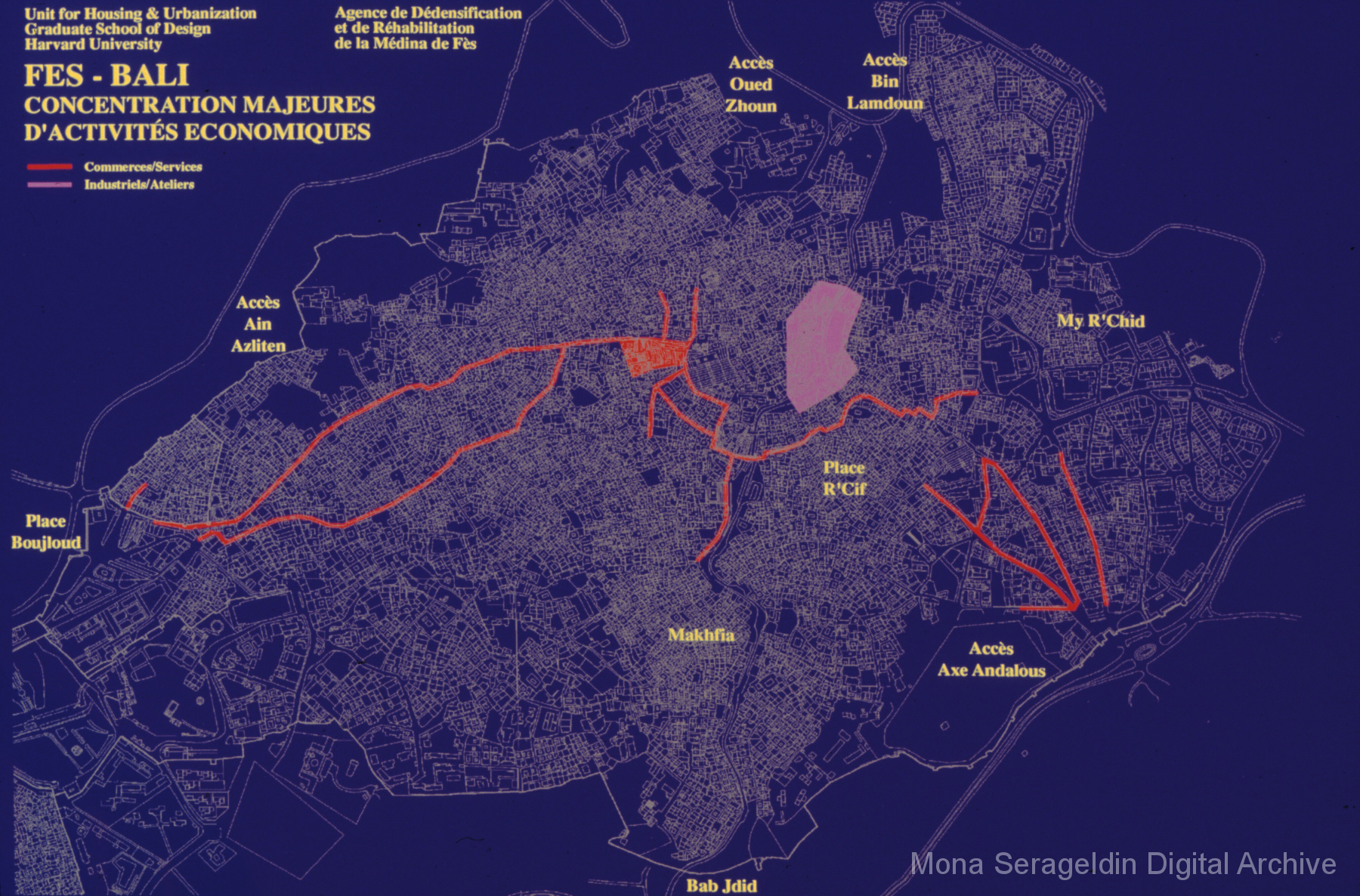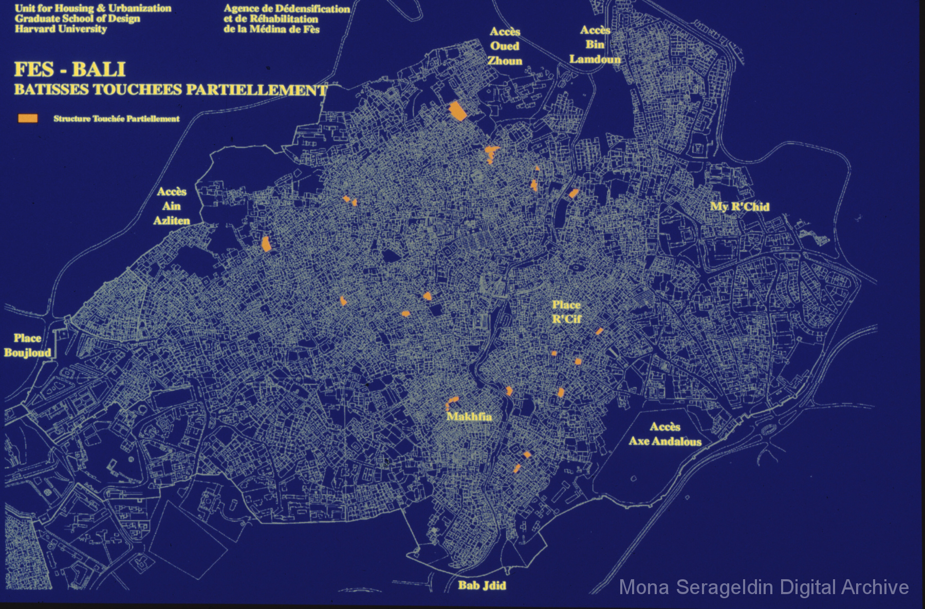The following 2 galleries represent Mona Serageldin’s analog slide collection on historic districts, as arranged in box M06, “Hafsia, Tunis / Fez Medina,” and consist of color photographs and charts for presentation slides. The collection documents conditions in historic urban regions and corresponding revitalization projects. Images include housing overviews and details, streetscapes, marketplaces and mosques, and community members, as well as planning maps and graphics.