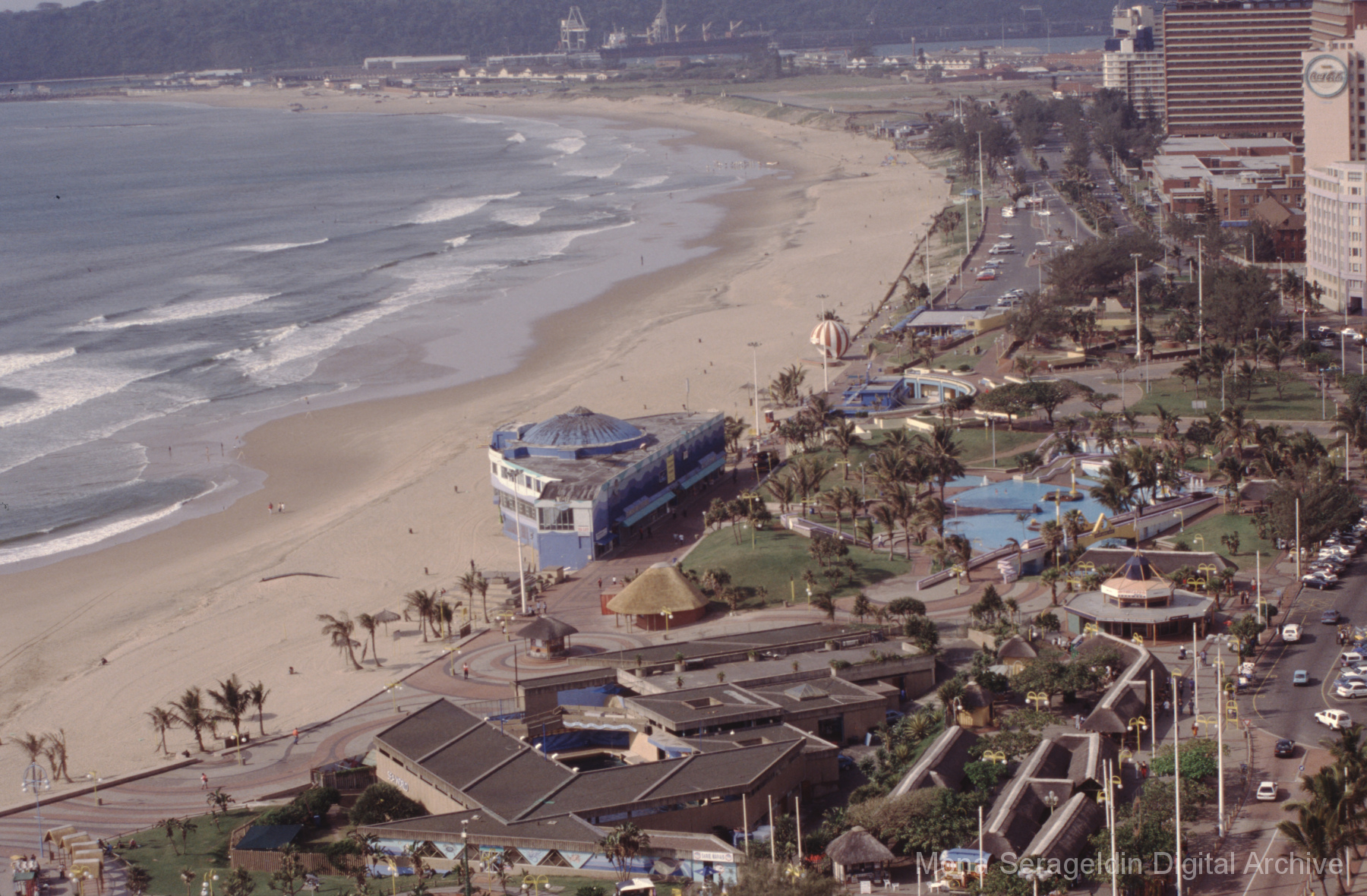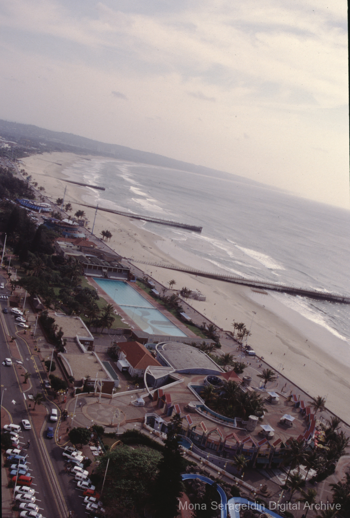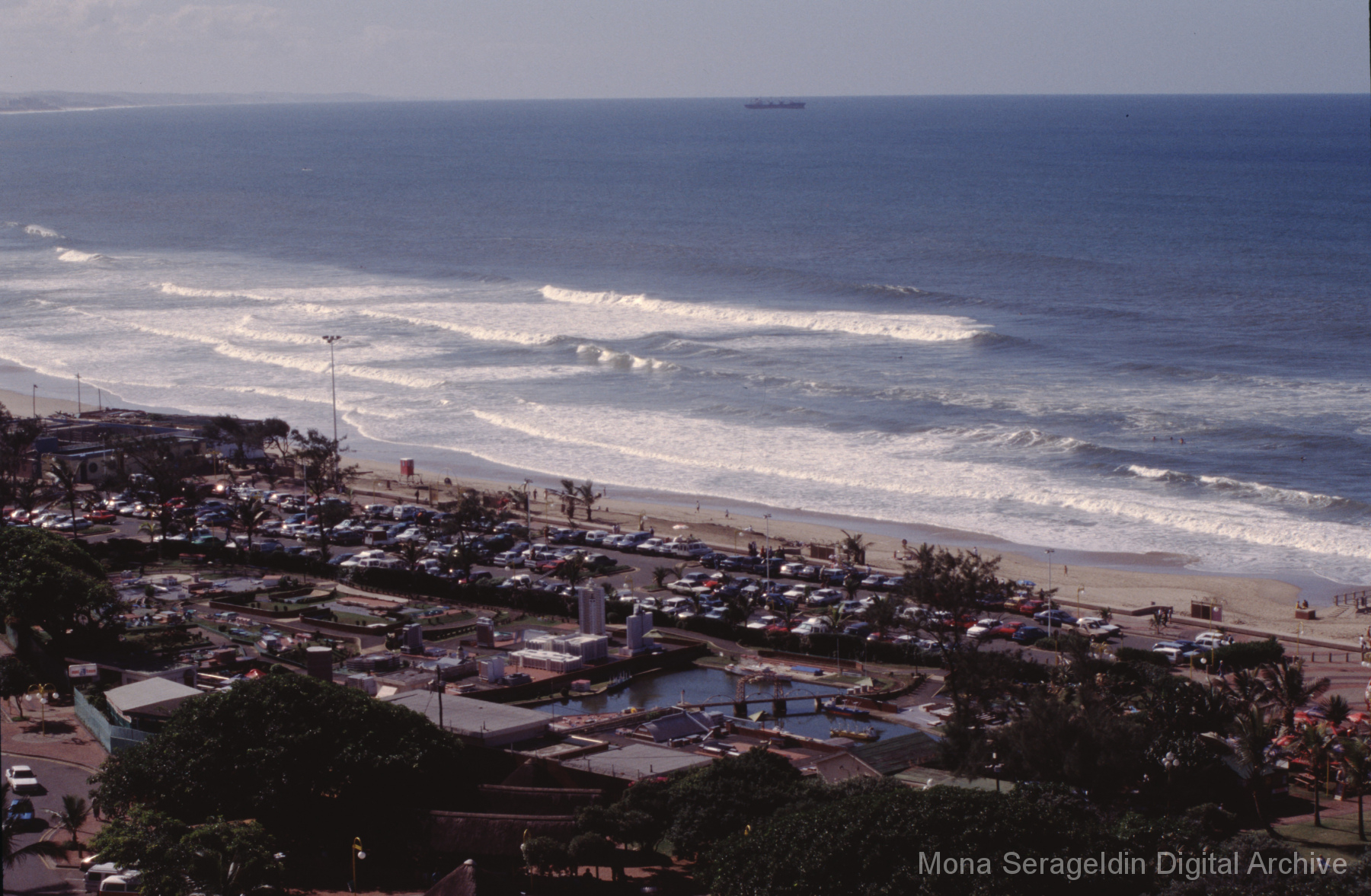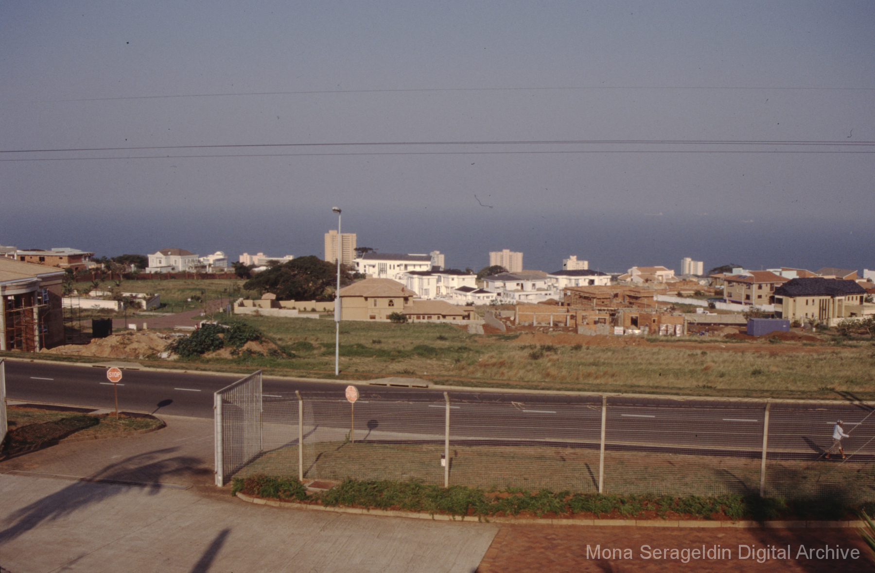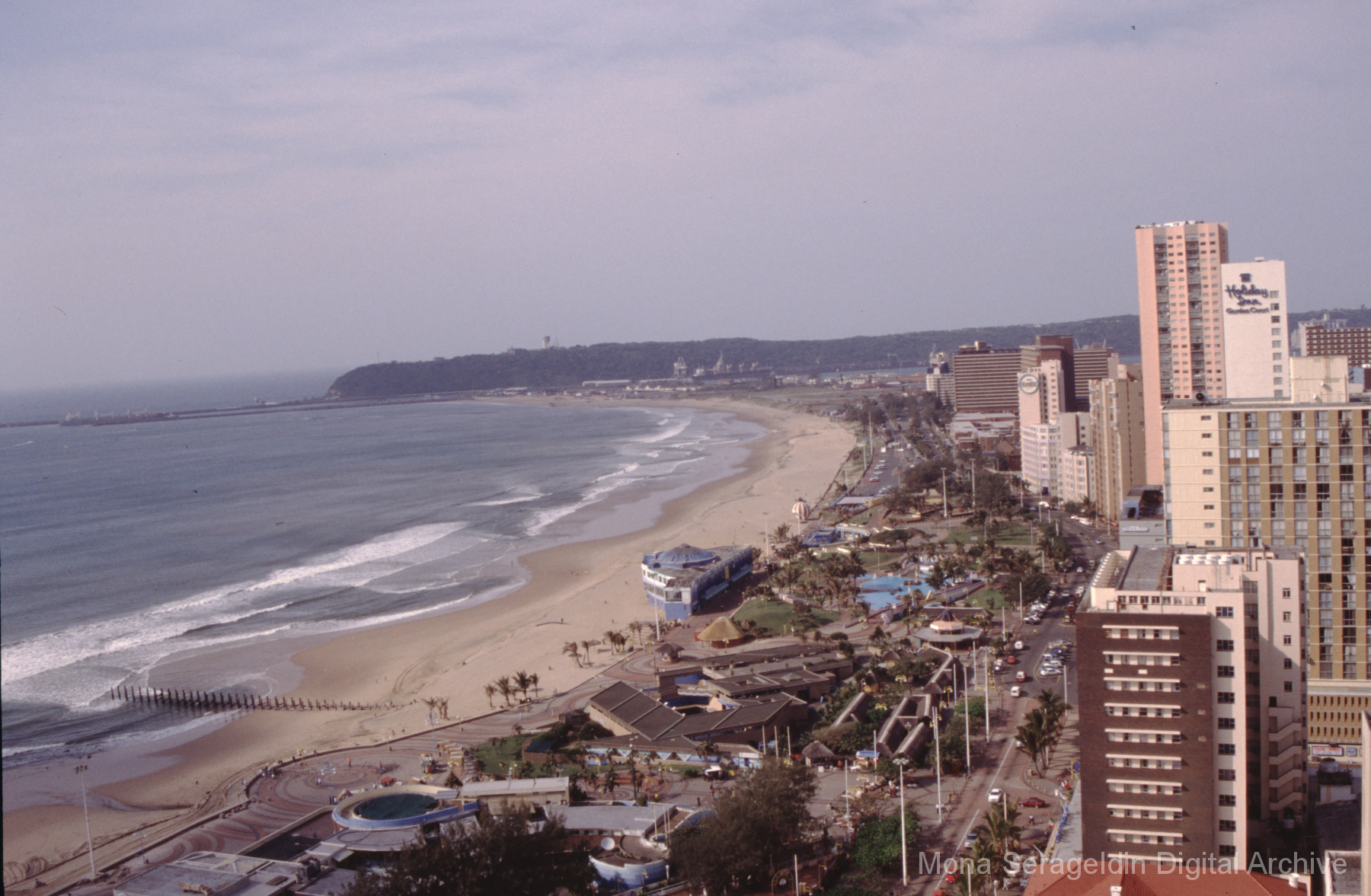 Photographs of the coastal city of Durban in the province of KwaZulu-Natal in South Africa from 1998-2000 and 2002. The gallery documents the waterfront region of the city and the metro area extension to the south, including views of old housing and new private housing developments. Images show aerial views of the region and resort beachfront, overviews of housing, roadways, and natural landscapes, and interiors of a new shopping mall.