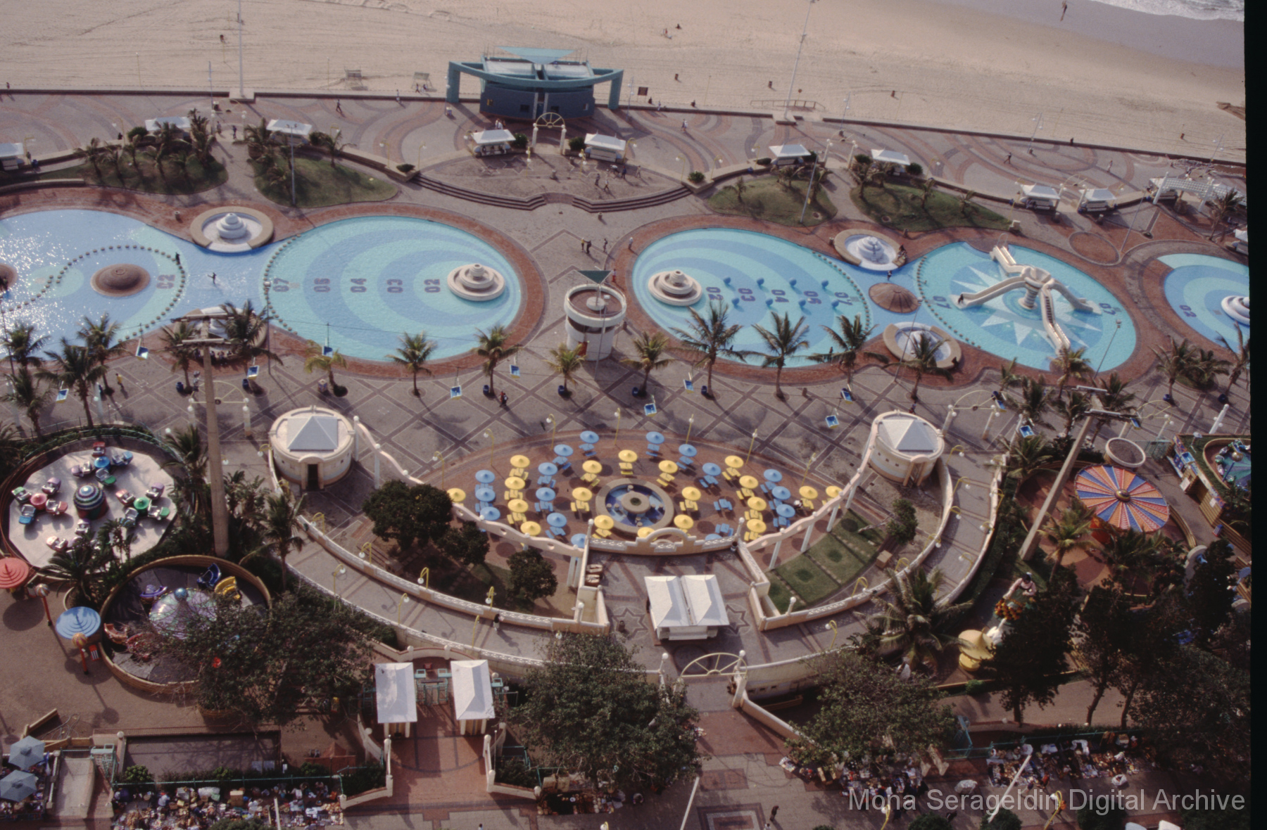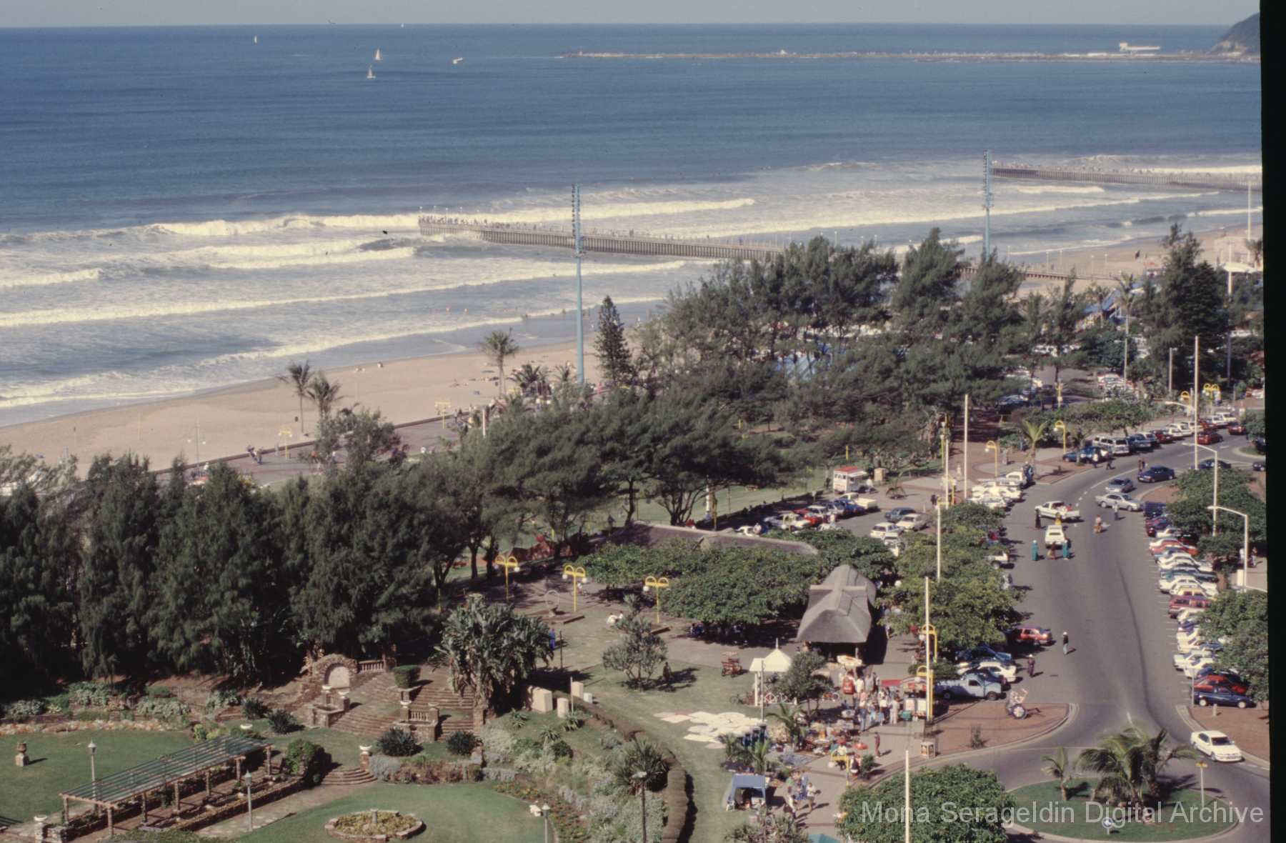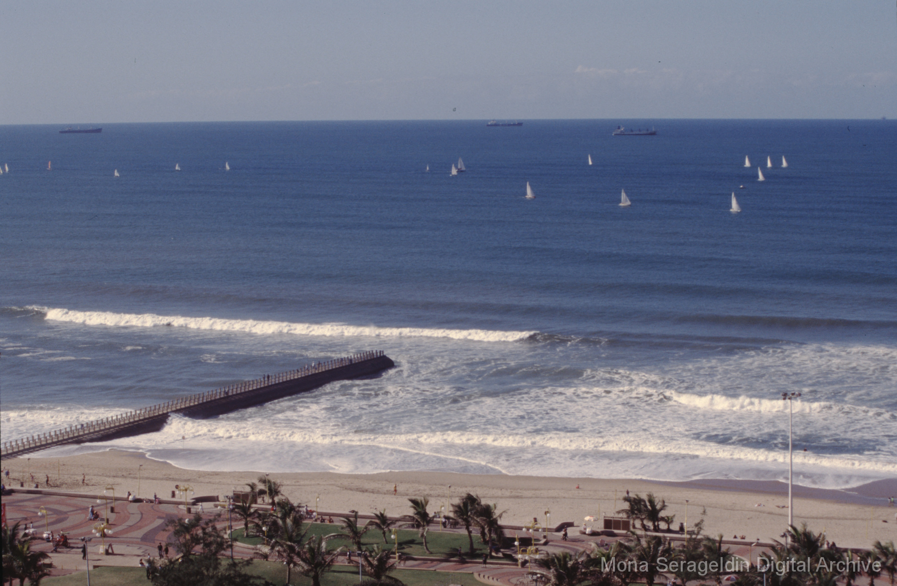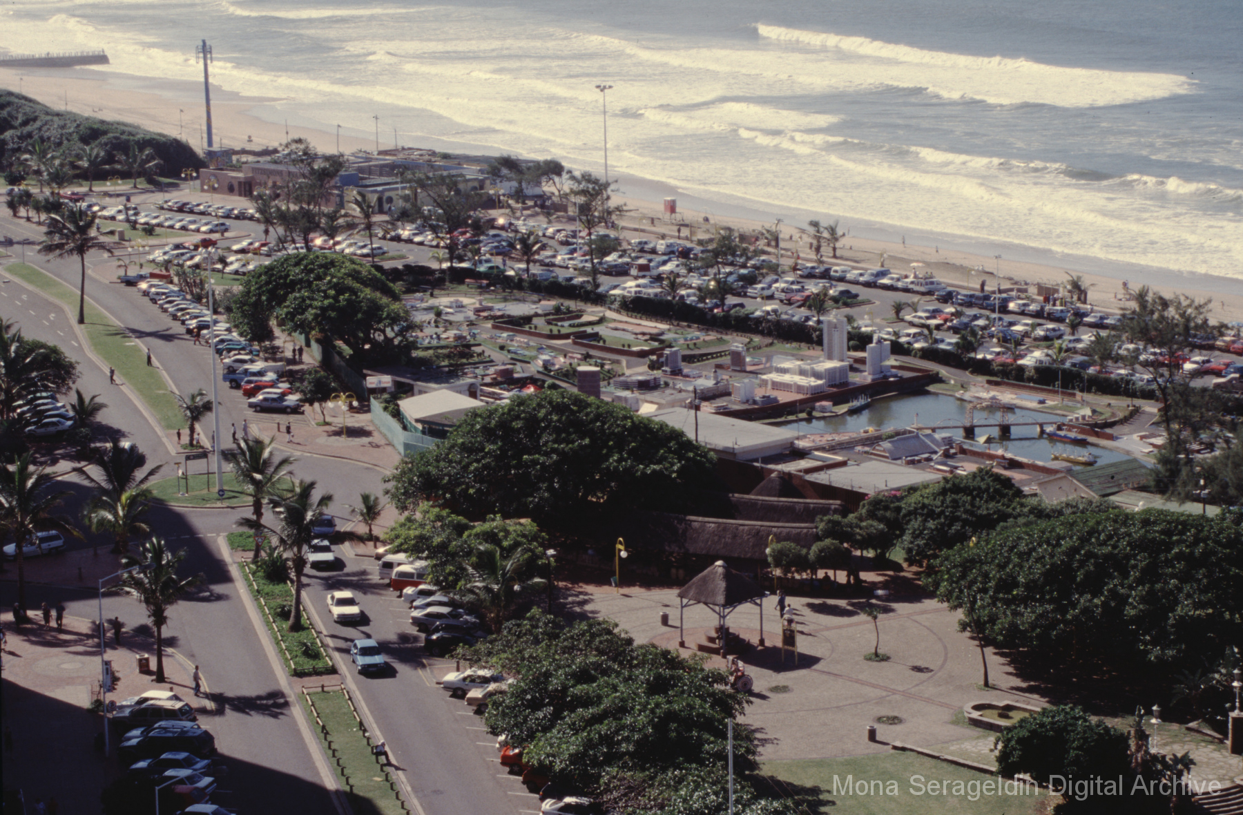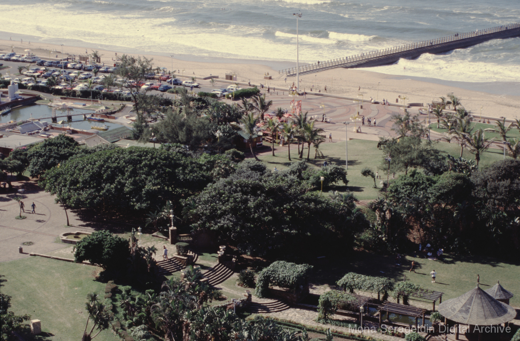 Photographs of the coastal city of Durban in the province of KwaZulu-Natal in South Africa from 1998-2000 and 2002. The gallery documents the waterfront region of the city and the metro area extension to the south, including views of old housing and new private housing developments. Images show aerial views of the region and resort beachfront, overviews of housing, roadways, and natural landscapes, and interiors of a new shopping mall.