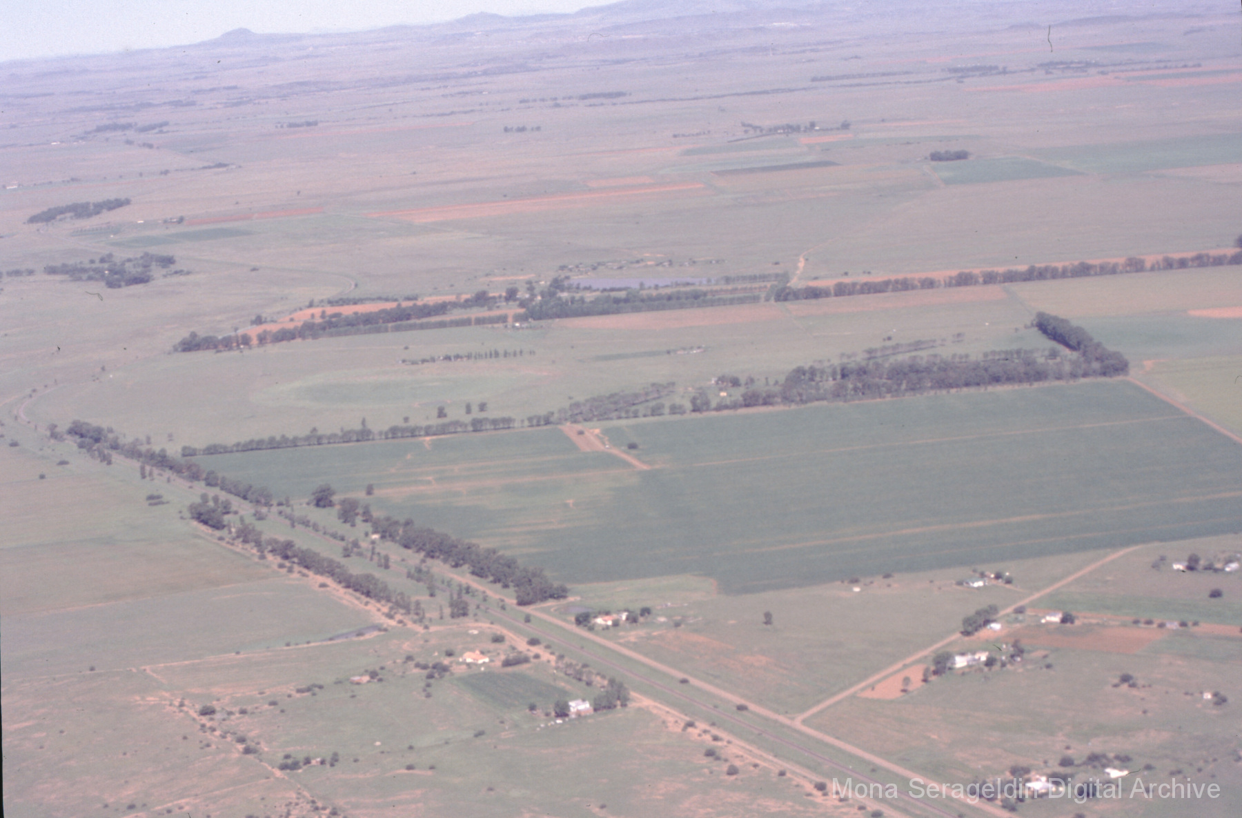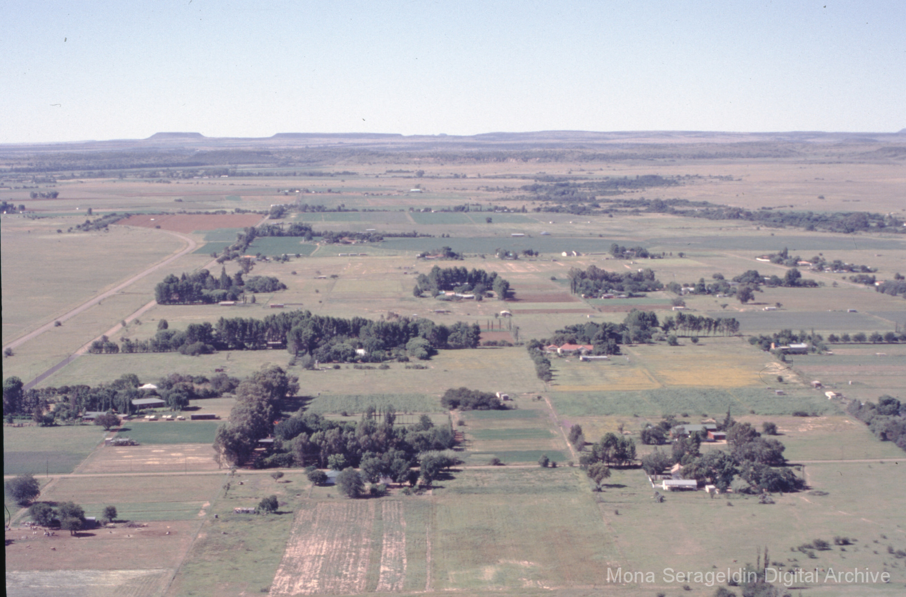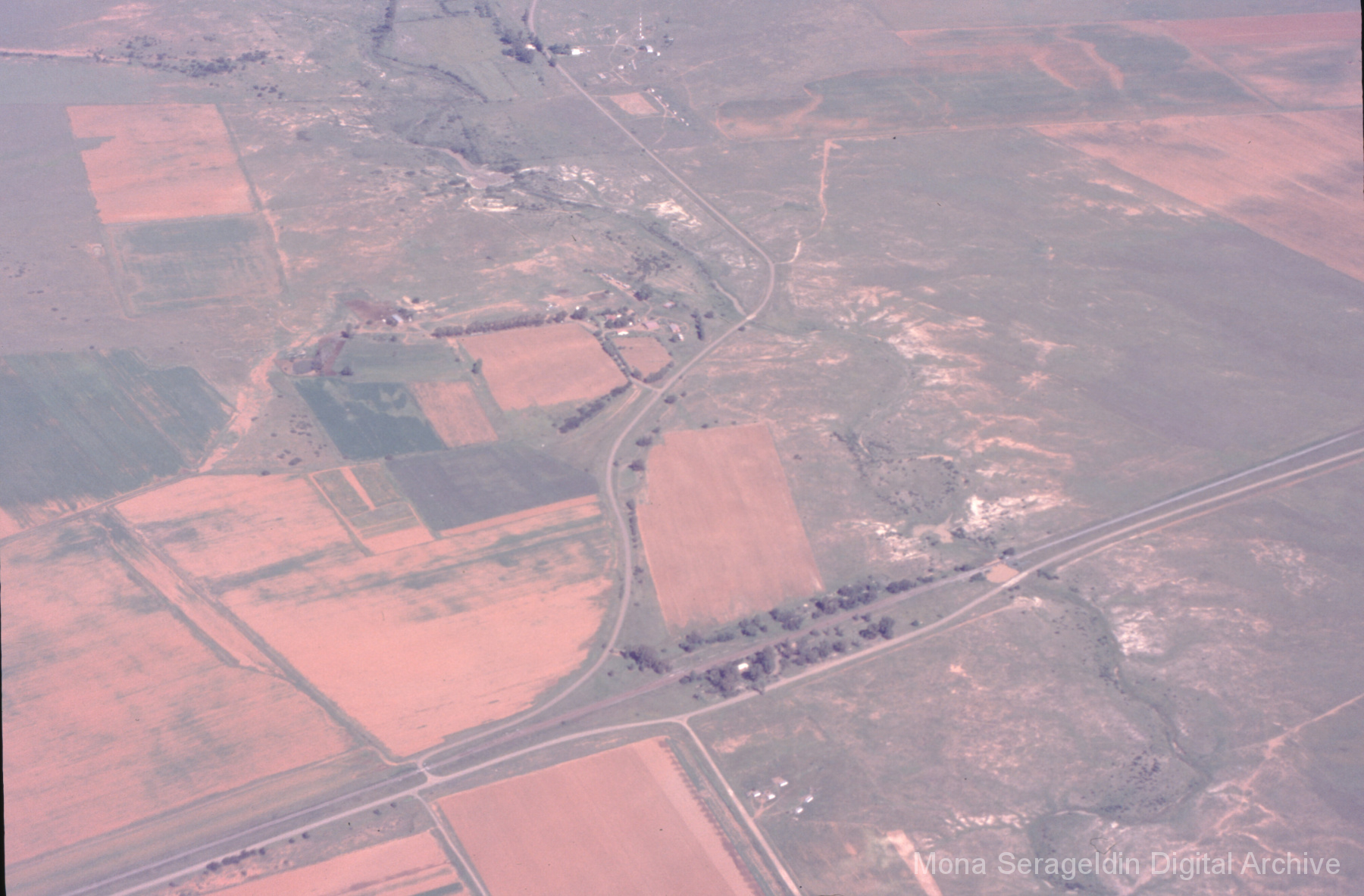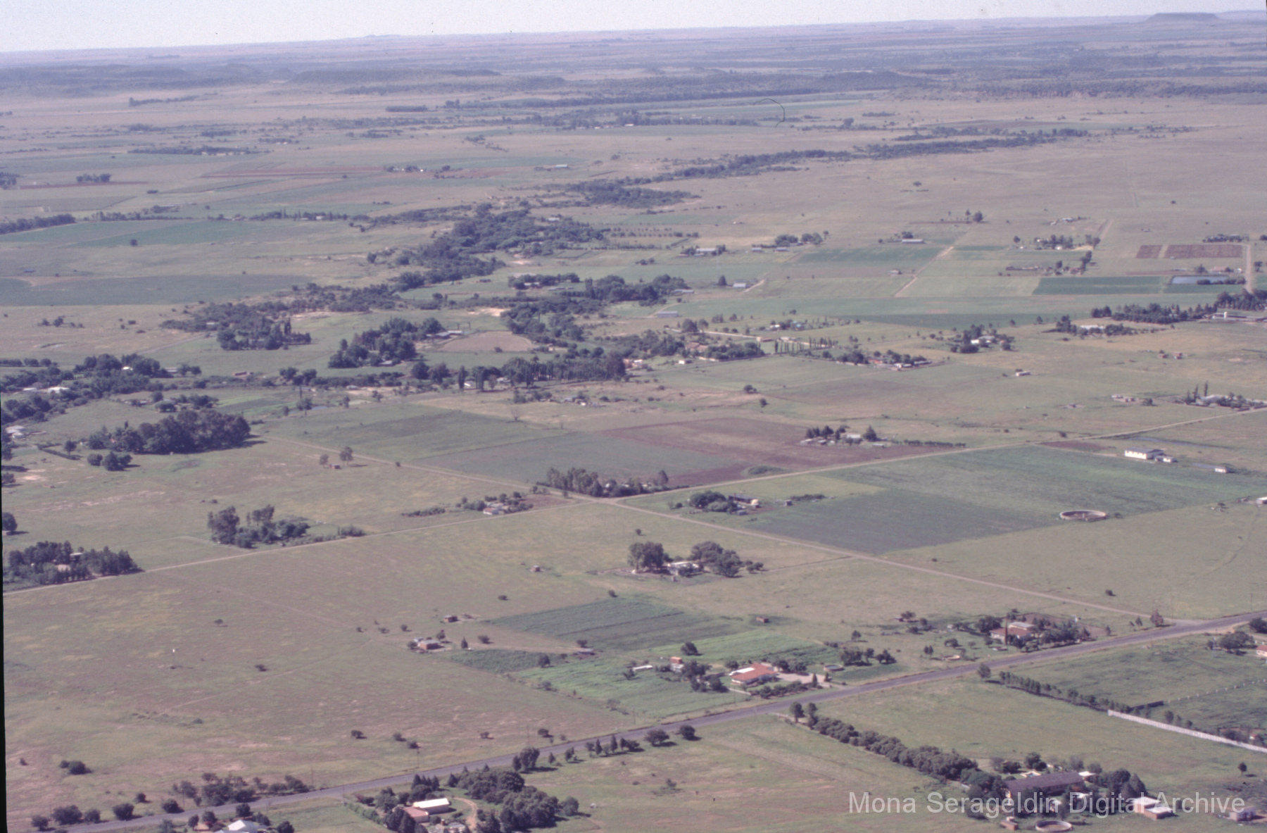 Photographs of agricultural and residential regions outside of the city of Bloemfontein in Free State, South Africa from February 2000. Photographs consist of aerial views from an airplane of land divisions of farmland, housing, and roadways, as well as rivers running through the area.
