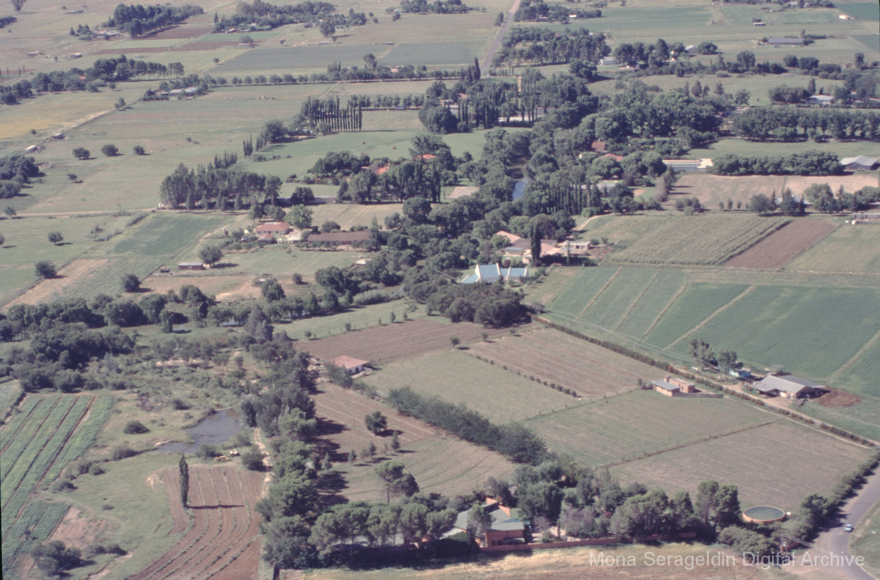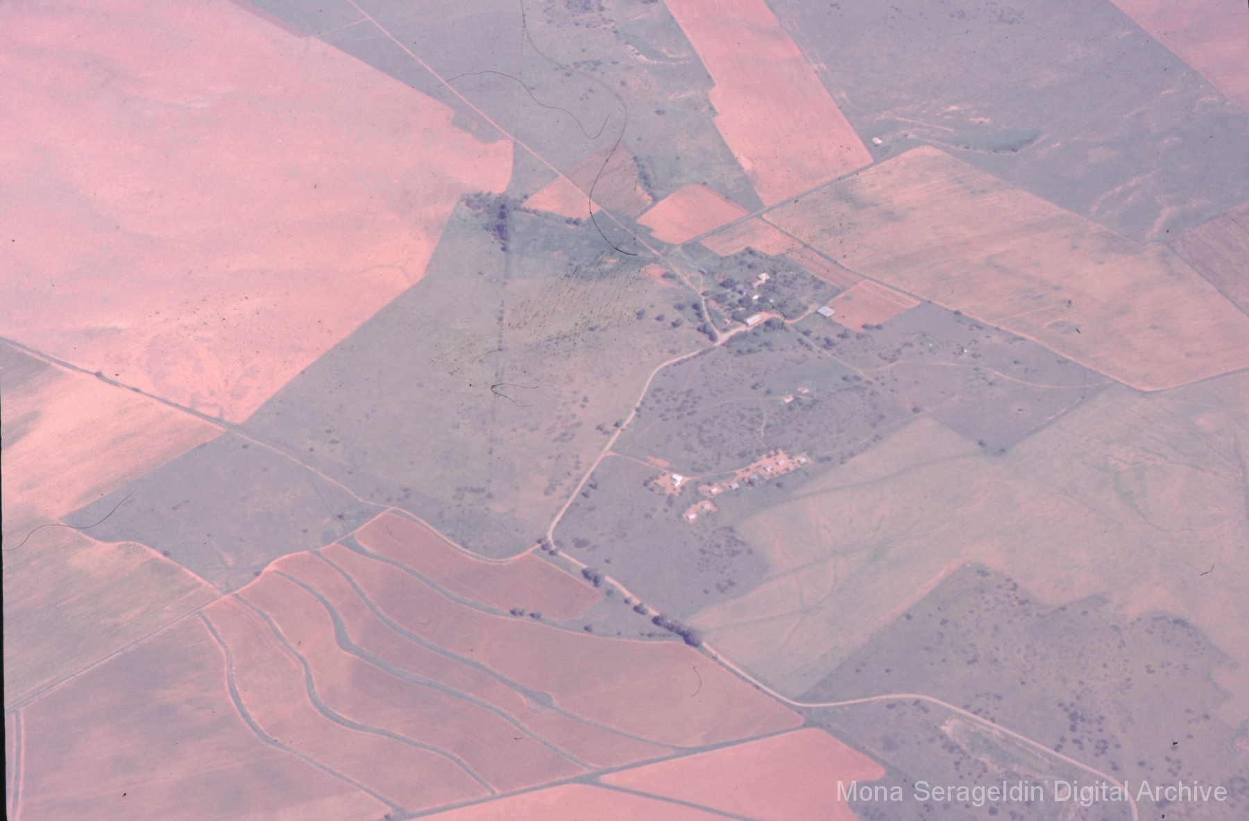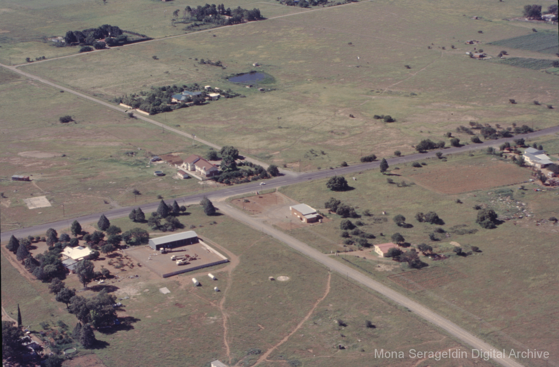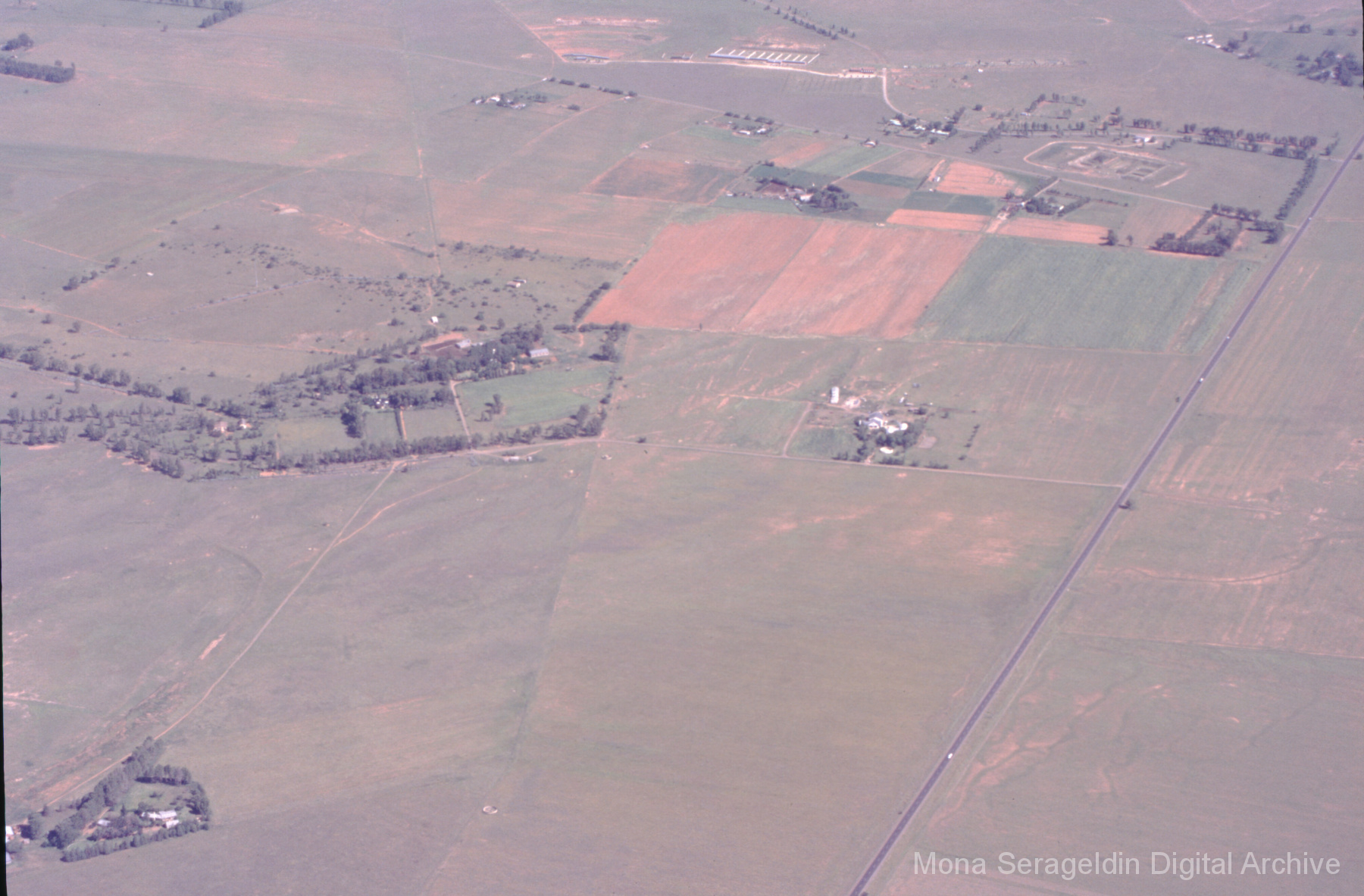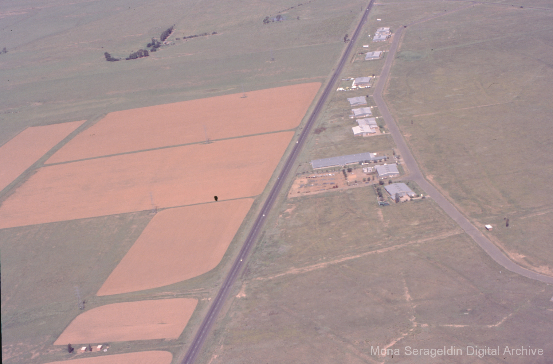 Photographs of agricultural and residential regions outside of the city of Bloemfontein in Free State, South Africa from February 2000. Photographs consist of aerial views from an airplane of land divisions of farmland, housing, and roadways, as well as rivers running through the area.