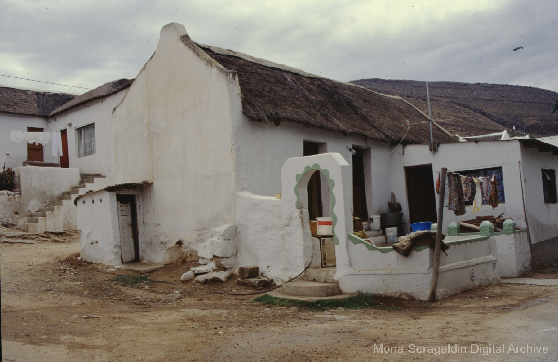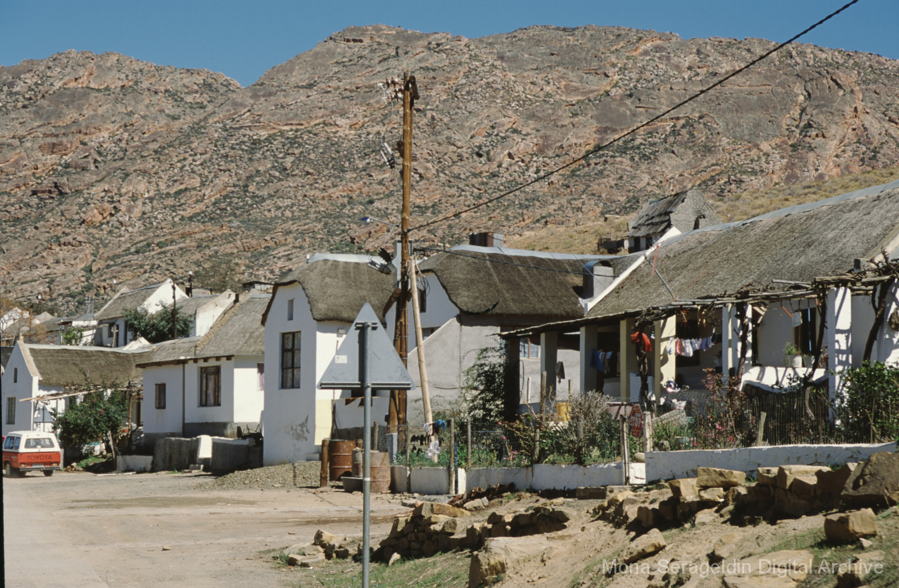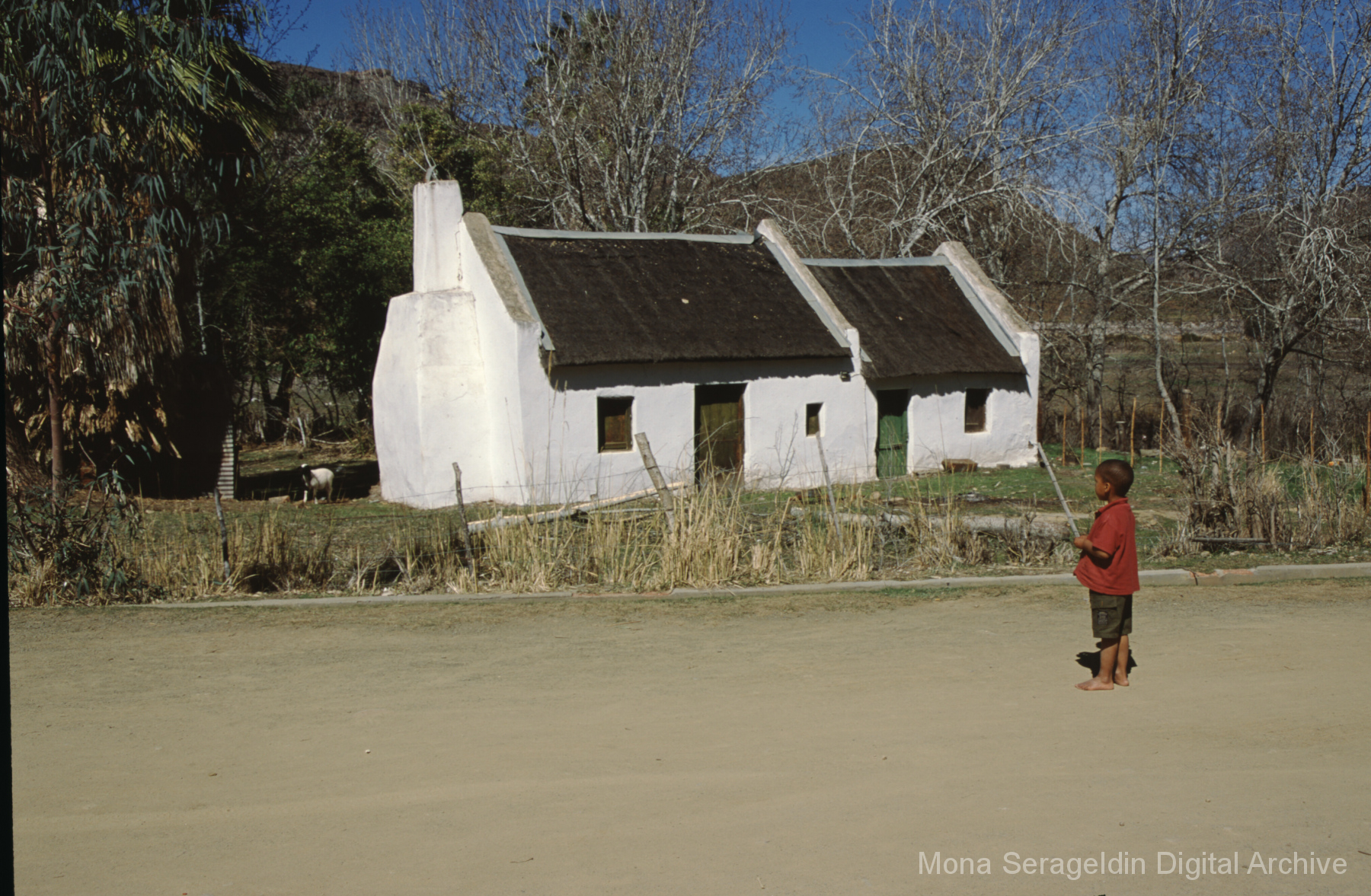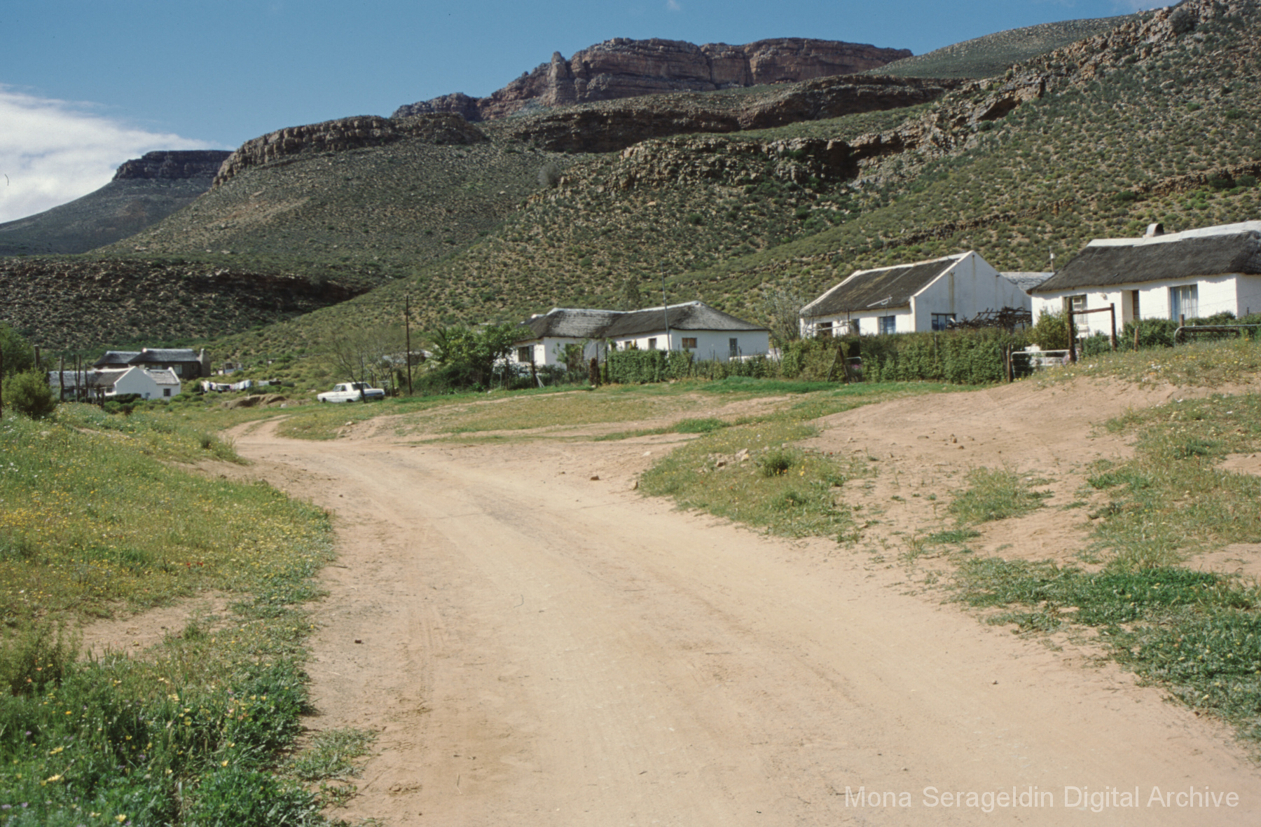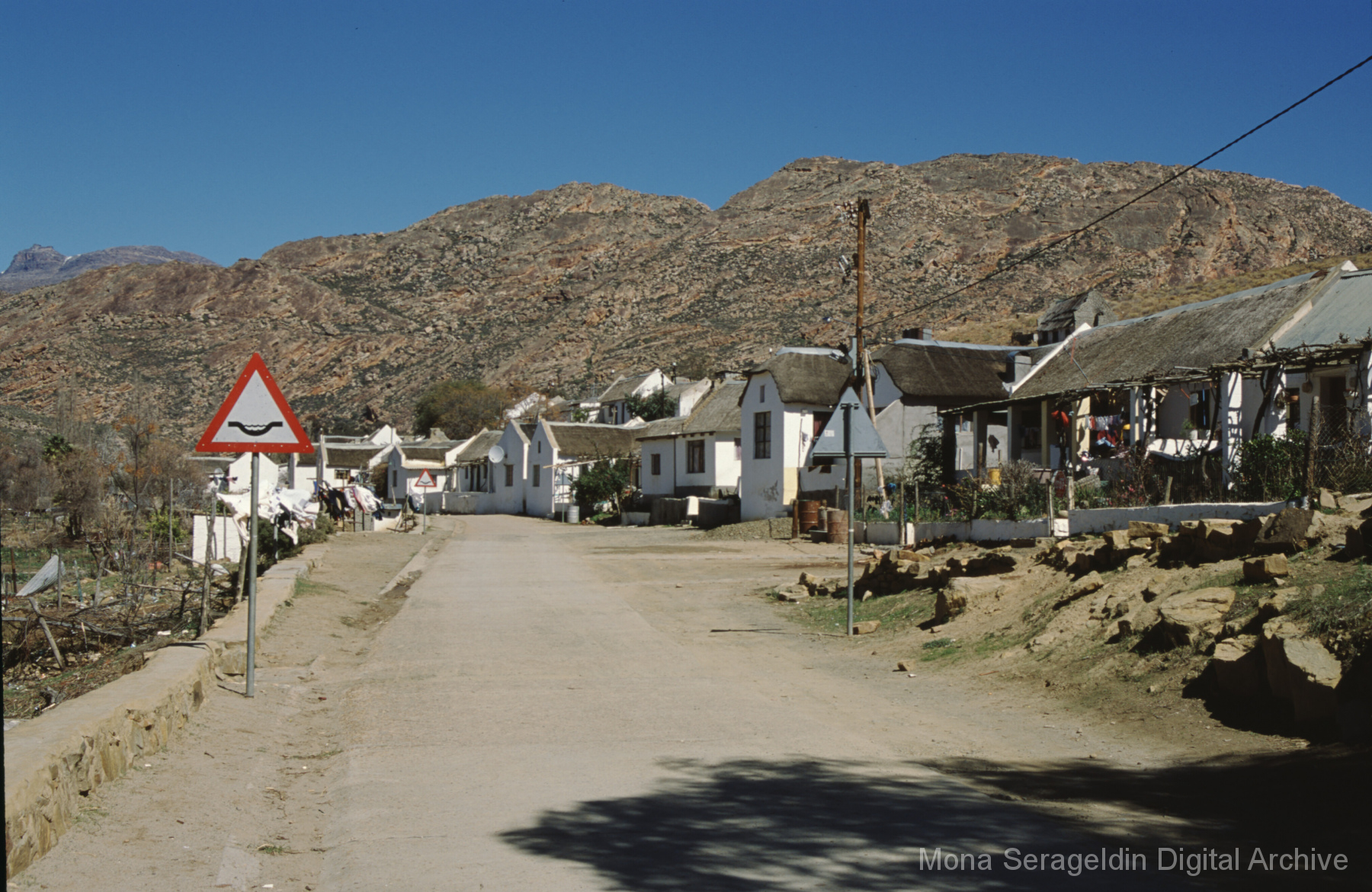 Photographs of the Western Cape province of South Africa from around 2000 through 2003. The gallery primarily covers housing projects around Stilbaai, Elim, and Cape Town, natural landsapes at Cape Agulhas and Kagga Kamma Nature Reserve, and historic housing in the town of Prince Albert. Images include views of landscape from roadways, portraits, and overviews of building exteriors, streets, and water infrastructure. Mona Serageldin is pictured.