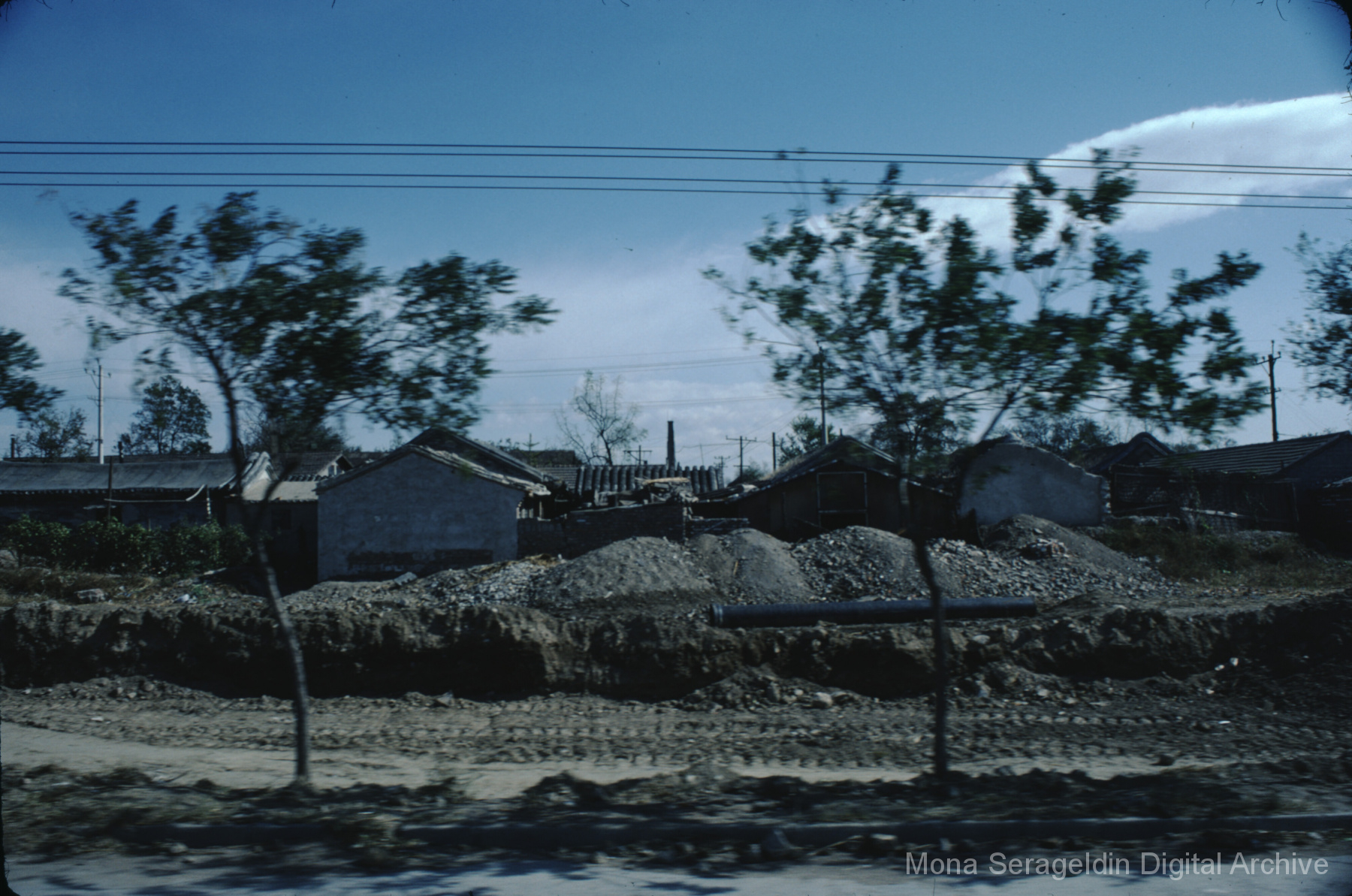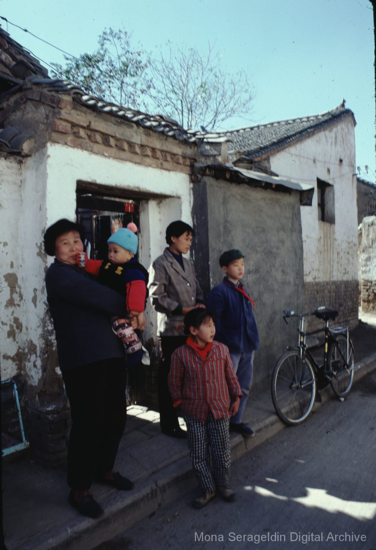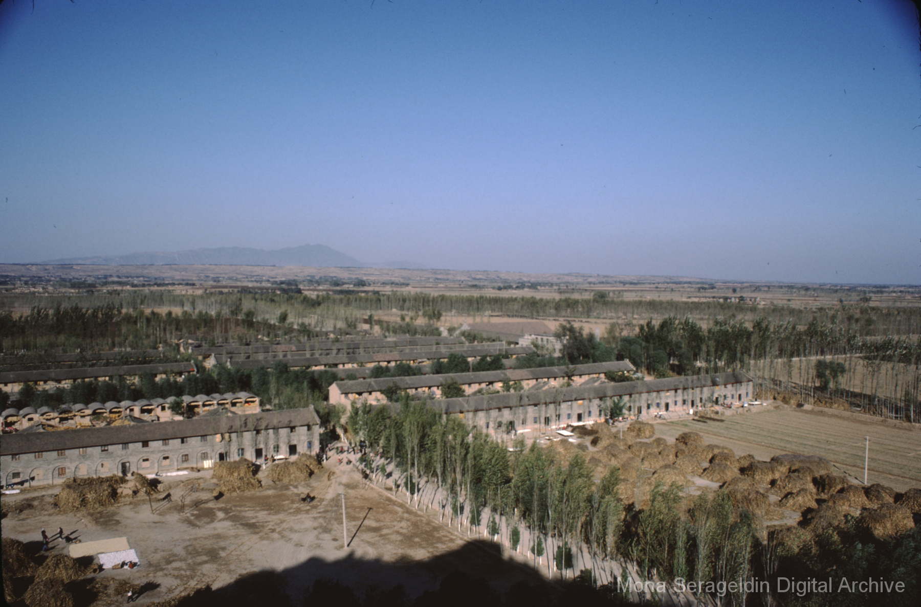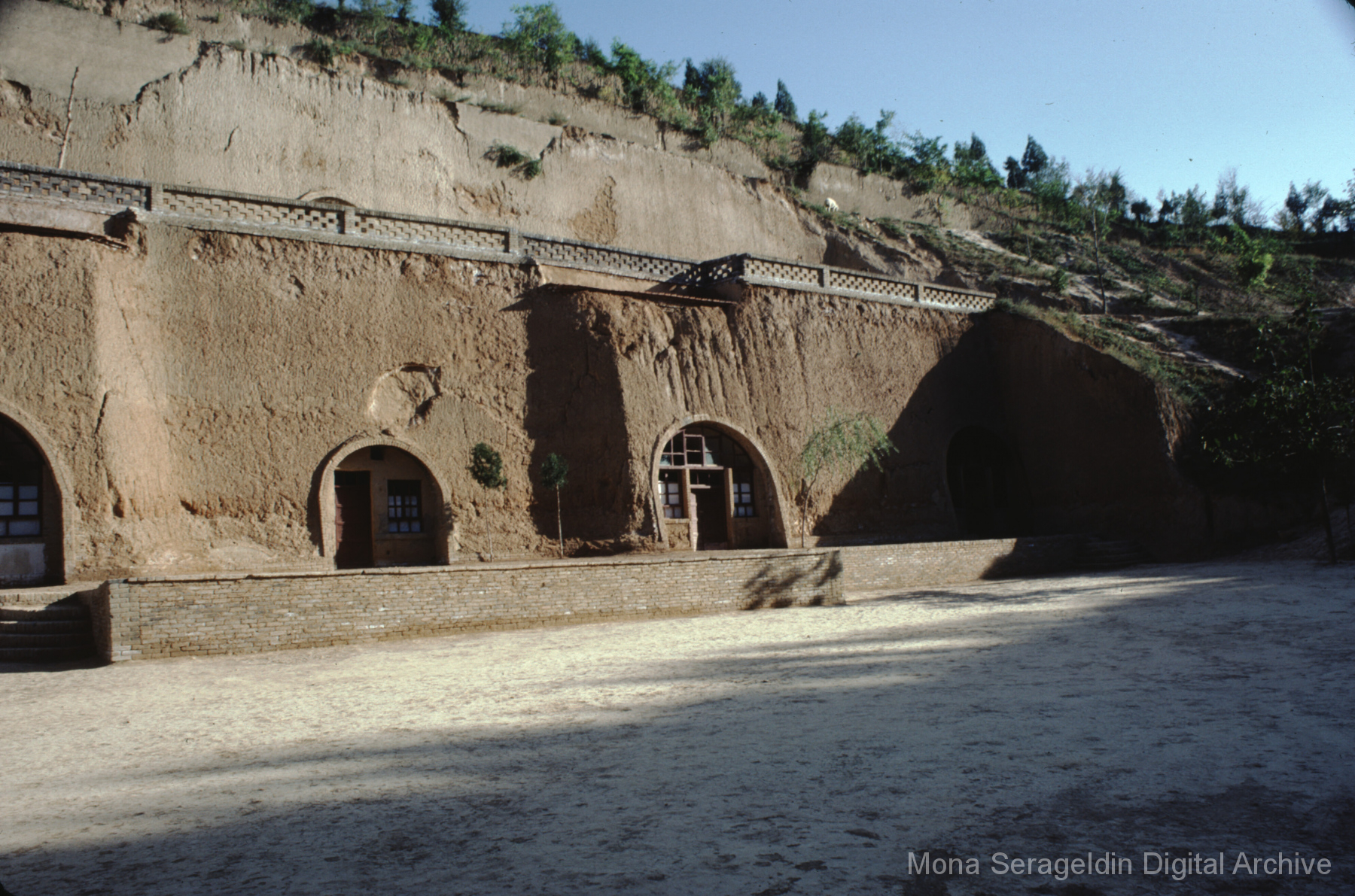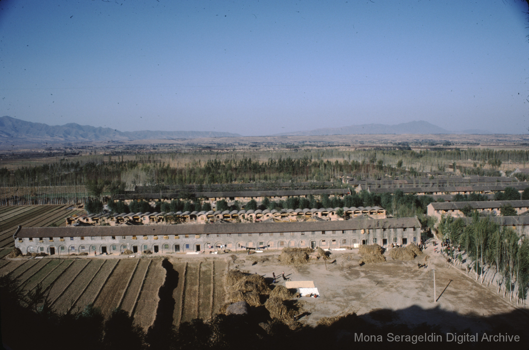 Photographs broadly of China from November 1981, including Beijing, Xi’an, and unspecified locations in northwestern Xinjiang. Images show views from a tour boat, portraits of Mona Serageldin and others, general residential and temple views, and aerial views. Two later sections cover cave dwellings, or farmers’ caves, including commune buildings, schools, and surrounding villages.