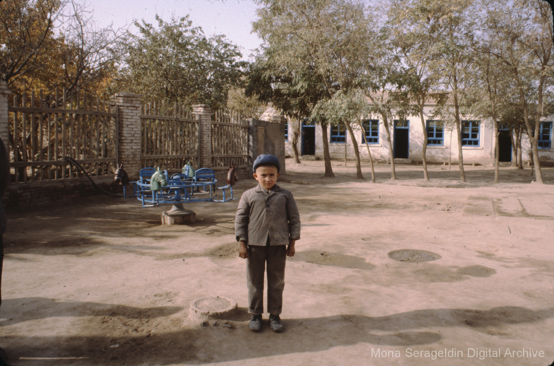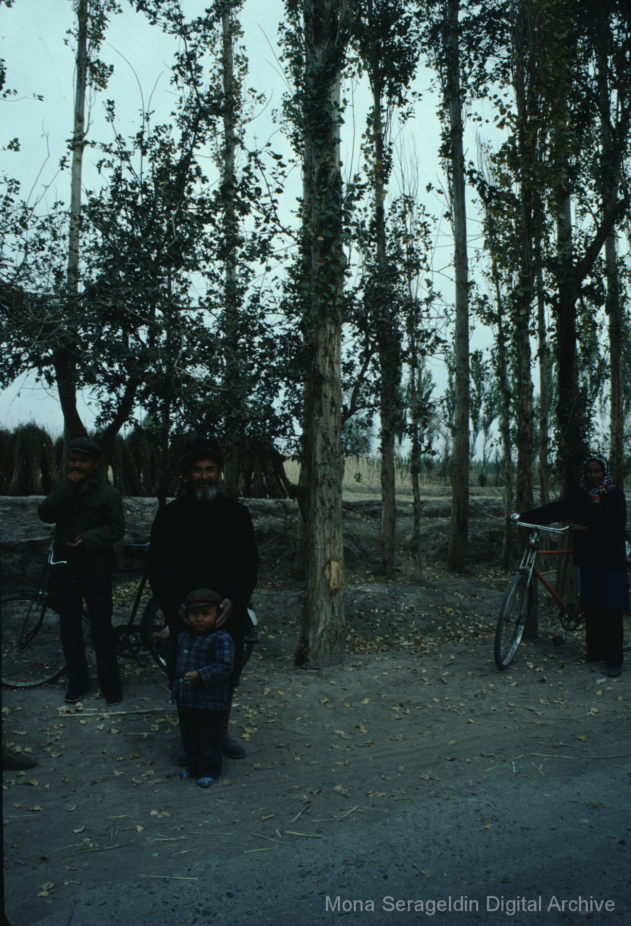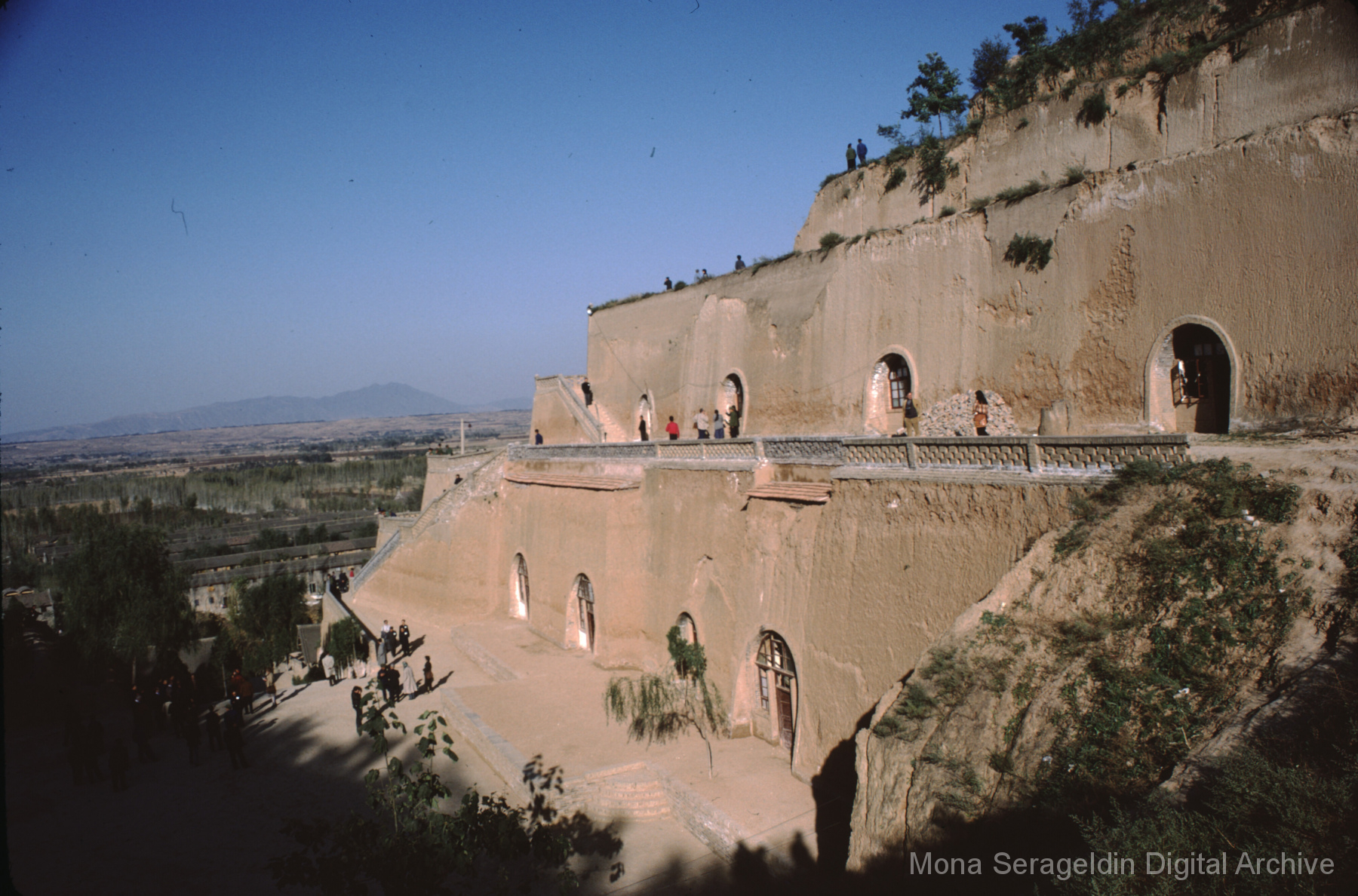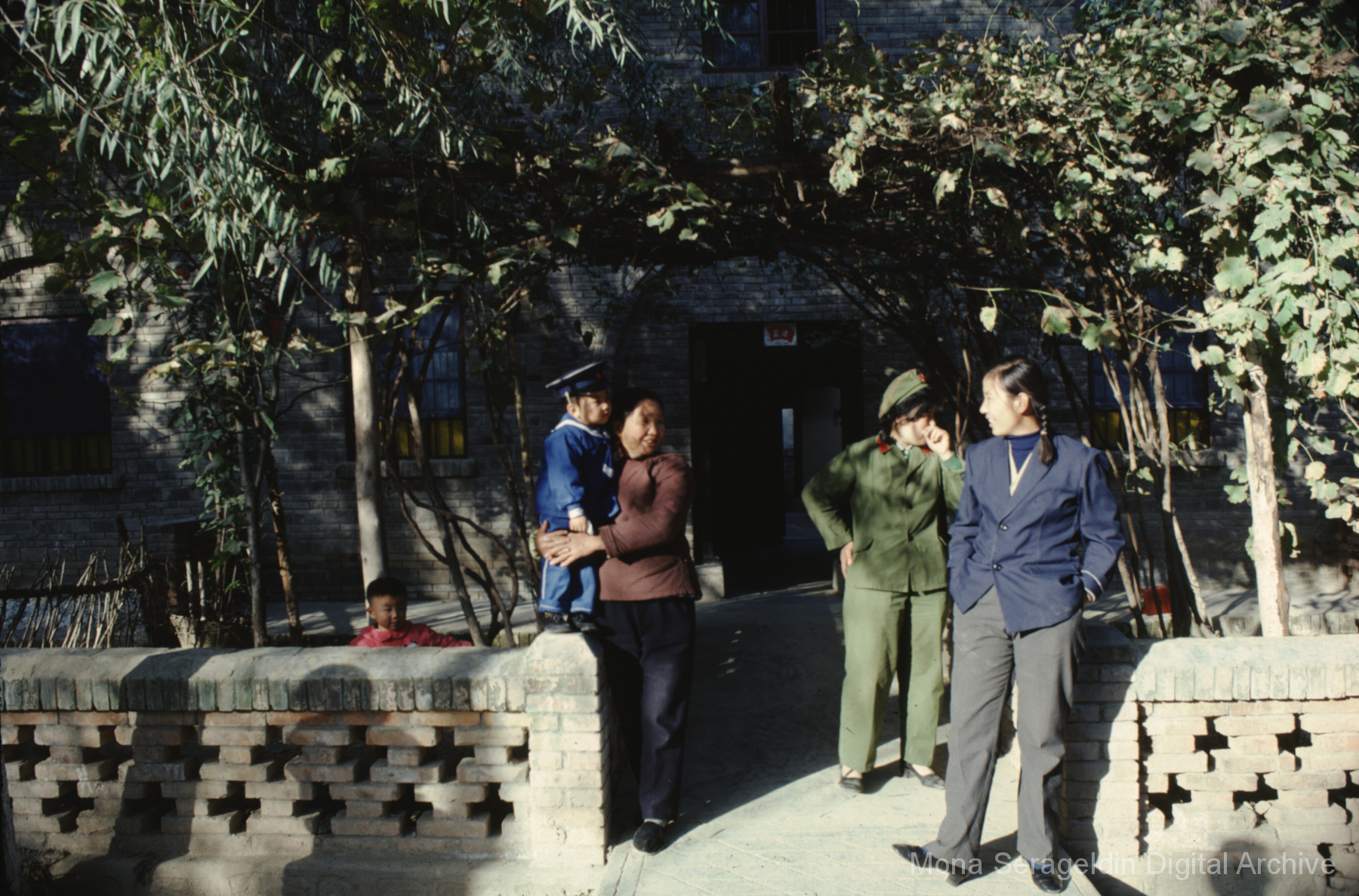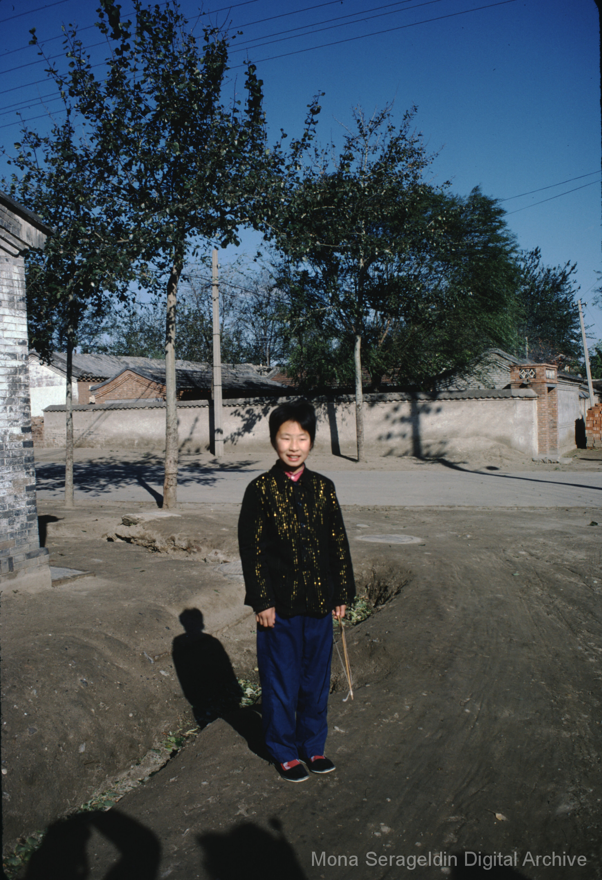 Photographs broadly of China from November 1981, including Beijing, Xi’an, and unspecified locations in northwestern Xinjiang. Images show views from a tour boat, portraits of Mona Serageldin and others, general residential and temple views, and aerial views. Two later sections cover cave dwellings, or farmers’ caves, including commune buildings, schools, and surrounding villages.